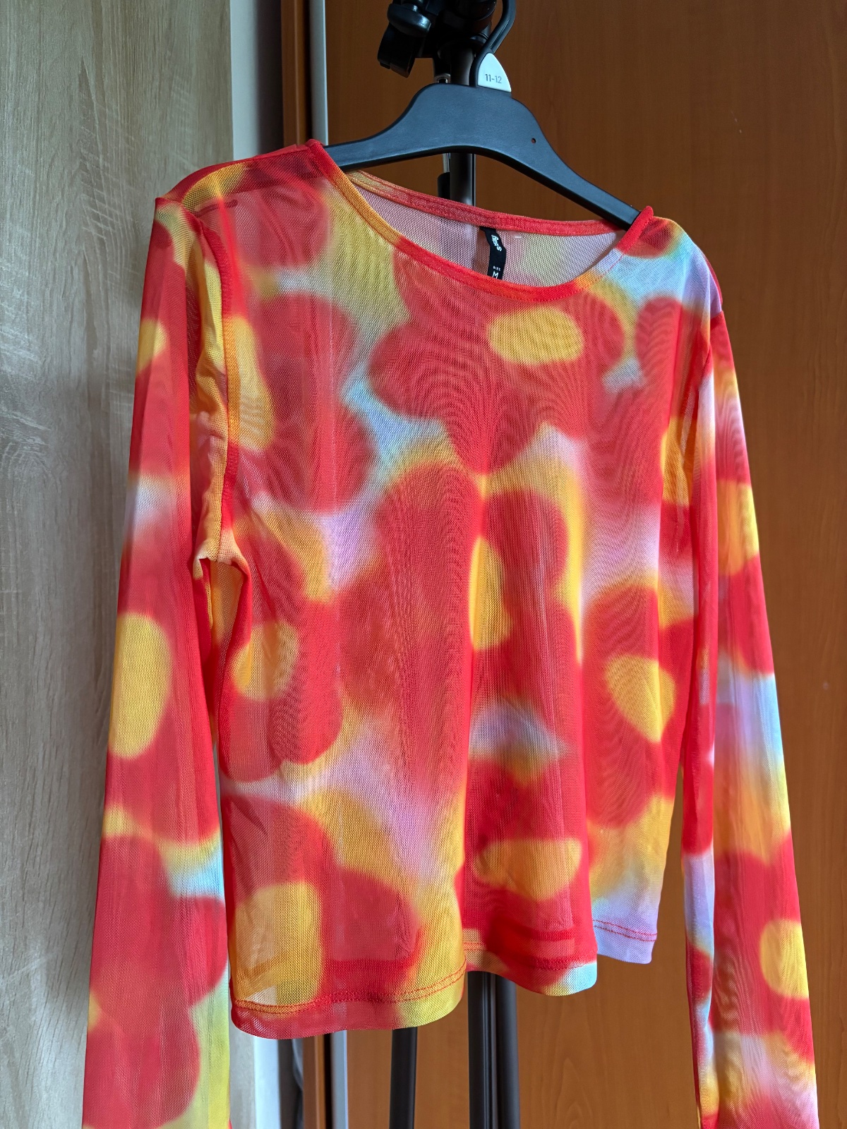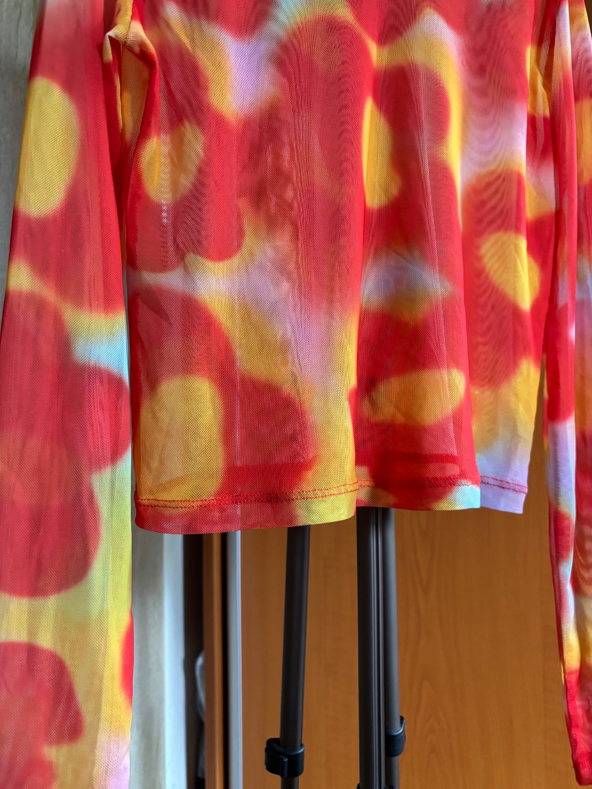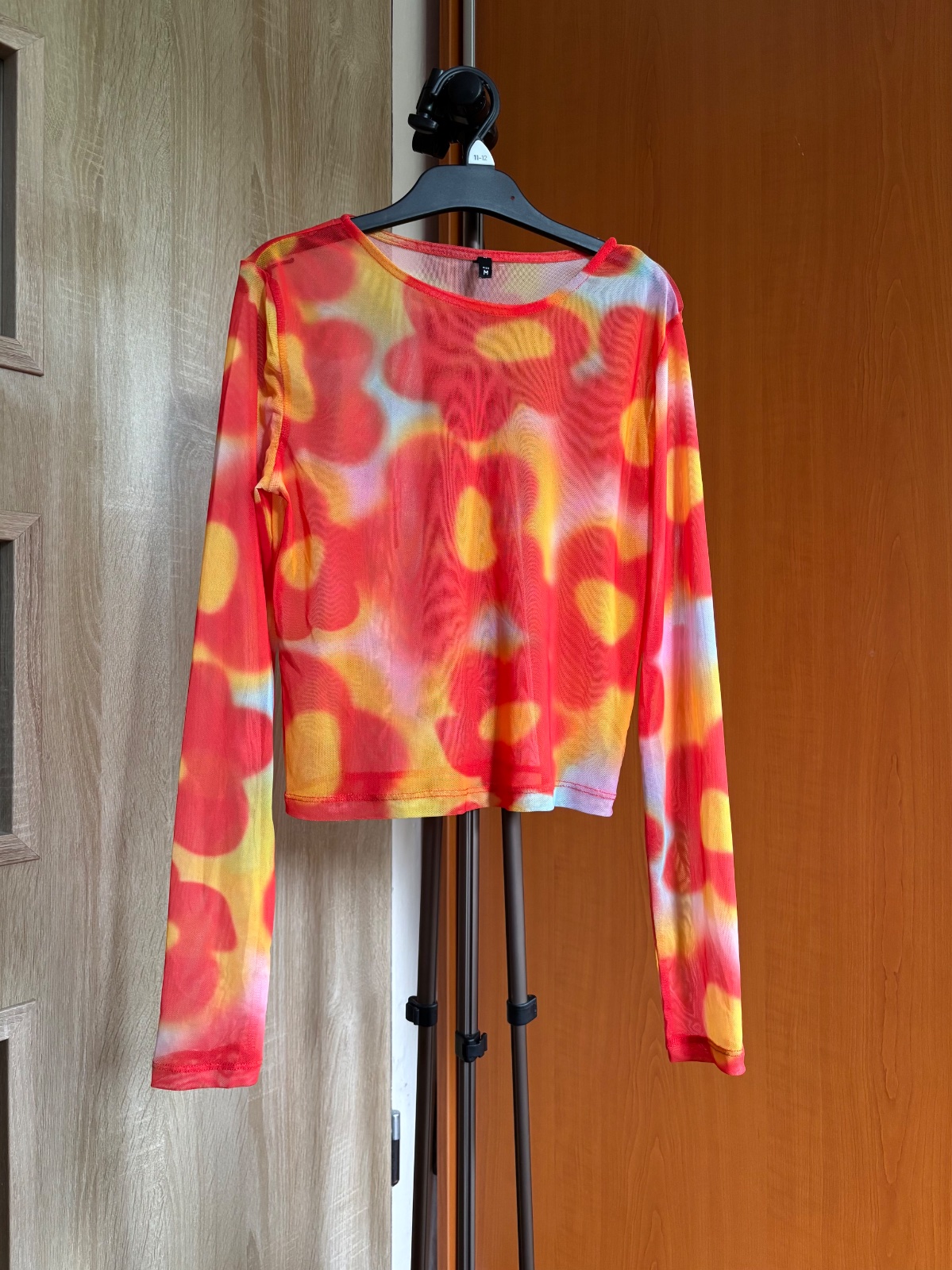 Oranžové sieťované tričko / crop top s dlhými rukávmi, motív kvetov. Výborný stav, takmer nenosené. Veľkosť M.