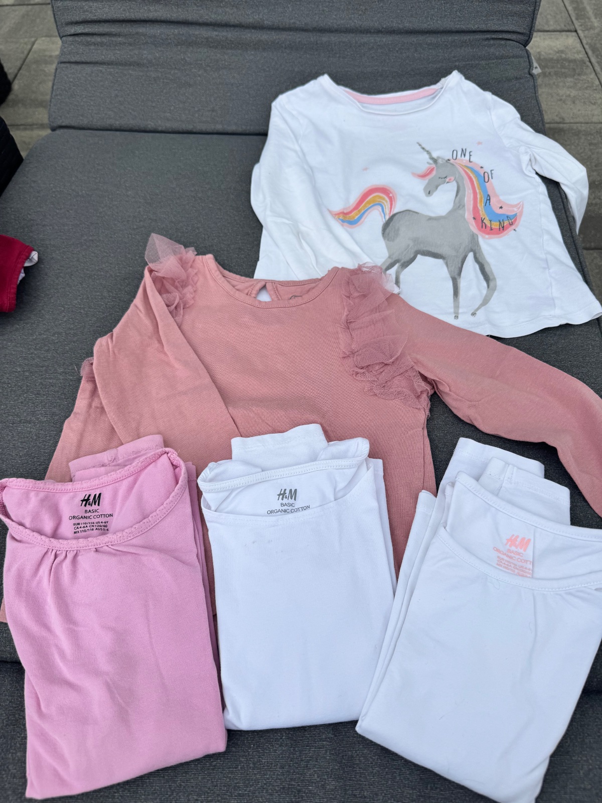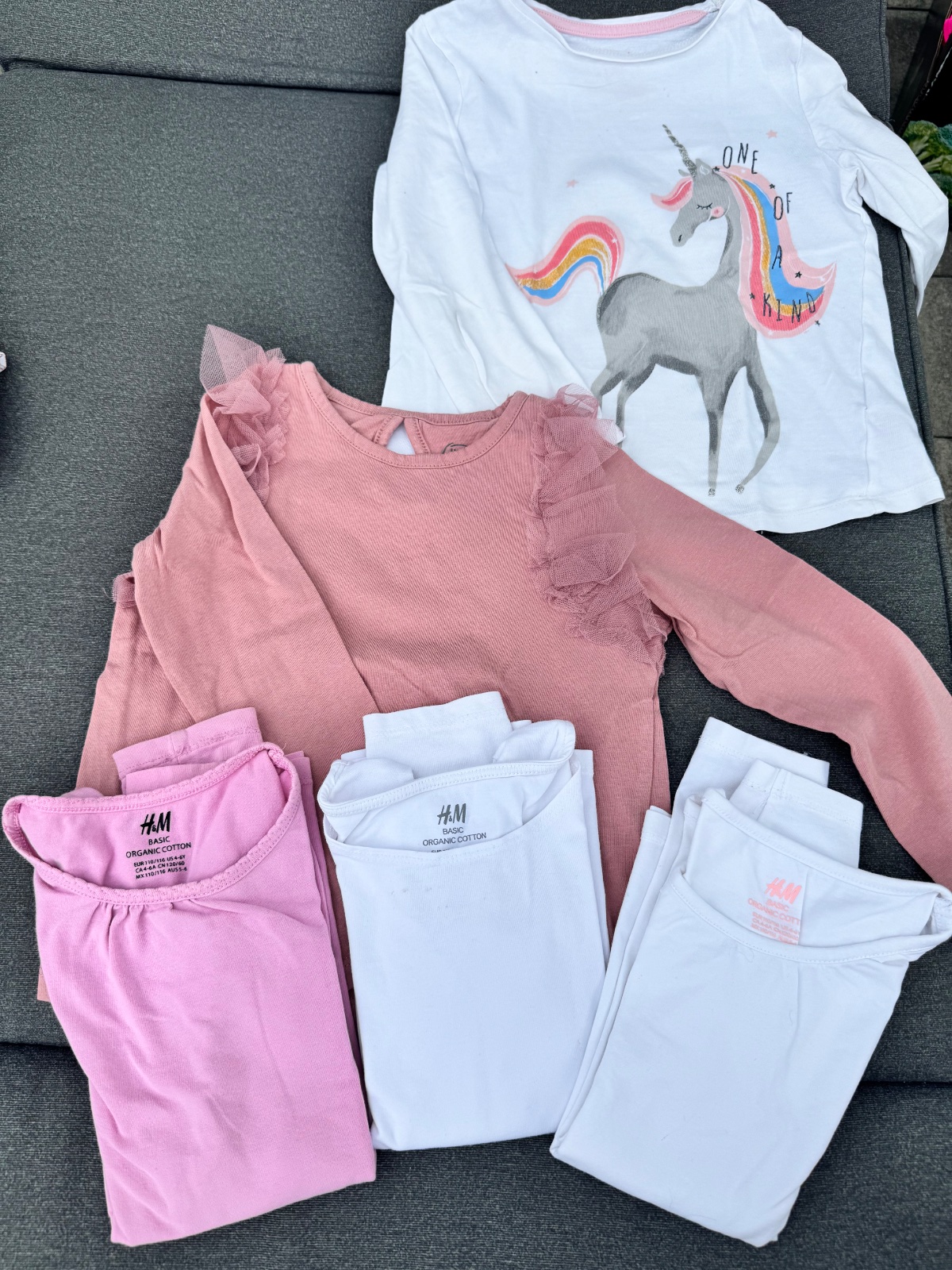 Predám trička. Basic značky H&M velkost 110/116. Ružové s cipkovu velkost 110. Biele s jednorožcom, velkost 110.