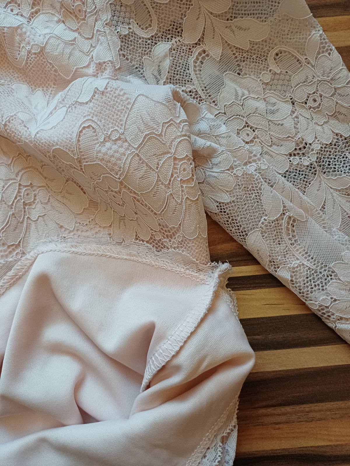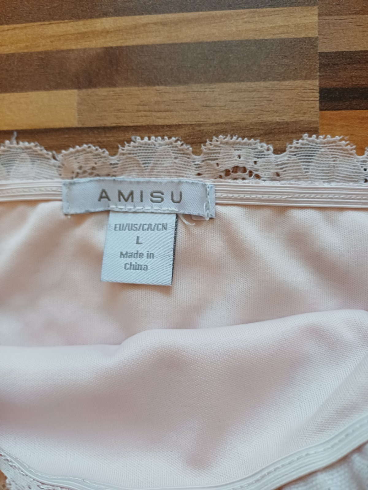Tričko zn. Amisu, veľ. L (sedí aj na M). Bledoružové, čipkované (podšité, iba rukávy presvitajú), elastické, lodičkový výstrih. Na bežné nosenie aj na príležitosť. Rozmery: dĺžka od ramena po spodný okraj 52 cm, šírka cez prsia 40 cm, dĺžka rukáva 39 cm.