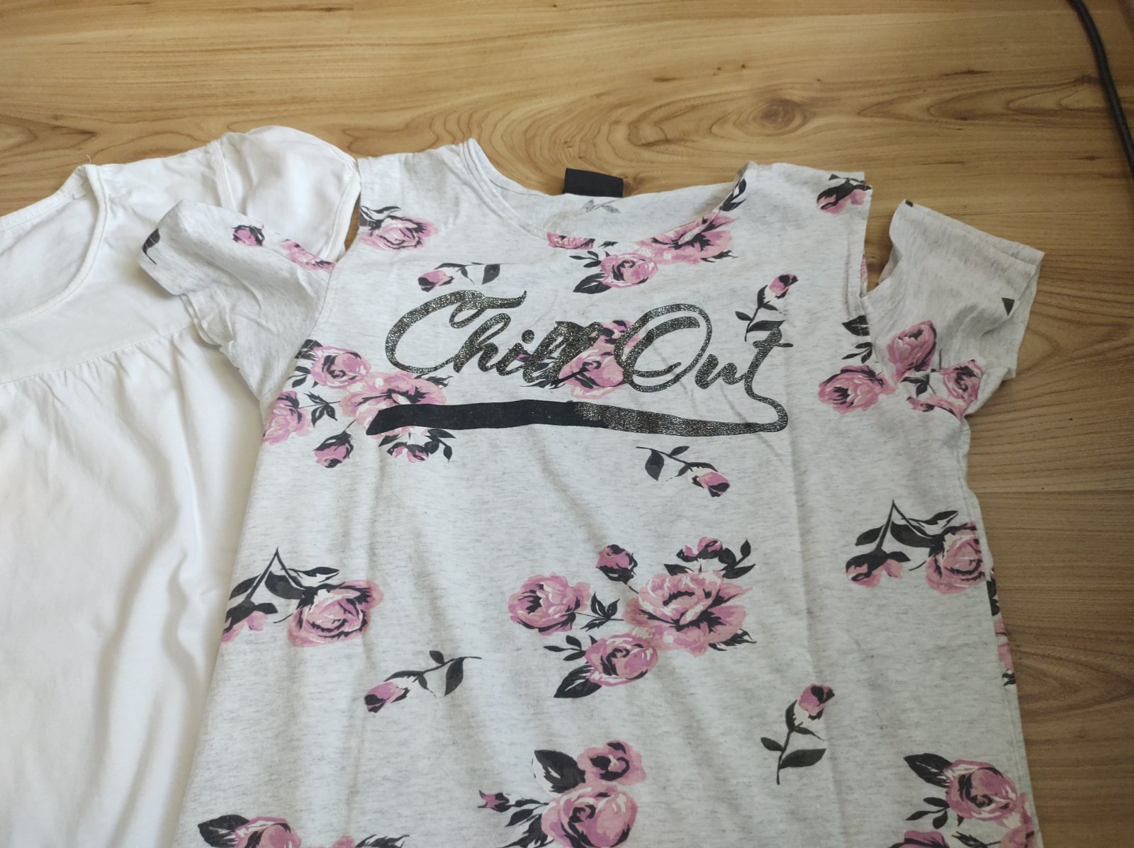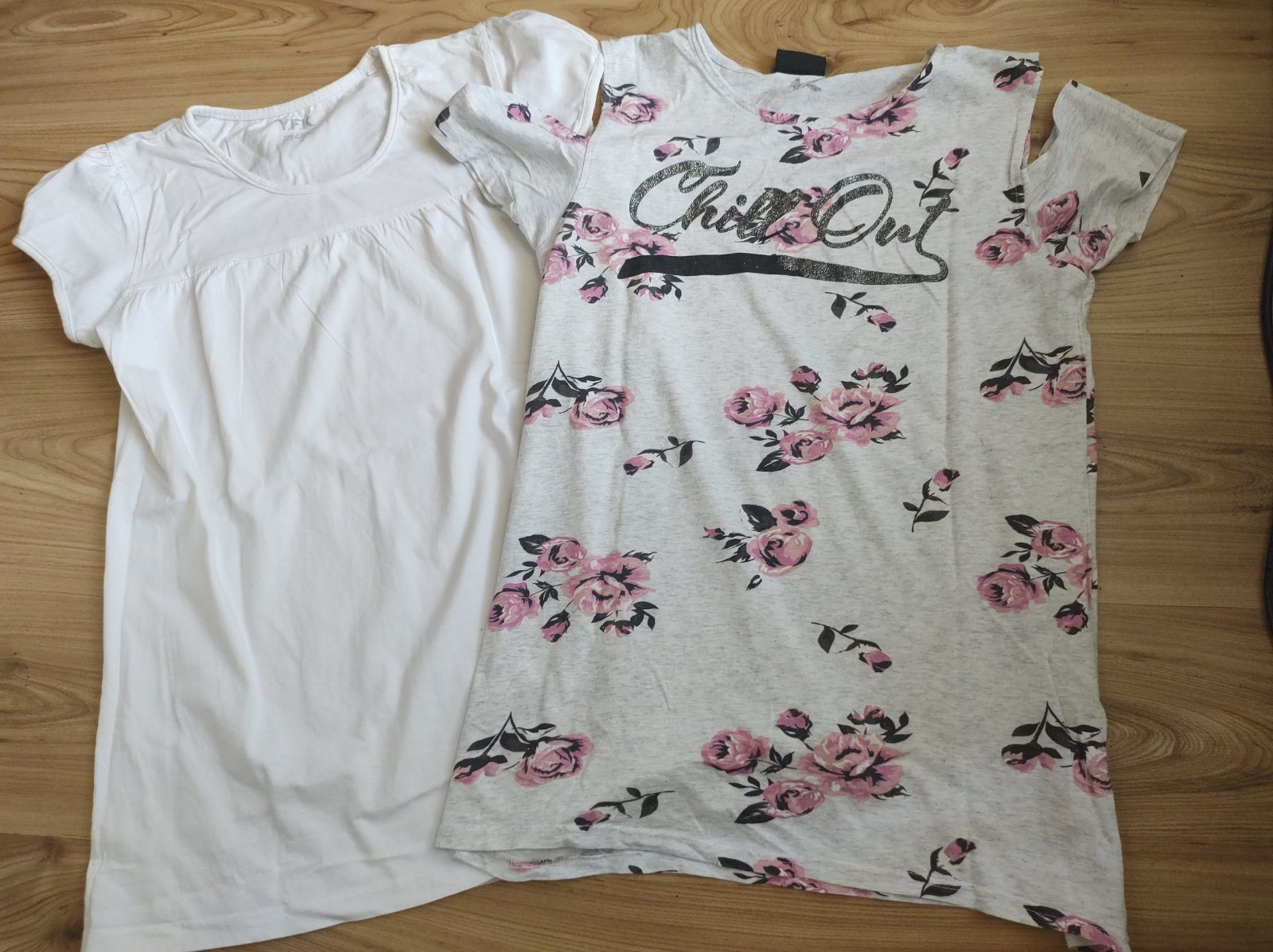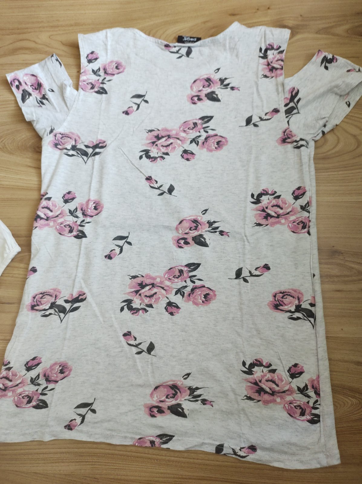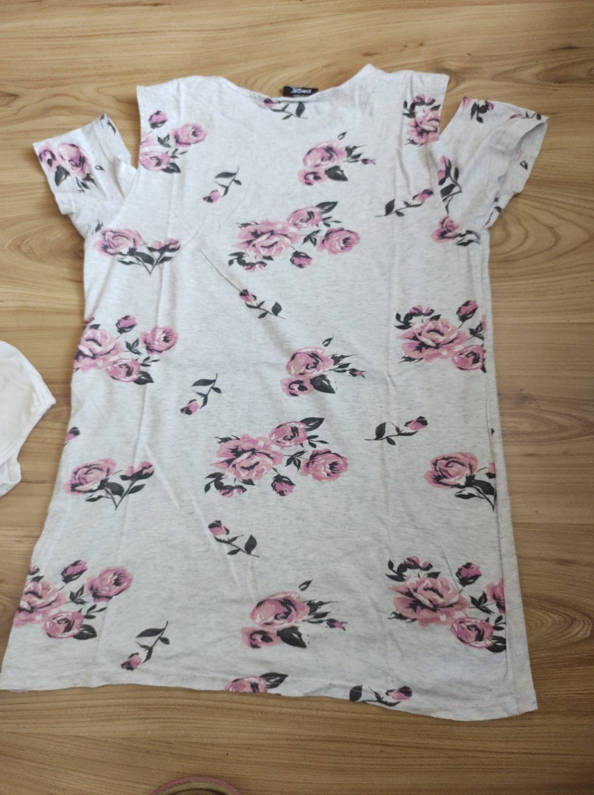 Kvetované tričko má na pleciach prestrihy, vpredu sa odlepila čiara, viď. foto. 100% BA.