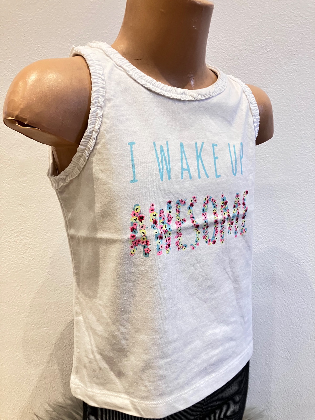 Dievčenský top bez rukávov s nápisom a fodričkami, elastické, veľkosť 98-104, materiál 100%bavlna.