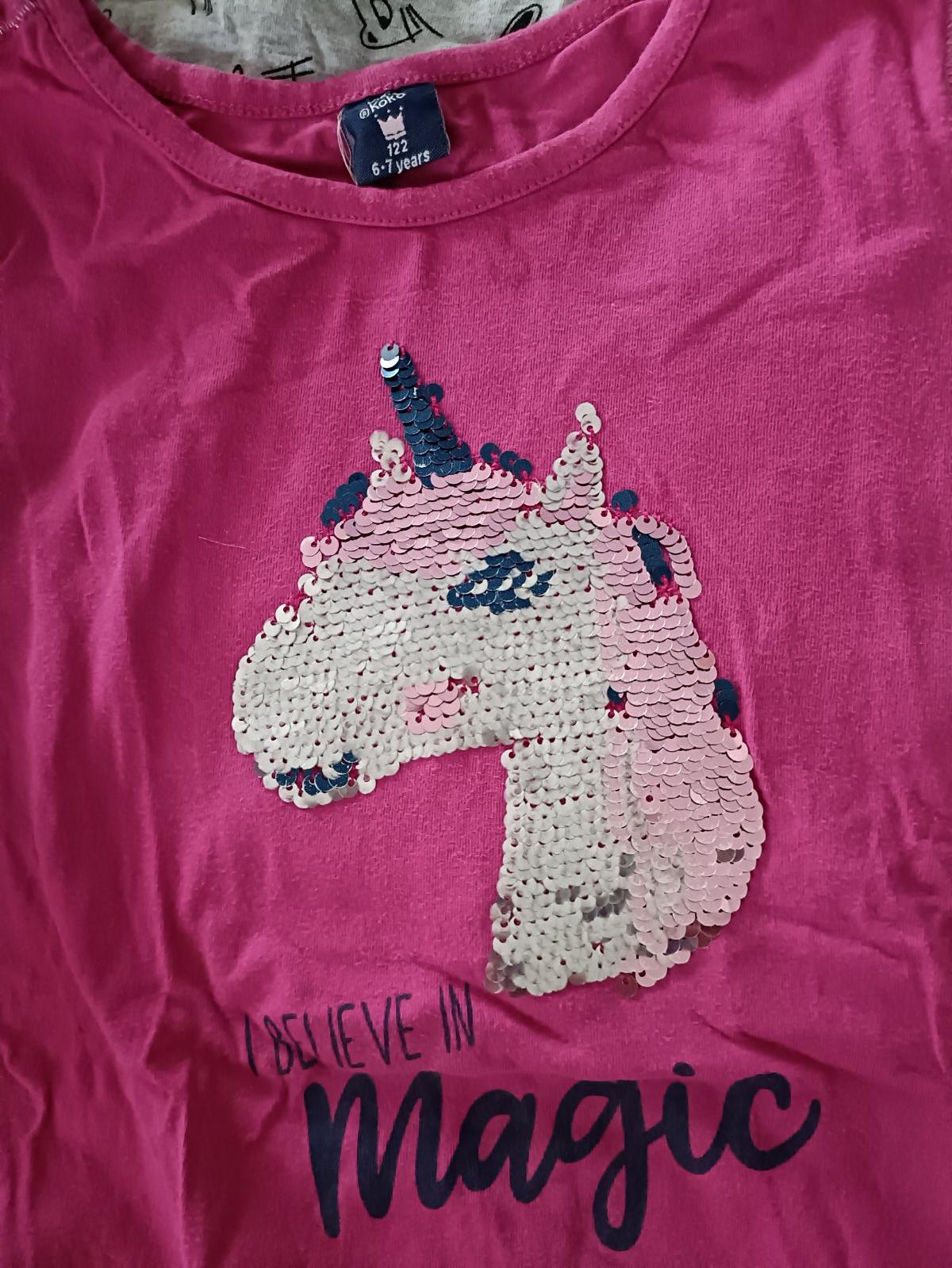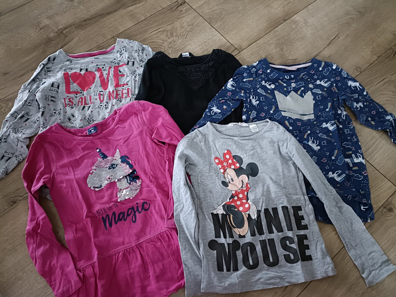 Sivé tričko s nápisom,čierne George ,modré s korunkou,sýto ružové s flitrovym jednorožcem,sivé Minnie HM,veľkosť 122,super stav,predaj spolu =8e