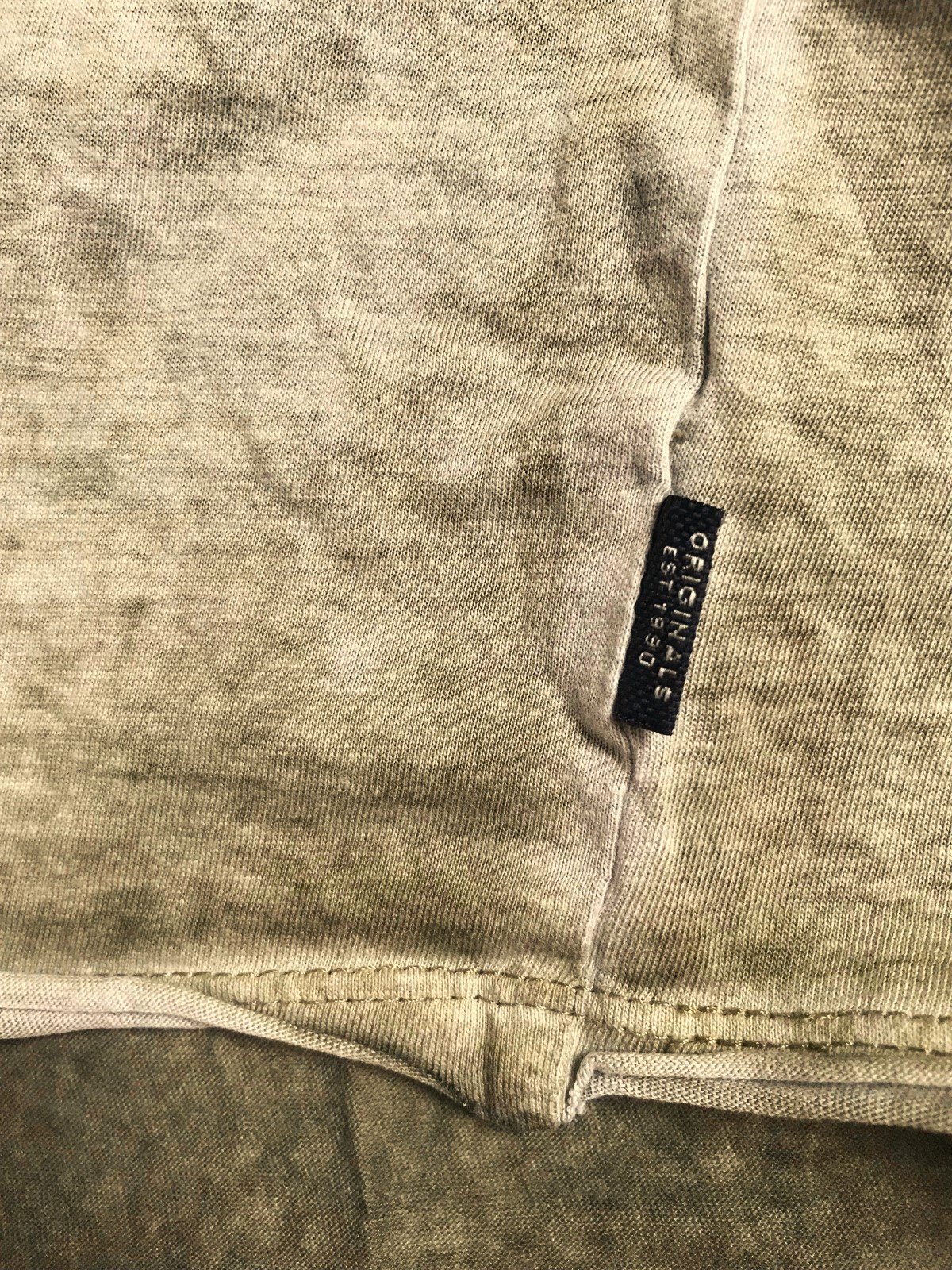 Kvalitné značkové bavlnené vintage tričko nejednoliatej spranej farby,farba - studený odtieň olivovo zelenej,značka vyfotená,dlžka 71 cm, šírka 50 x 2 cm,pod pazuchou cca 54/55 max.