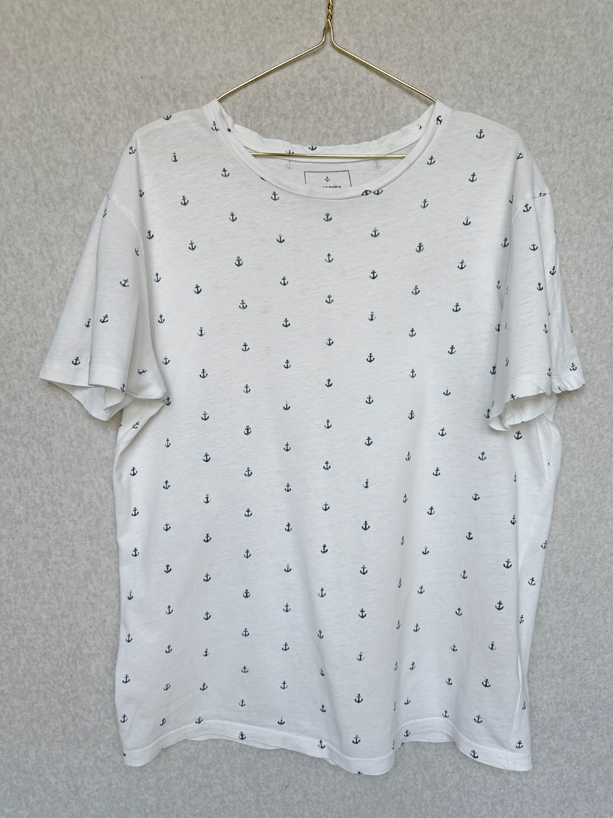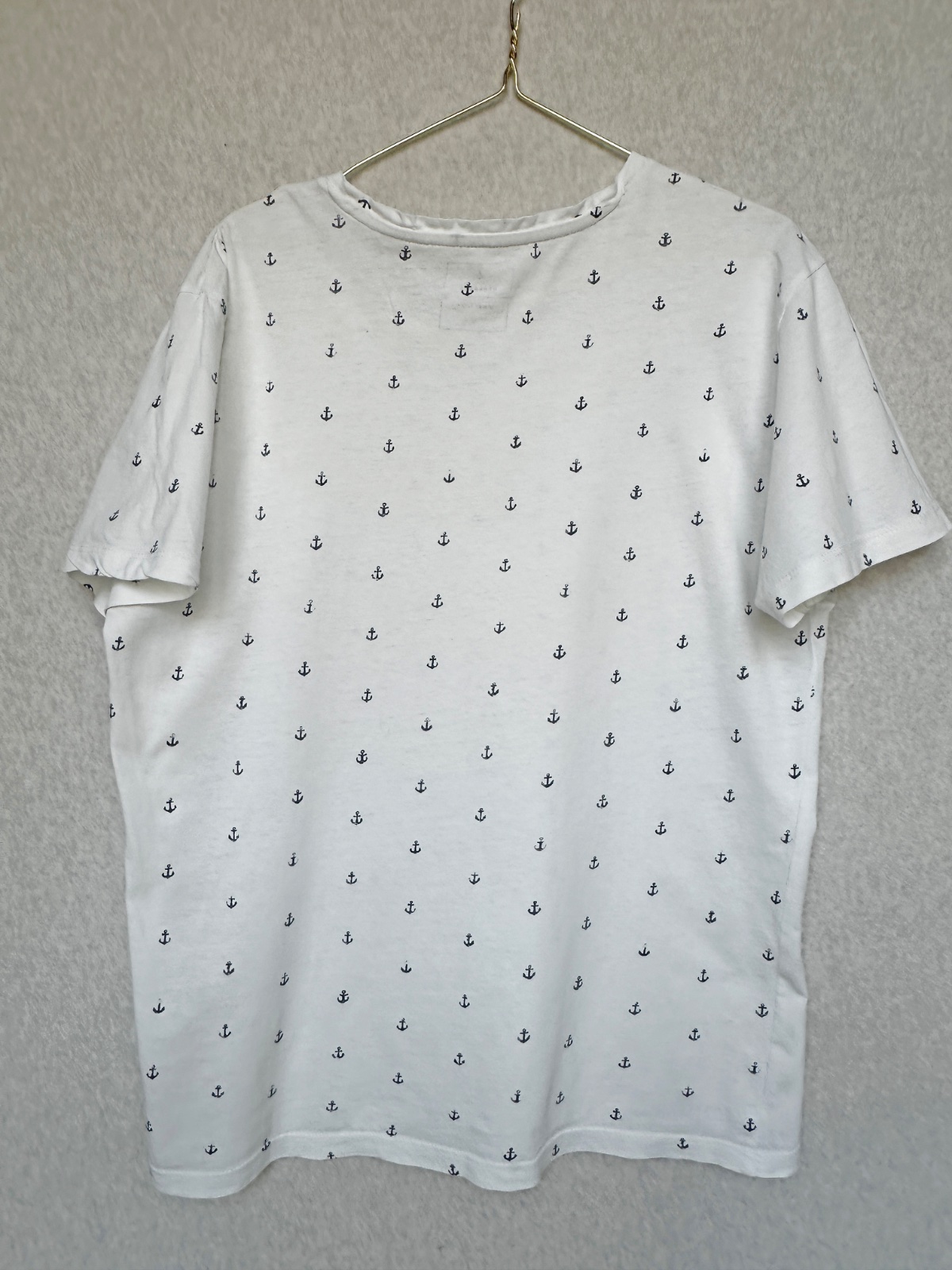 Klasické biele tričko zo vzdušného bavlneného úpletu s potlačou malých kotvičiek v tmavomodrej farbe. Vo veľmi peknom stave, bez poškodení. 100% bavlna. Pranie v pračke 30°C.