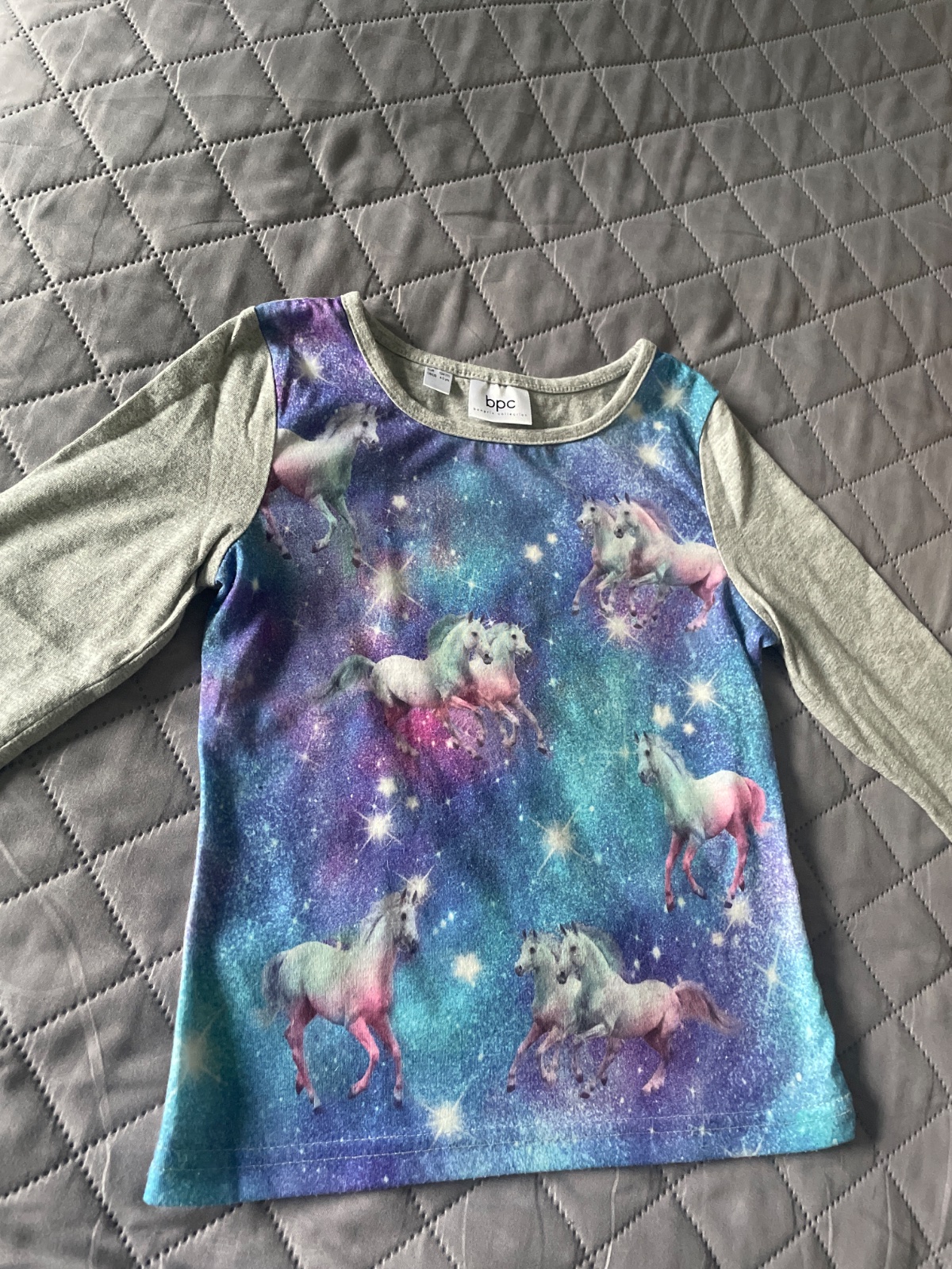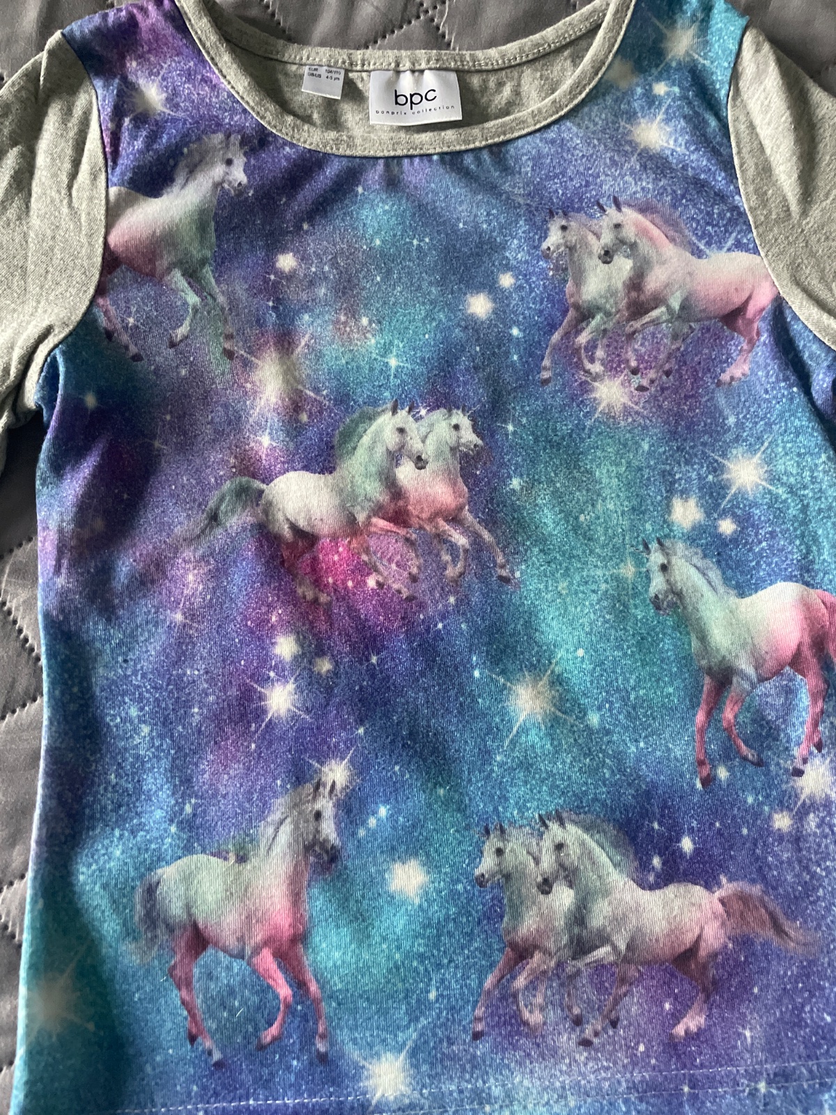 Svetlo.sivé tričko s dlhým rukávom s obrázkom mačičky Hello Kitty. Nosené, no nepoškodené, bez fľakov a dier. Nažehľovačka nepoškodená. Veľkosť uvedená na štítku: 104, resp. 3-4 roky.