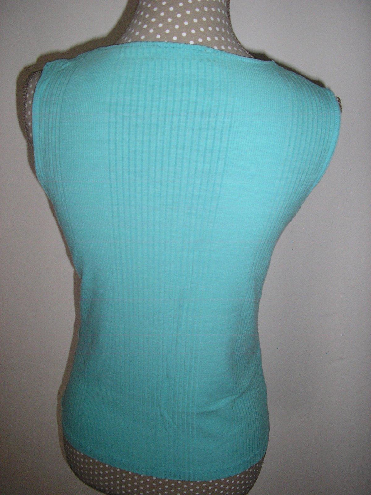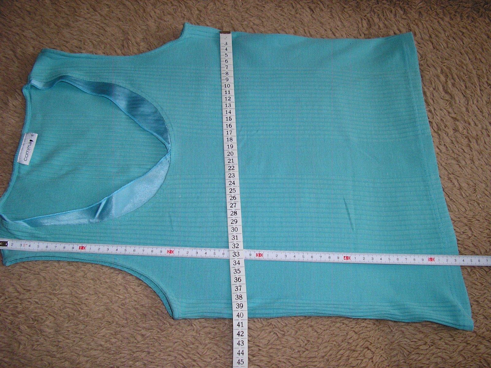 Top – tyrkysovej farby, bez ruk., rovný dolný okraj. Výstrih zdobí saténová látka. Zachovalý kus.