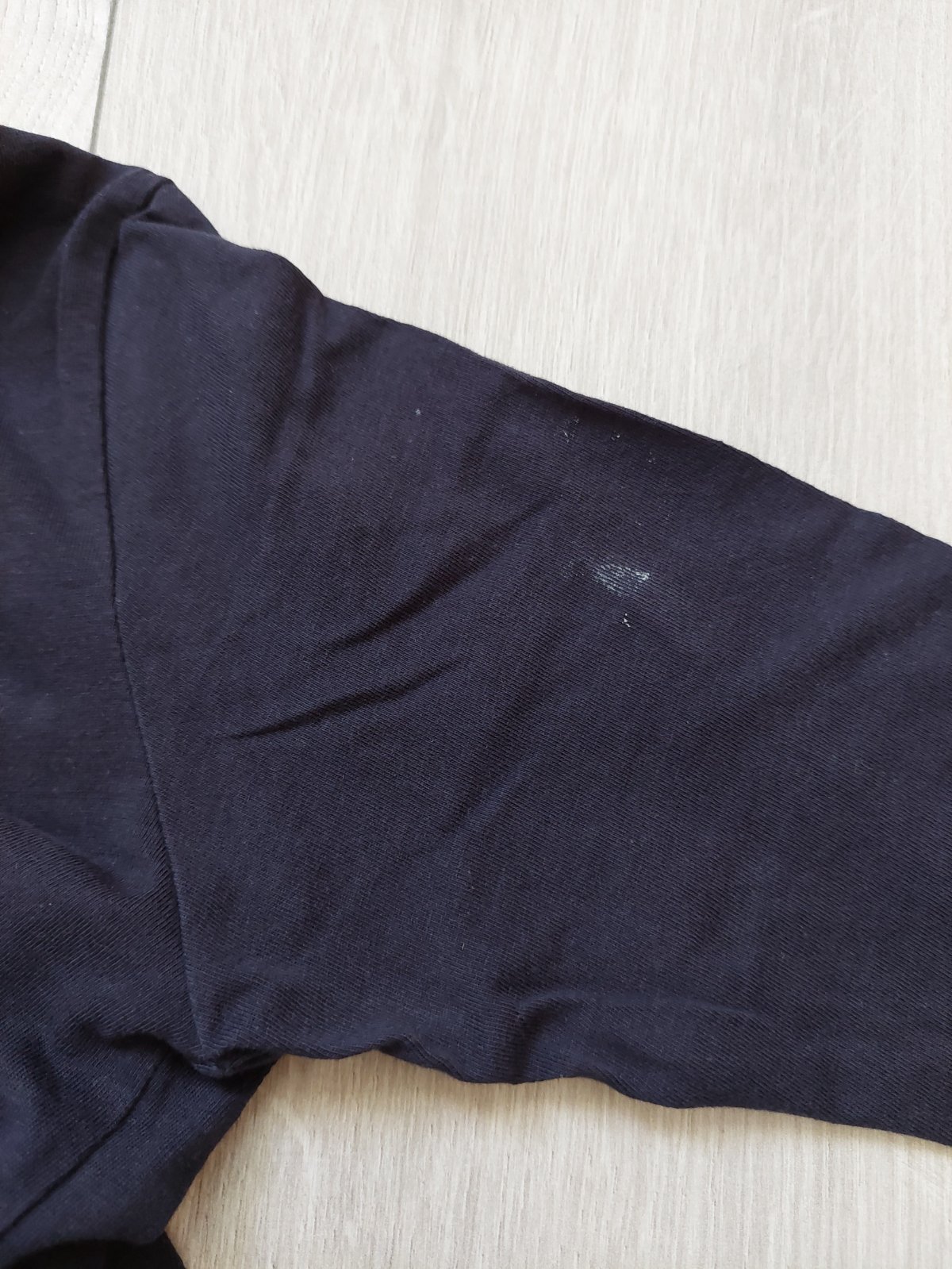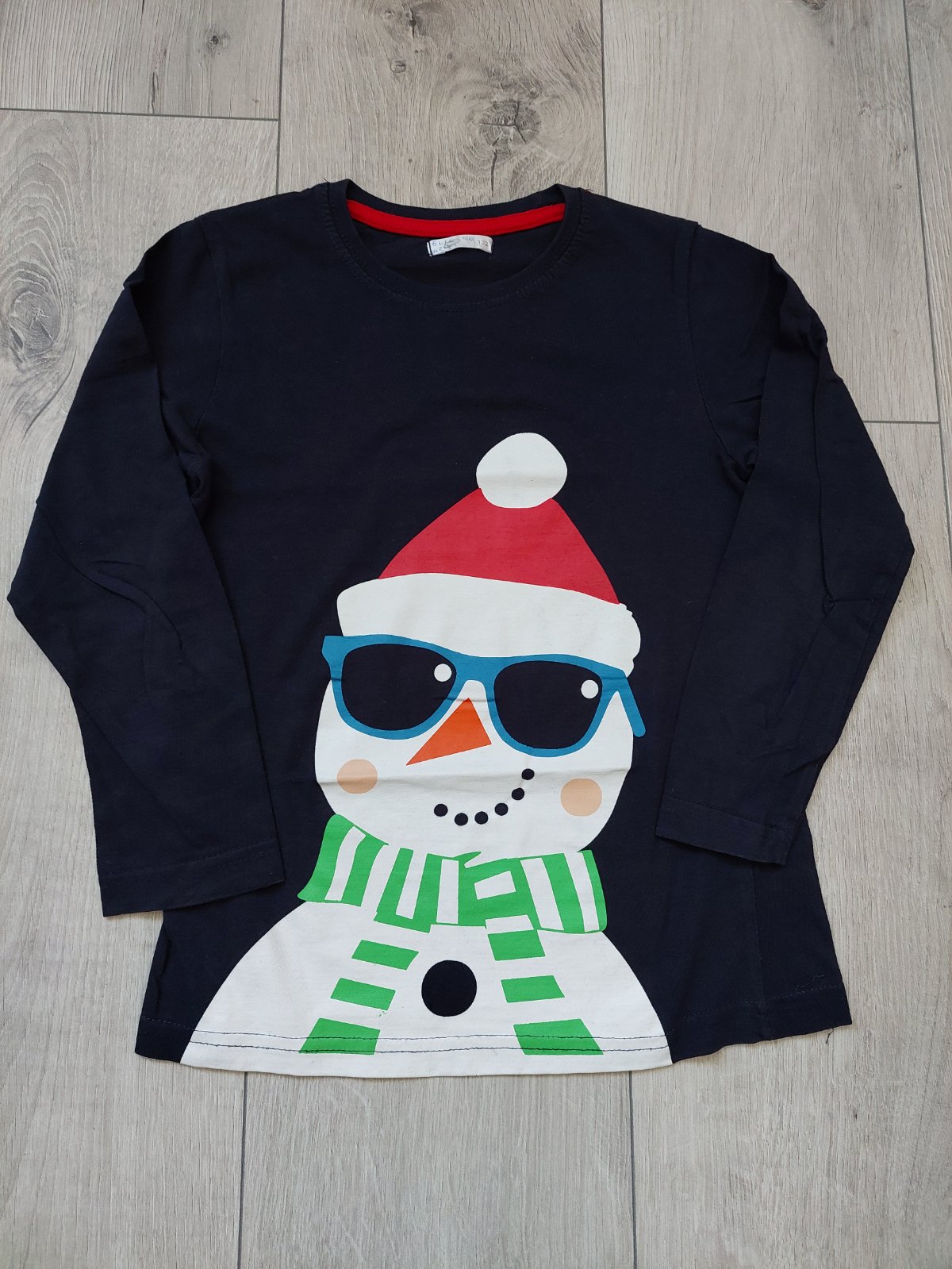 Tričko s vianočným motívom. Na ruke je škvrna, ktorá tam bola od začiatku.