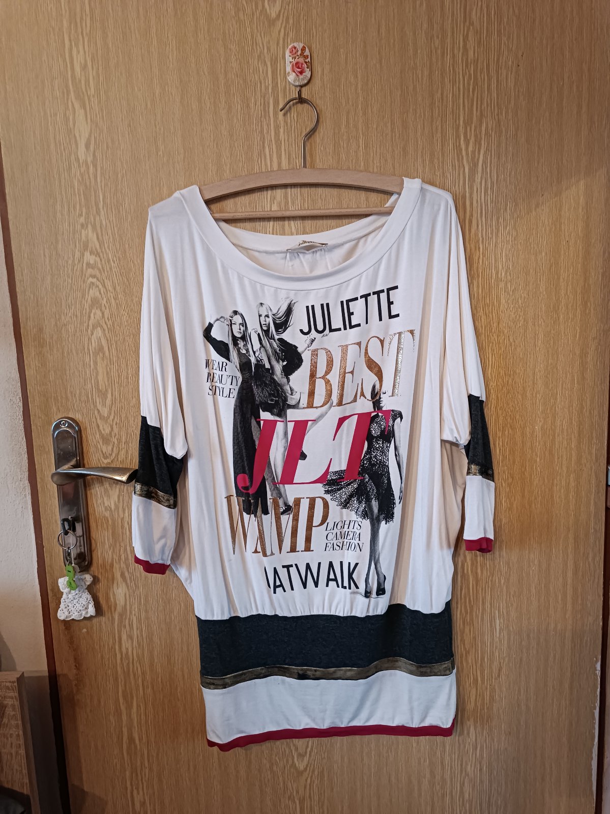 Tričko s 3/4 rukávom, značka Juliette, veľkosť neuvedená, v prípade záujmu pošlem rozmery, sadne na také XL, aj väčšie. Cena 4 €.
