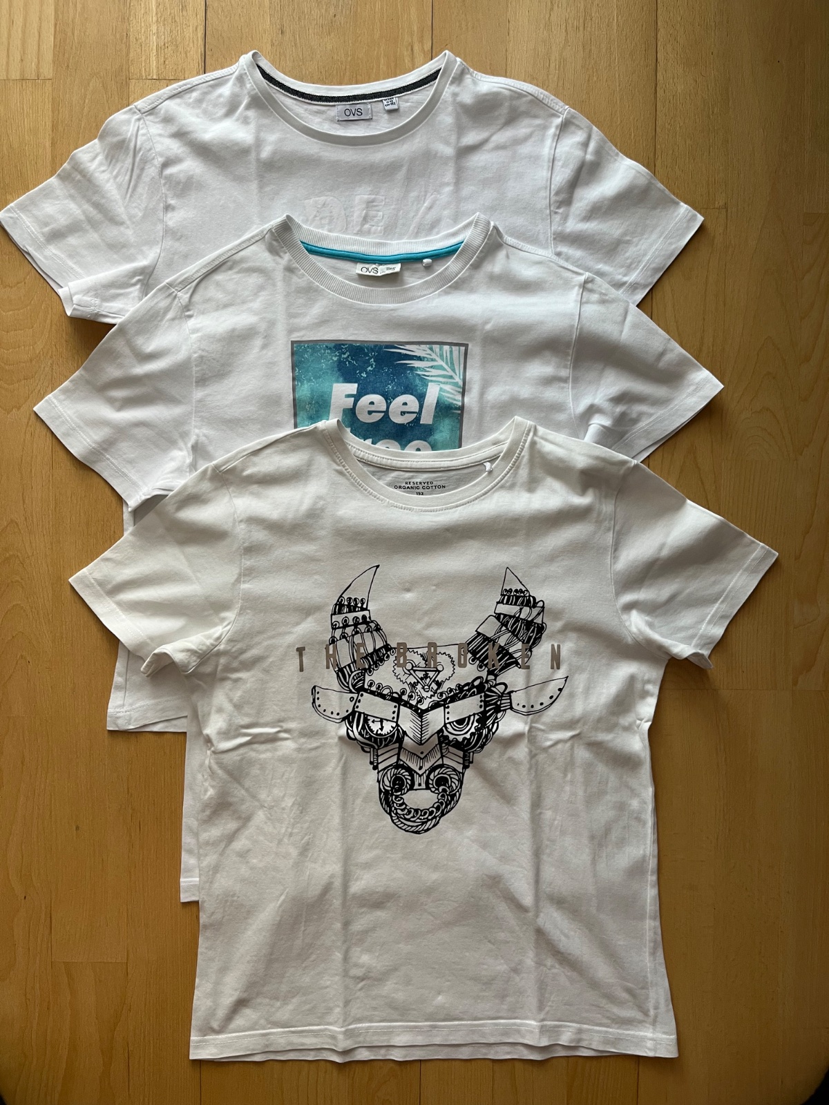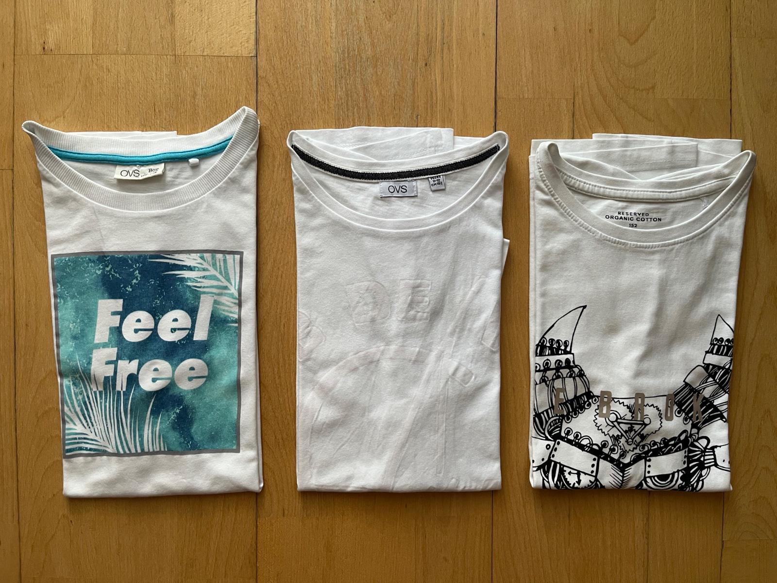 Predam3 ks bavlnene letne tricka, znacka Reserved a OVS, velkost 152 (na 10-12 rokov). 2 su snehobiela a tricko Reserved s motívom hlavy je krémové-biele. Zadna dlzka 55-60 cm, sirka pod pazuchami 42-43 cm, cena uvedena za vsetky spolu, da sa aj jednotlivo po 3 eur. Bez flakov alebo dierok. BA - Ruzinov.