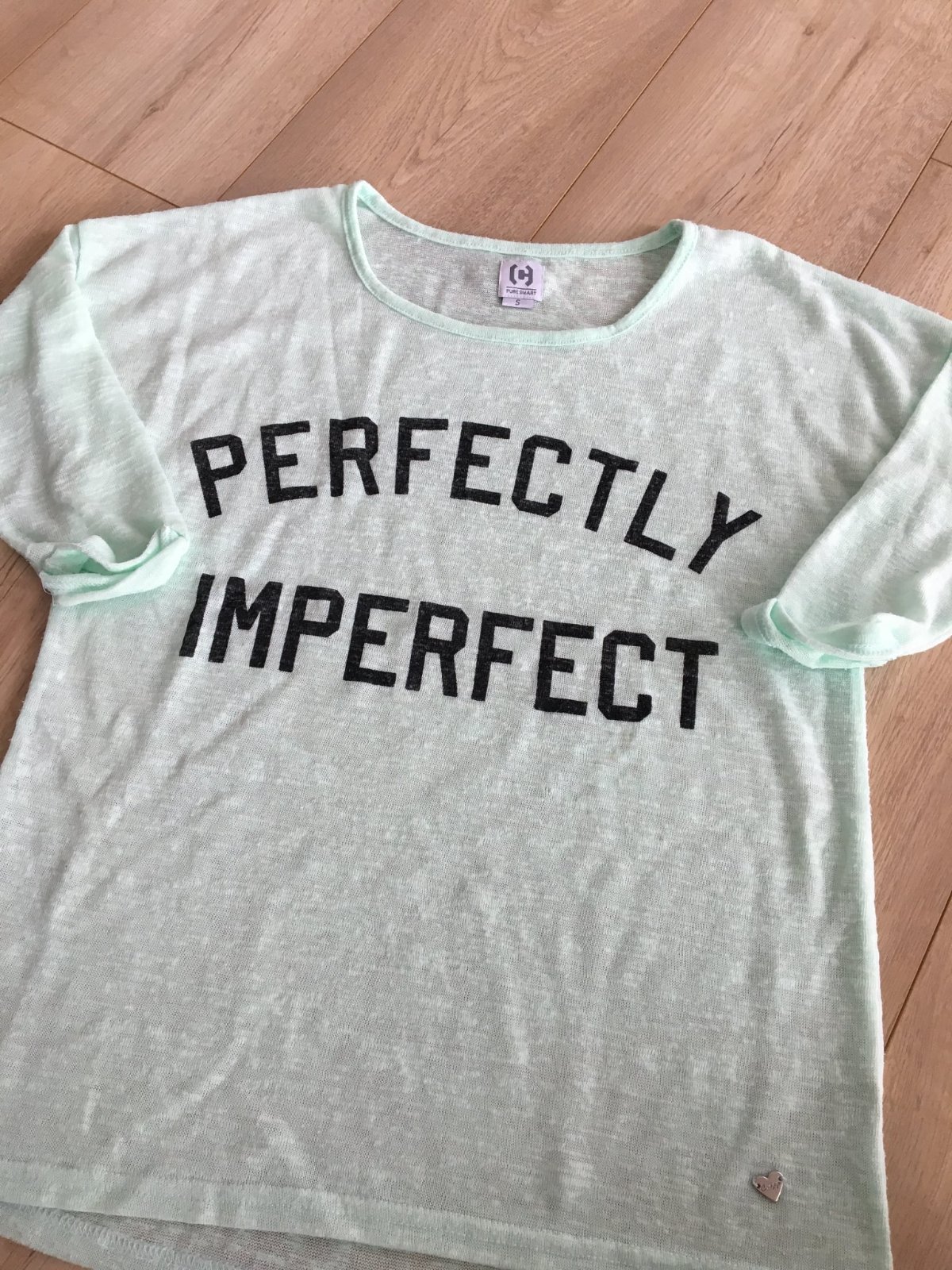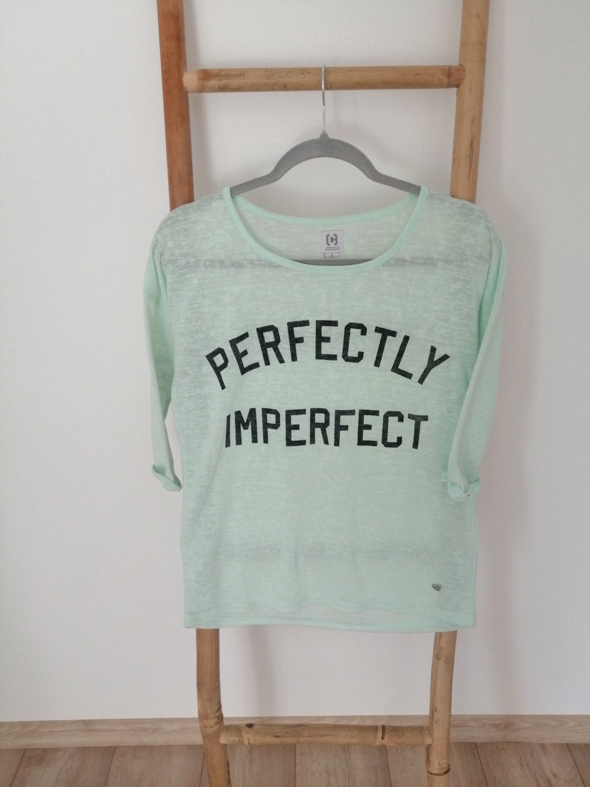 Predám dámske tričko mentolovej farby s trojštvrťovými rukávmi. Veľkosť trička je S a v strednej časti je nápis.