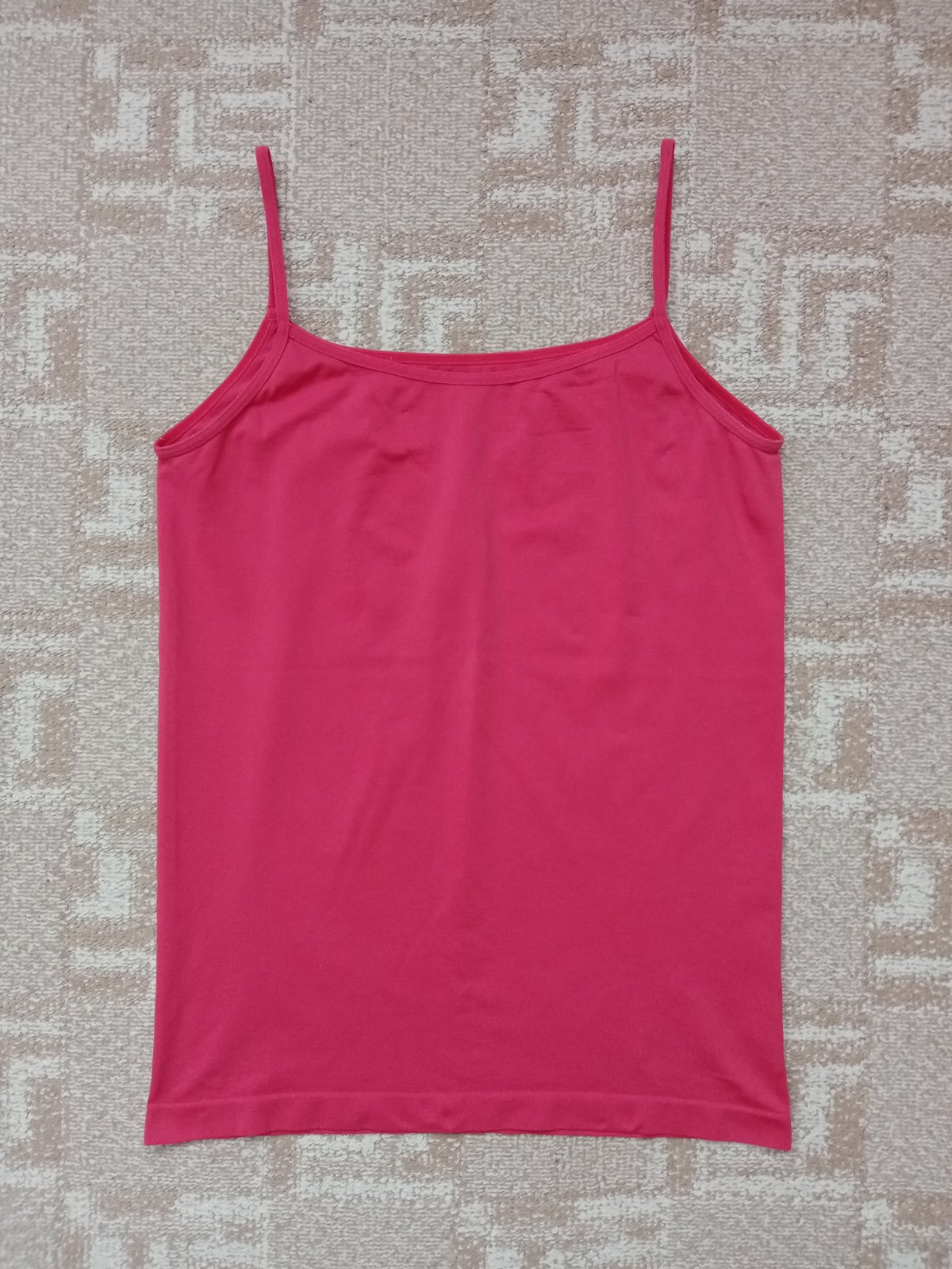 Funkčné tričko sýtej koralovej farby so špagetovými ramienkami. Elastické. Dĺžka 60 cm, šírka pod pazuchami 40 cm.
