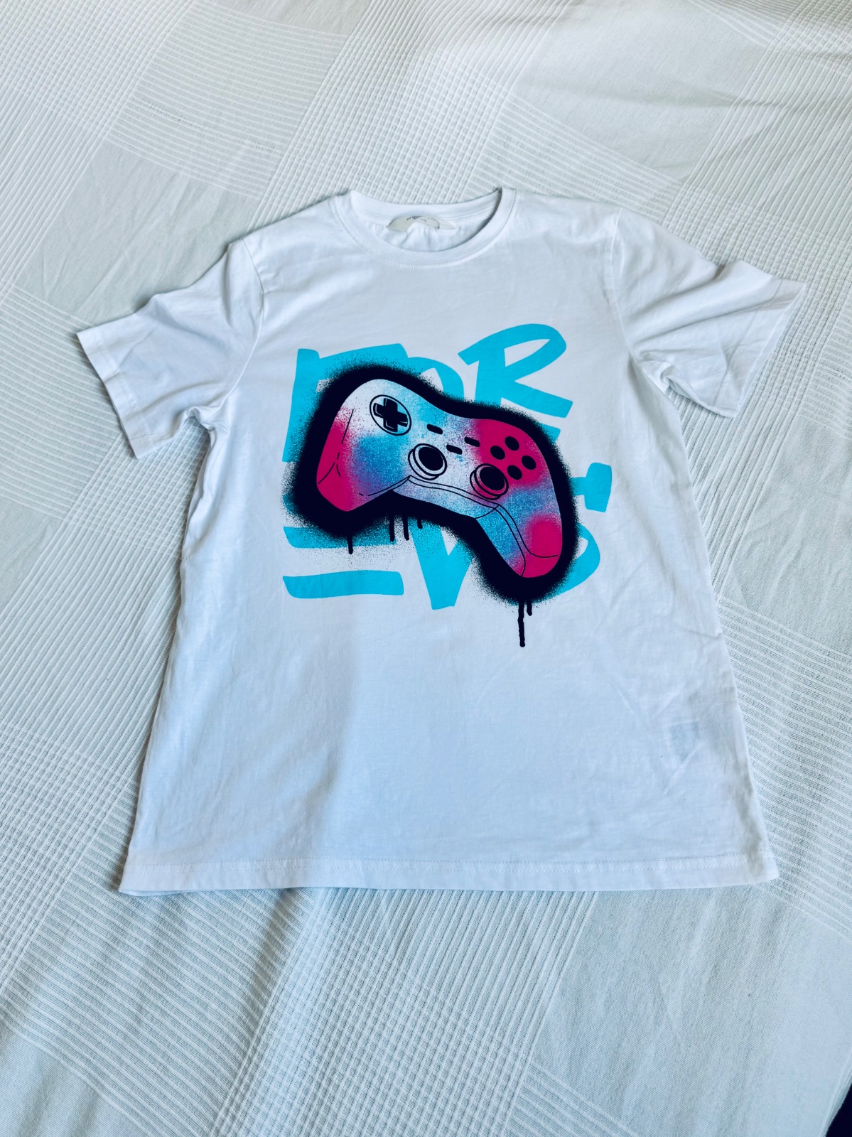 Predám pohodlné bavlnené džerzejové tričko s pútavým gamerským motívom a rebrovaným golierom. Tričko je vo výbornom stave - vo viac ako výbornom stave.