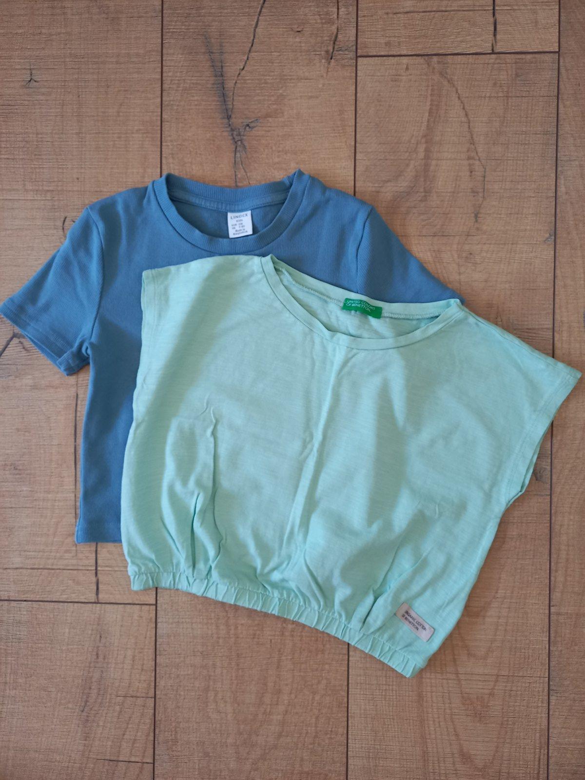 2x skratene tricka, modre rebrovane Lindex, matovozelene Benetton, velk. 128/130. Velmi pekny stav. Cena spolu.