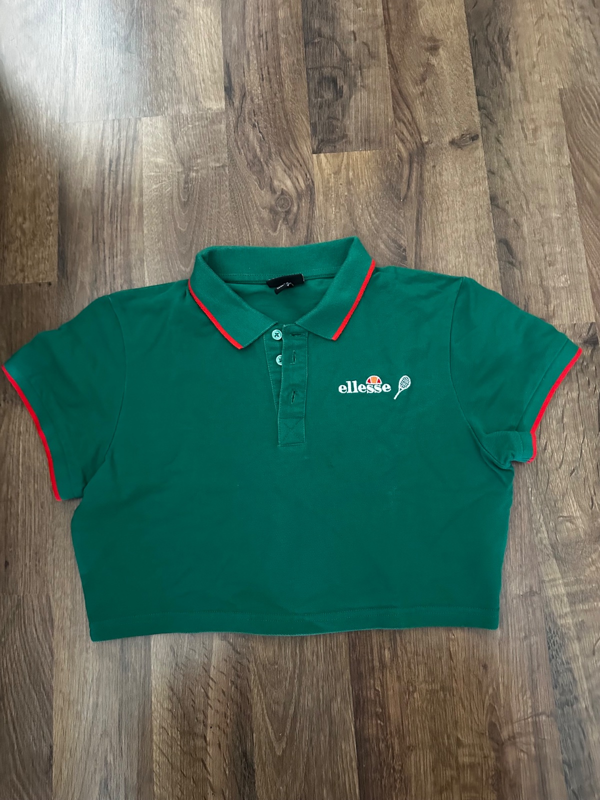 Predám štýlové crop polo tričko značky Ellesse v krásnej zelenej farbe, ktorá v skutočnosti vyniká krajšie než na fotke. Tričko má klasický golier so zapínaním na gombíky a kontrastné červené lemovanie na rukávoch aj golieri. Výrazné logo s tenisovým motívom dodáva športovo-elegantný vzhľad. Oblečené len párkrát, vo výbornom stave, bez poškodení. Skvelý kúsok do šatníka na leto – hodí sa k rifliam, šortkám aj sukniam.