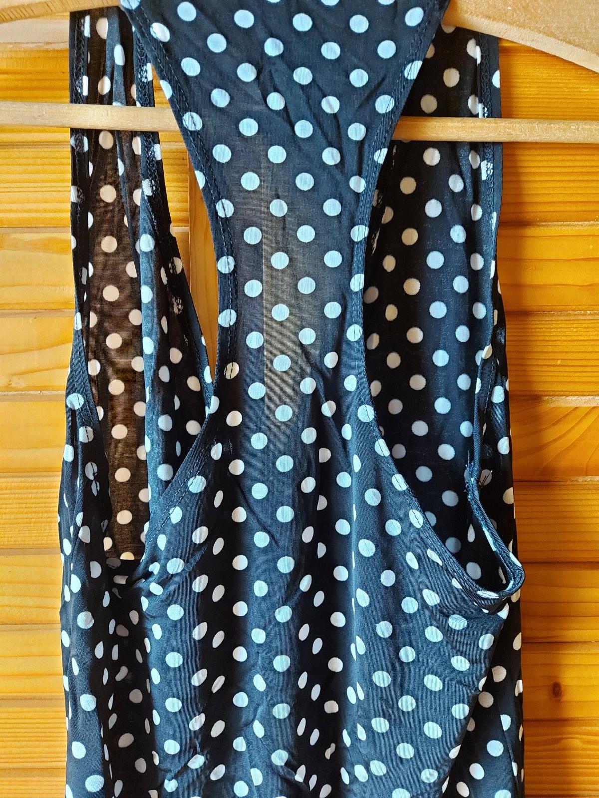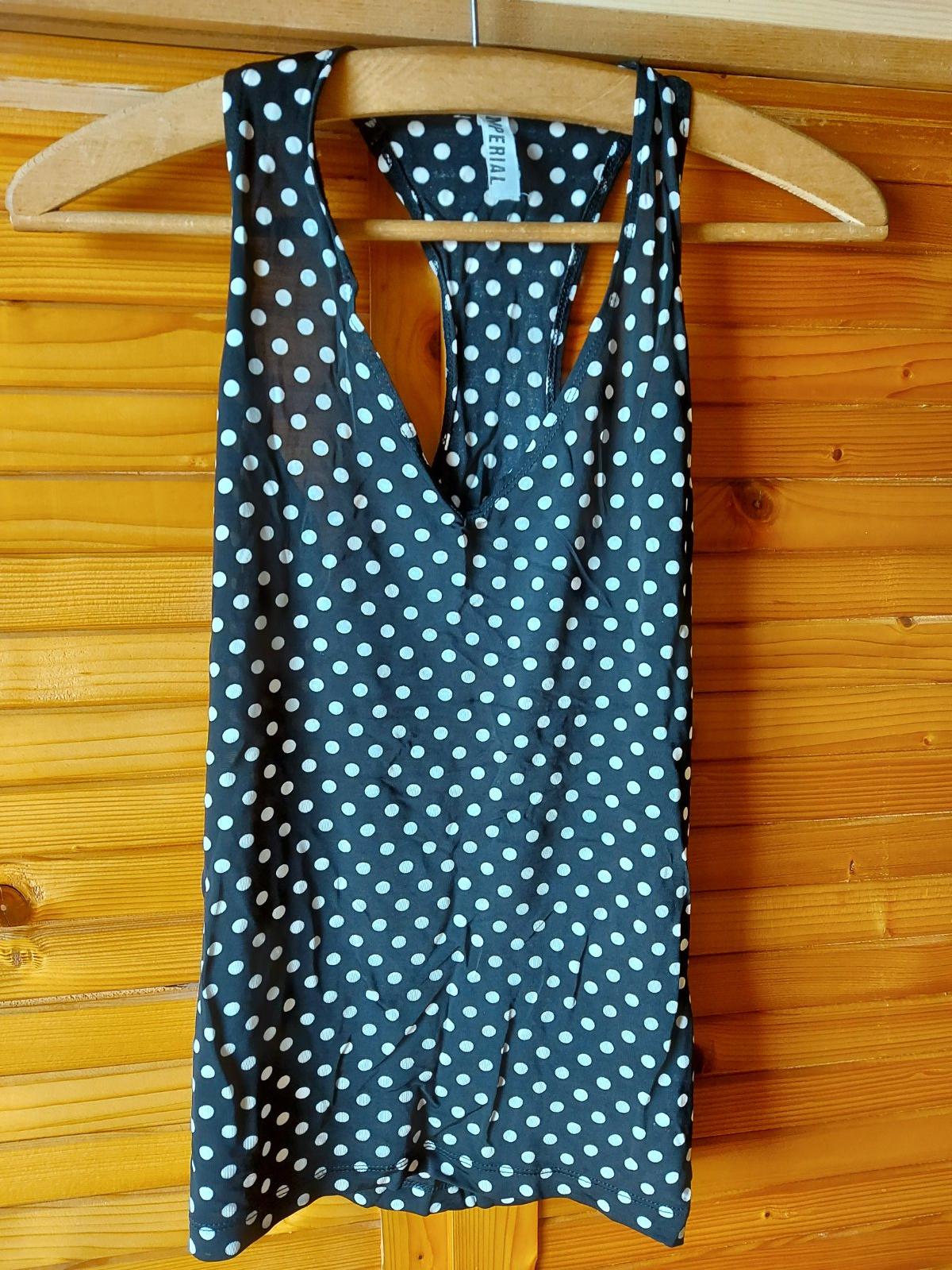 bodkovaný top, XS/S, čierny podklad-biele bodky, veľmi jemný elastický materiál, vpredu V-čkový výstrih, vzadu vykrojený chrbát-viď foto, š. pod pazuchami v kľude - 35, dĺžka zadného dielu - 59