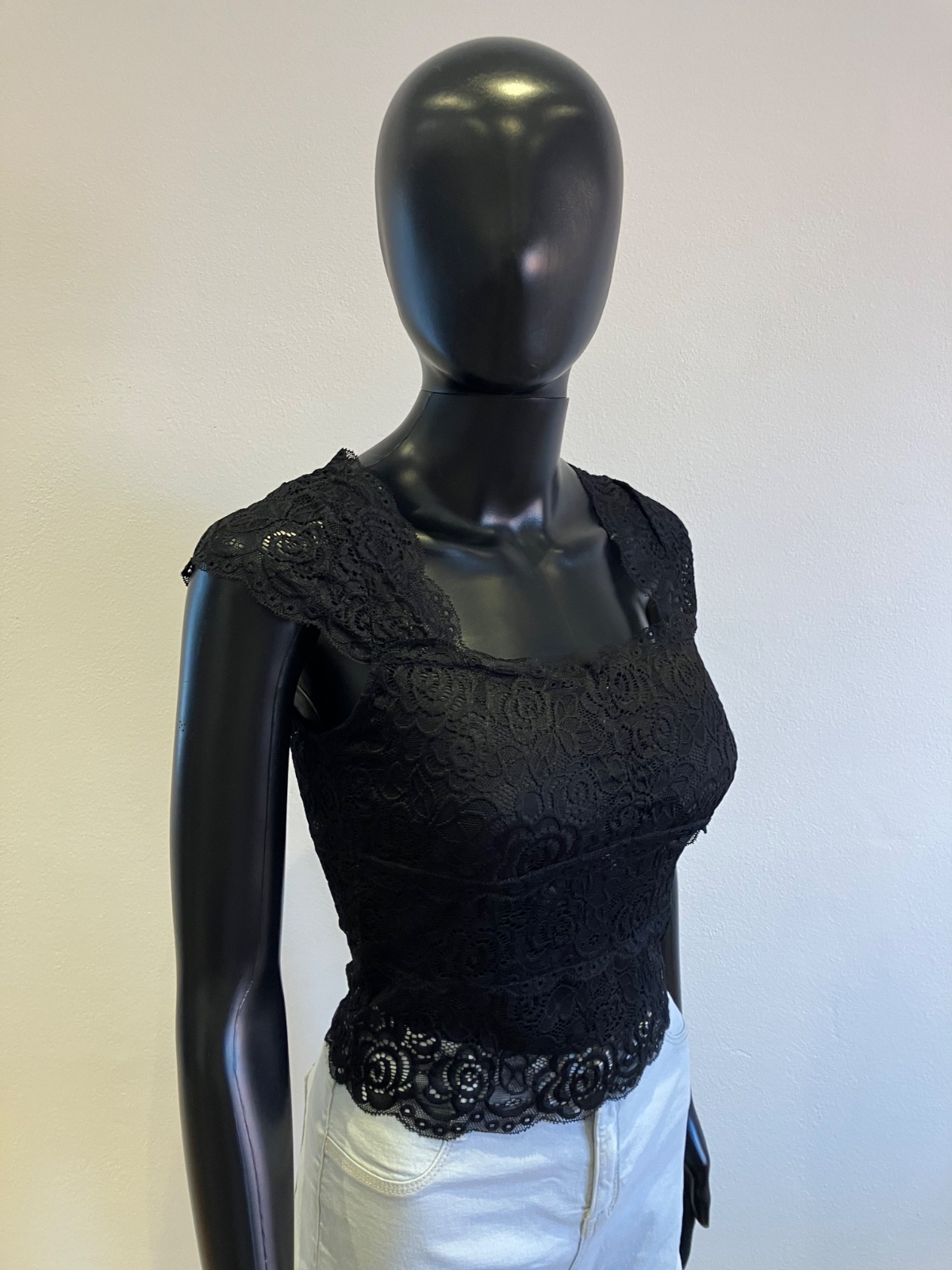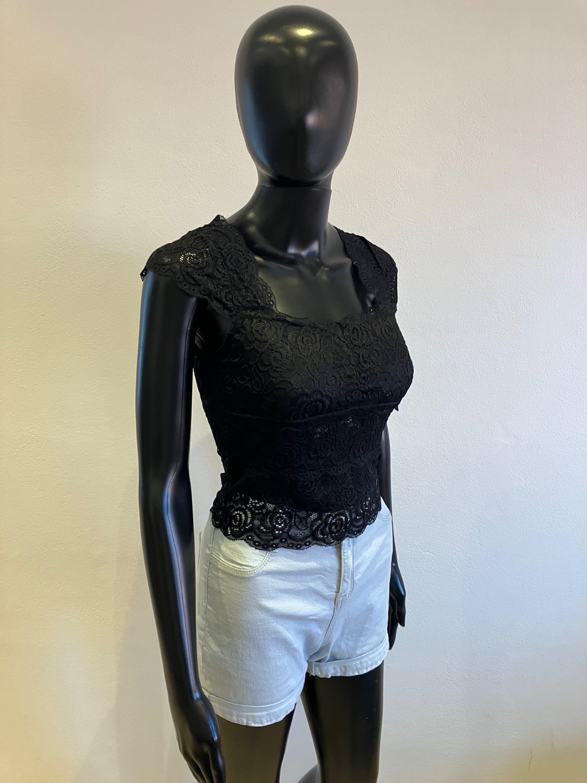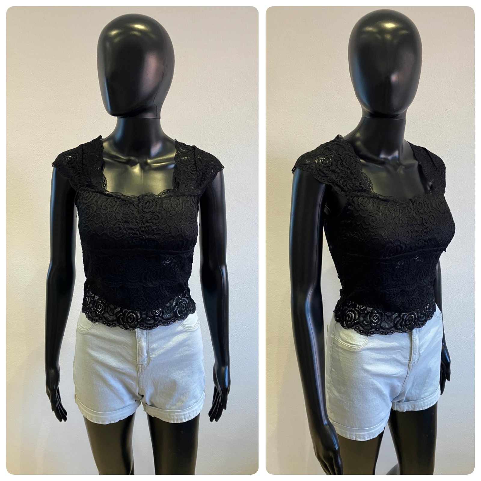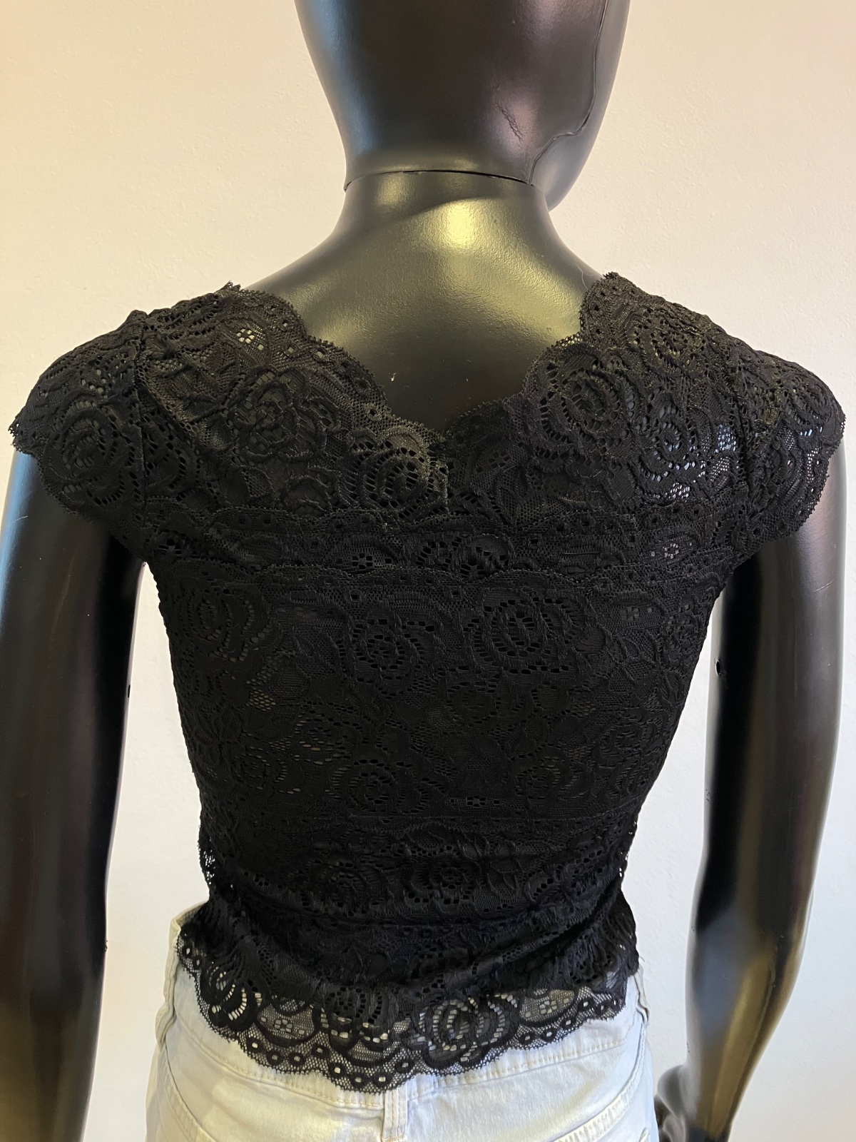 Dámske krátke tričko s krátkym rukávom, čipkované, s výstužou na prsiach, čierne, elastické.