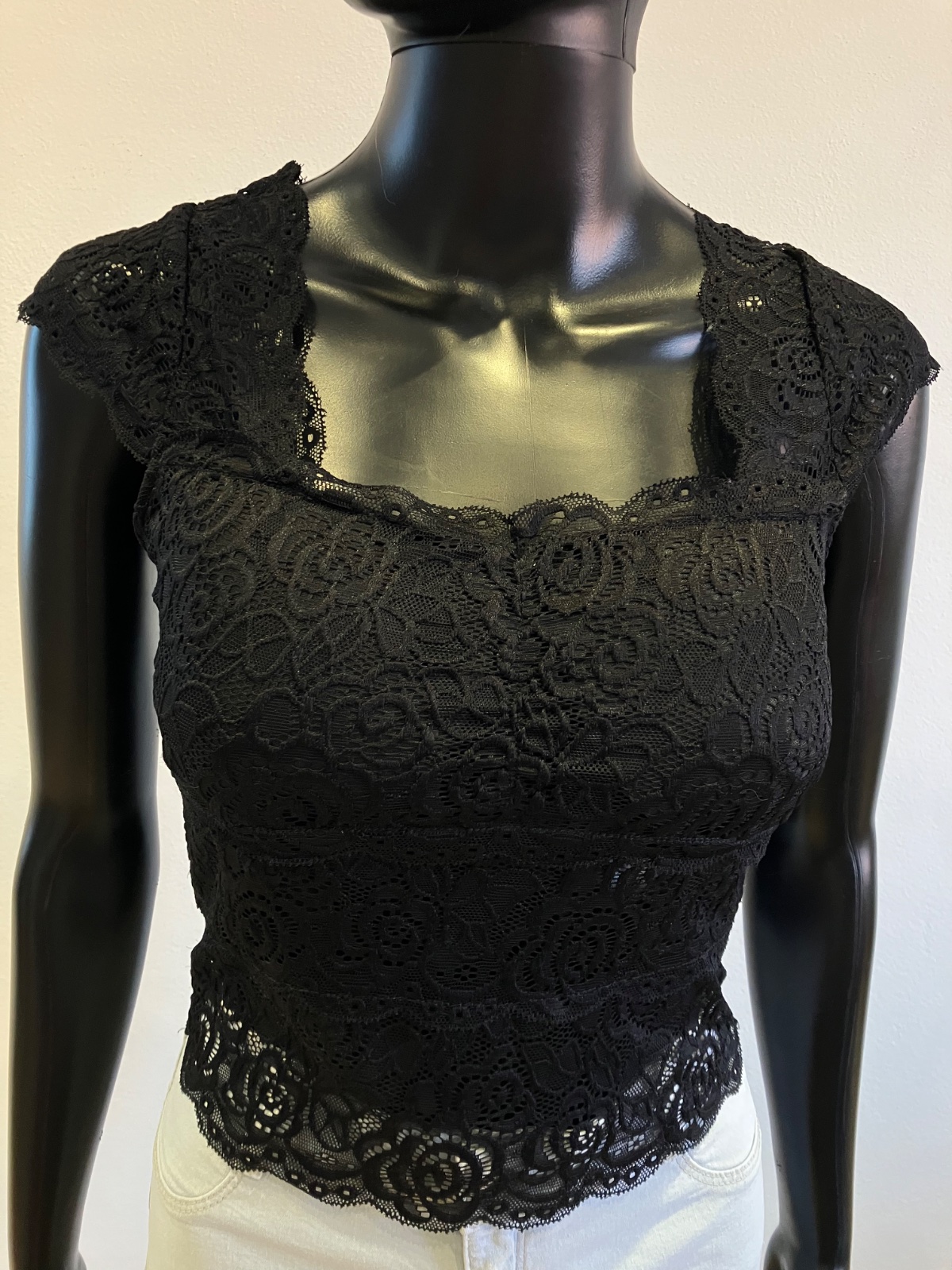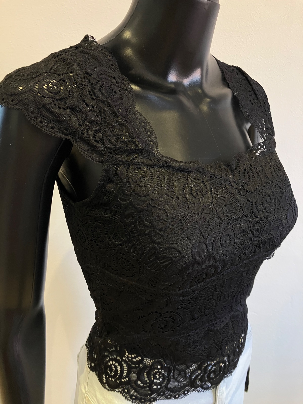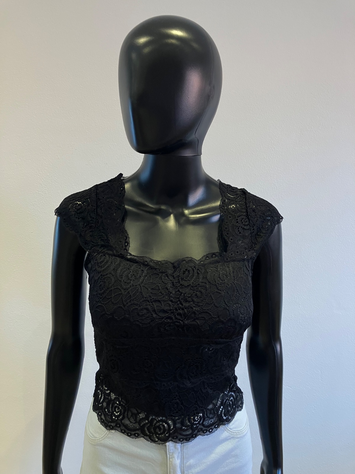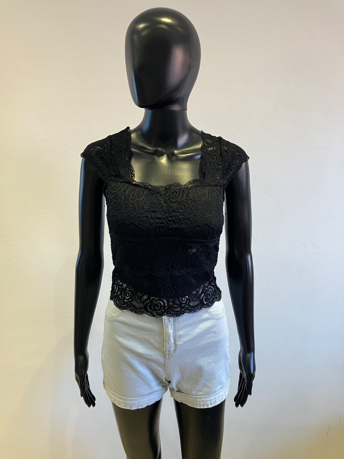 Dámske krátke tričko s krátkym rukávom, čipkované, s výstužou na prsiach, čierne, elastické.