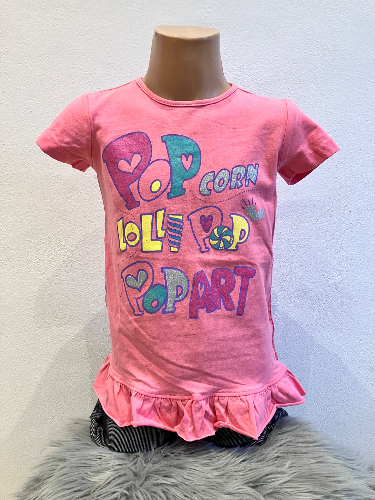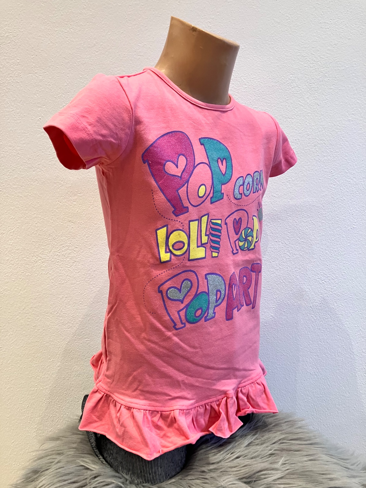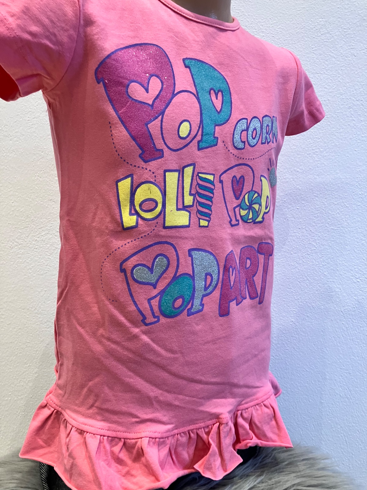 Dievčenské tričko s krátkym rukávom. Okrúhly výstrih, trblietavý nápis, s volánmi na spodku, materiál:95% bavlna,5% elastan.