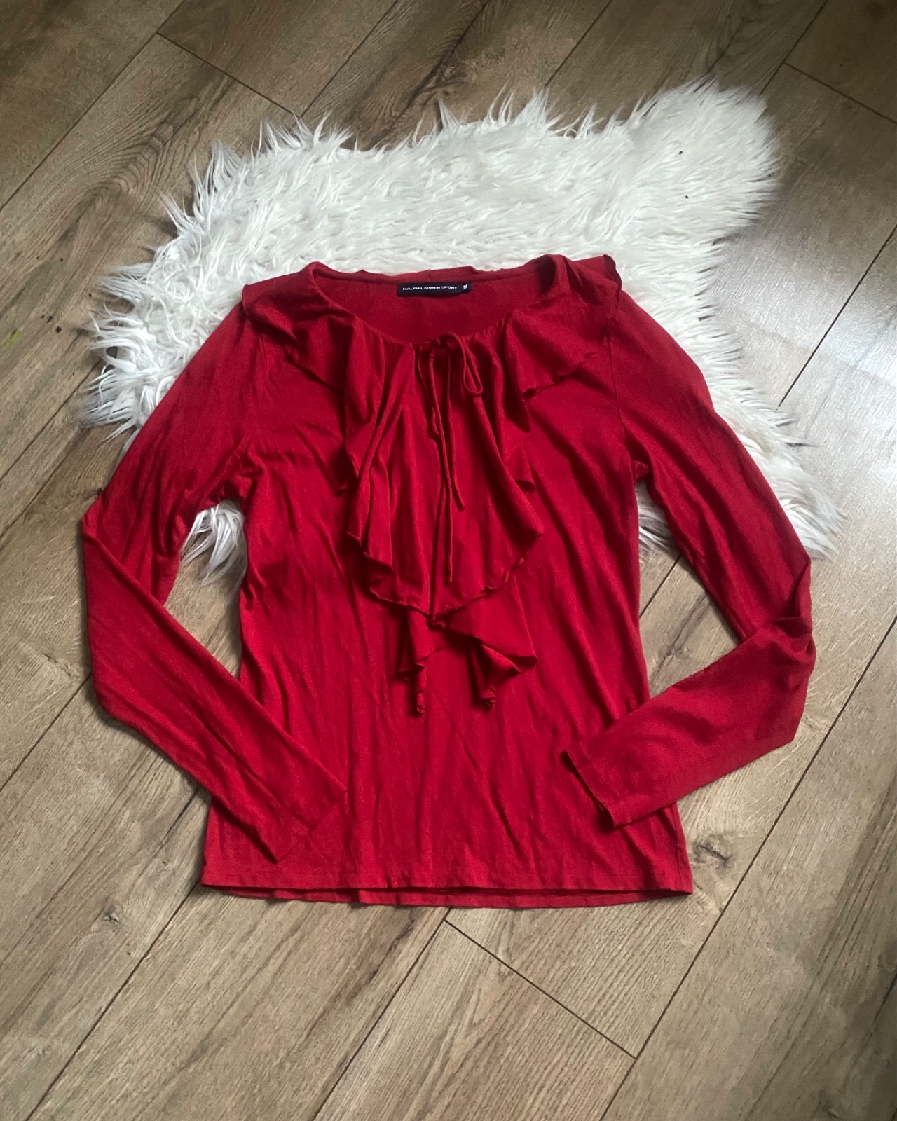 original RL v krasnej cervenej farbe, luxusna tunika, bluzka, top bodkovany s napisom, PC velmi vysoka, oblecena 2 krat, ako nova velkost Sko ale taka volna aj M/L rozmery sirka 55 cm dlzka 63 cm
