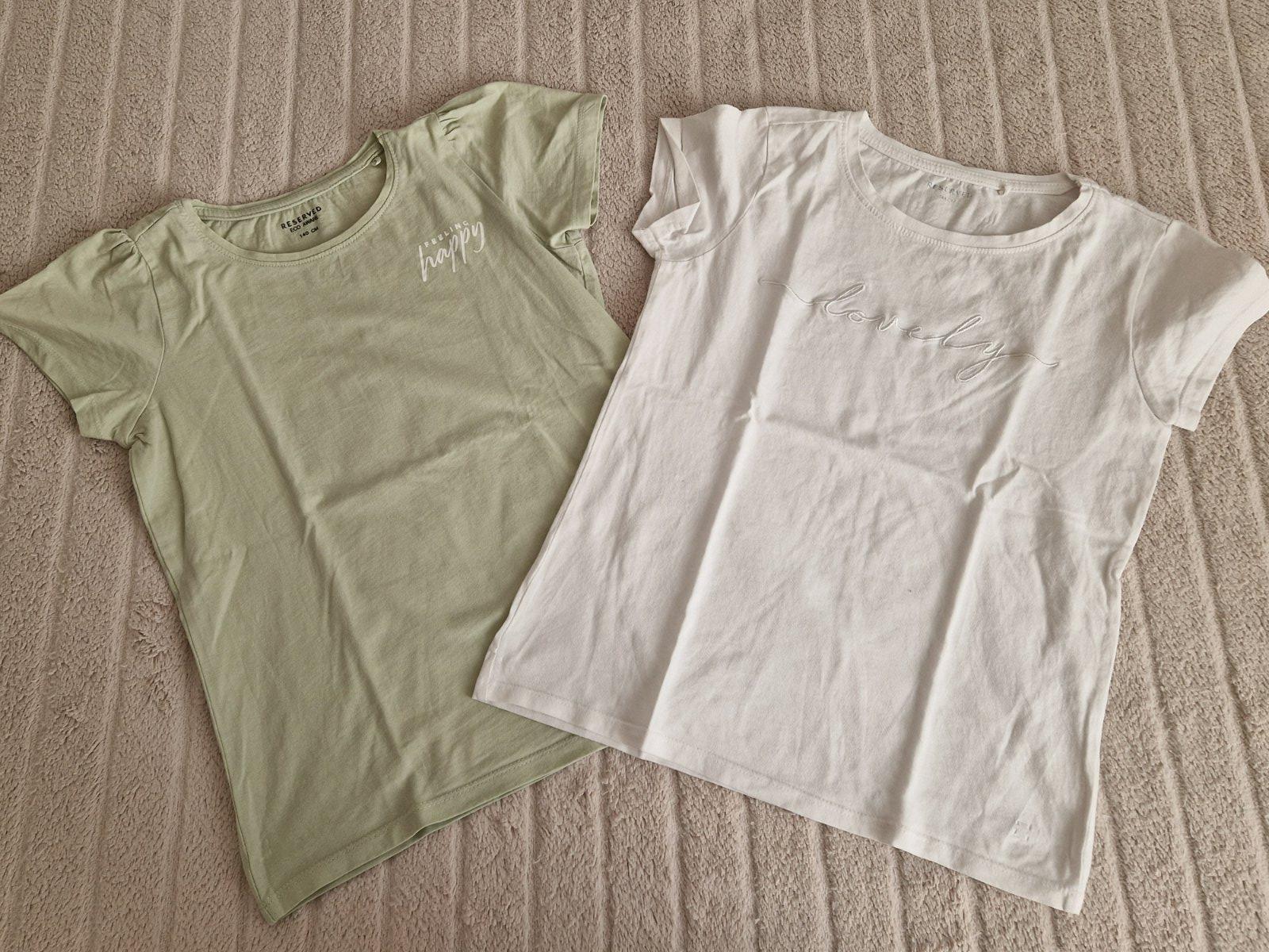 Biele a zelené tricko 140, Reserved. Na bielom vyšitý napis " lovely", na zelenom potlac " Fleming happy". Jednoduché k rifliam, bavlna eco, veľmi príjemné. Dlzka cca 50cm.