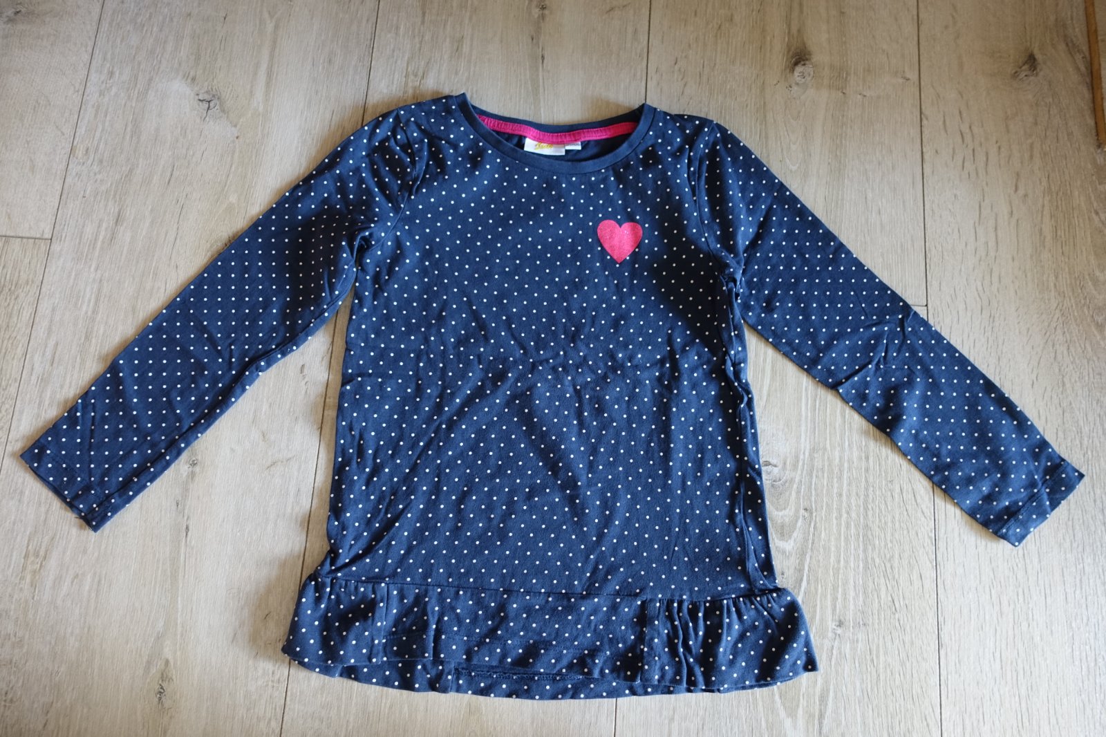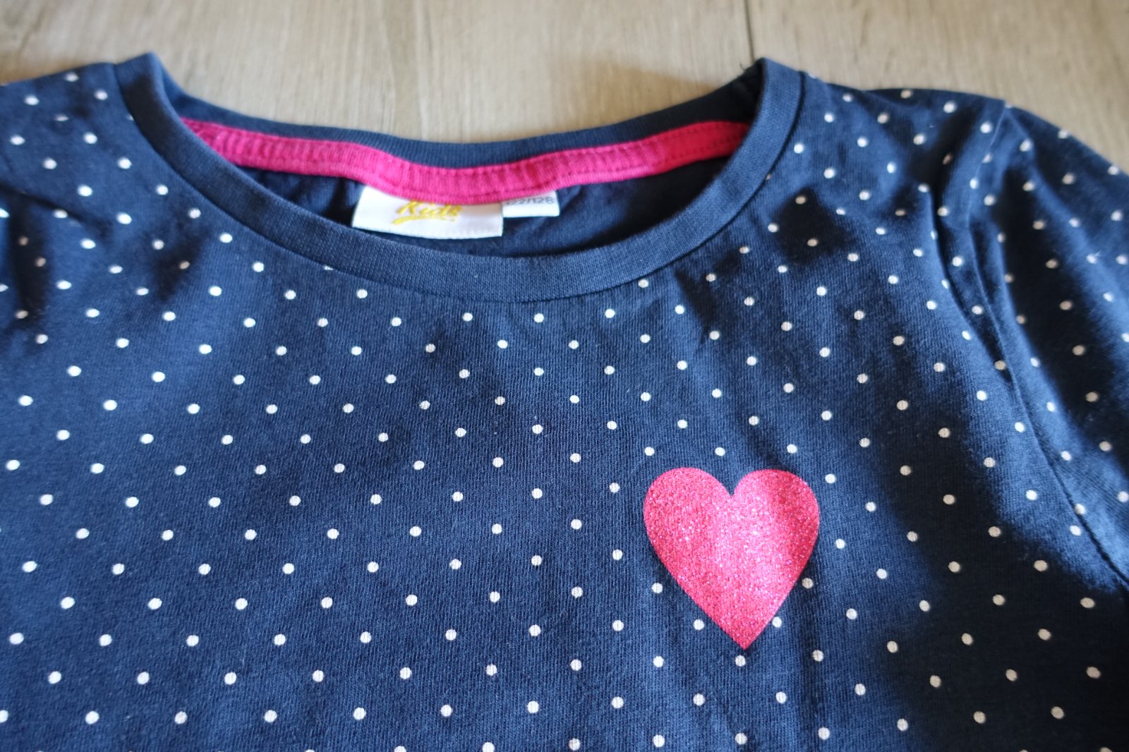 Predám krásne tmavomodré tričenko s guličkami a s trblietajúcim sa ružovým srdiečkom vo veľkosti 122/128. Mali sme ho pár krát oblečené, ale je v peknom nosenom stave. Podtlač srdiečka je nepopraskaná. Nemá žmolky, ani fľaky, ani dierky. Je veľmi príjemné na nosenie. Dĺžka je predného dielu je 47 cm a zadný diel je ešte o 2 cm predĺžený. Šírka je 33 cm. (G)
