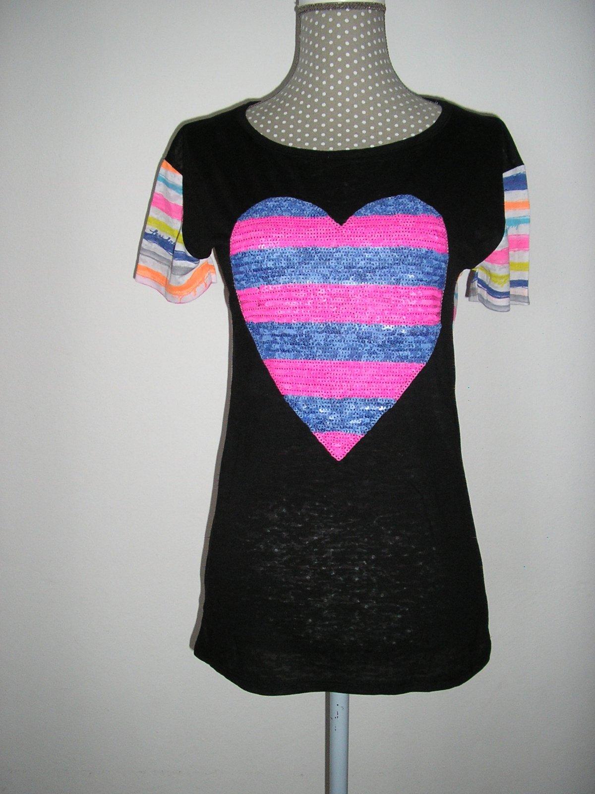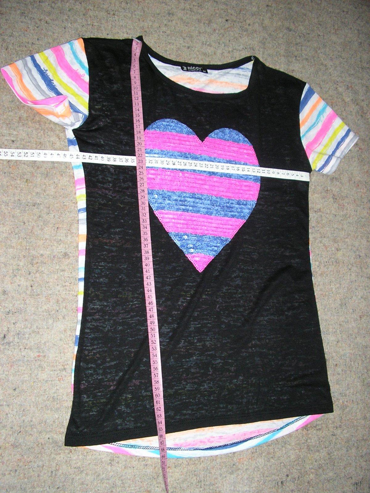 Predná str. je o pár cm kratšia, než zadná. Ruk. krátke. Vpredu veľké srdce na čiernom podklade, vzadu prúžkované.
