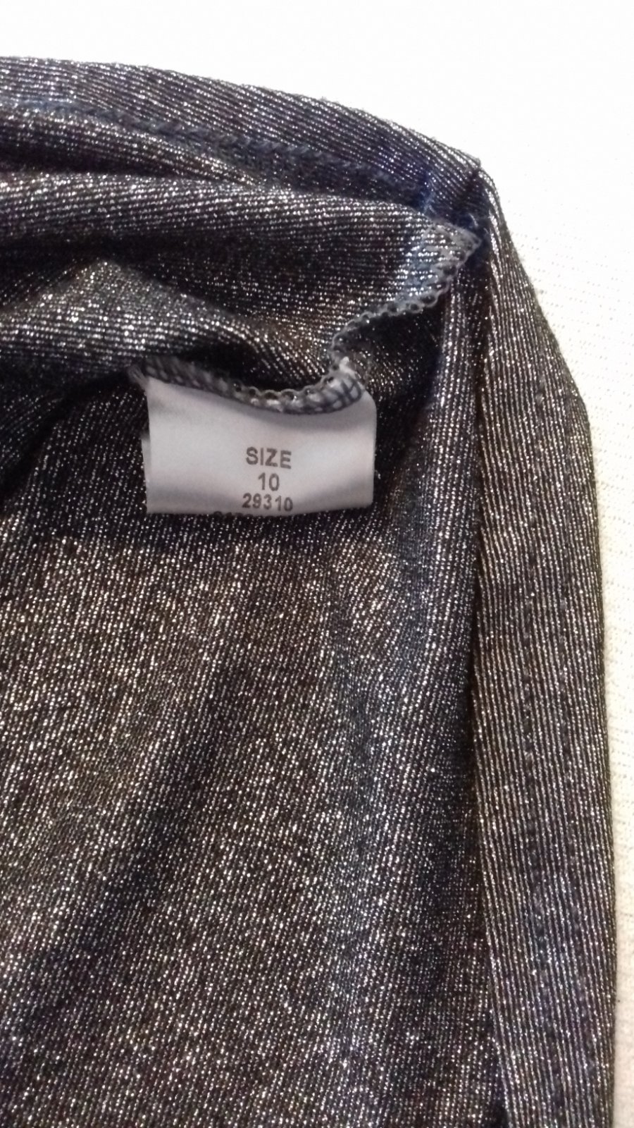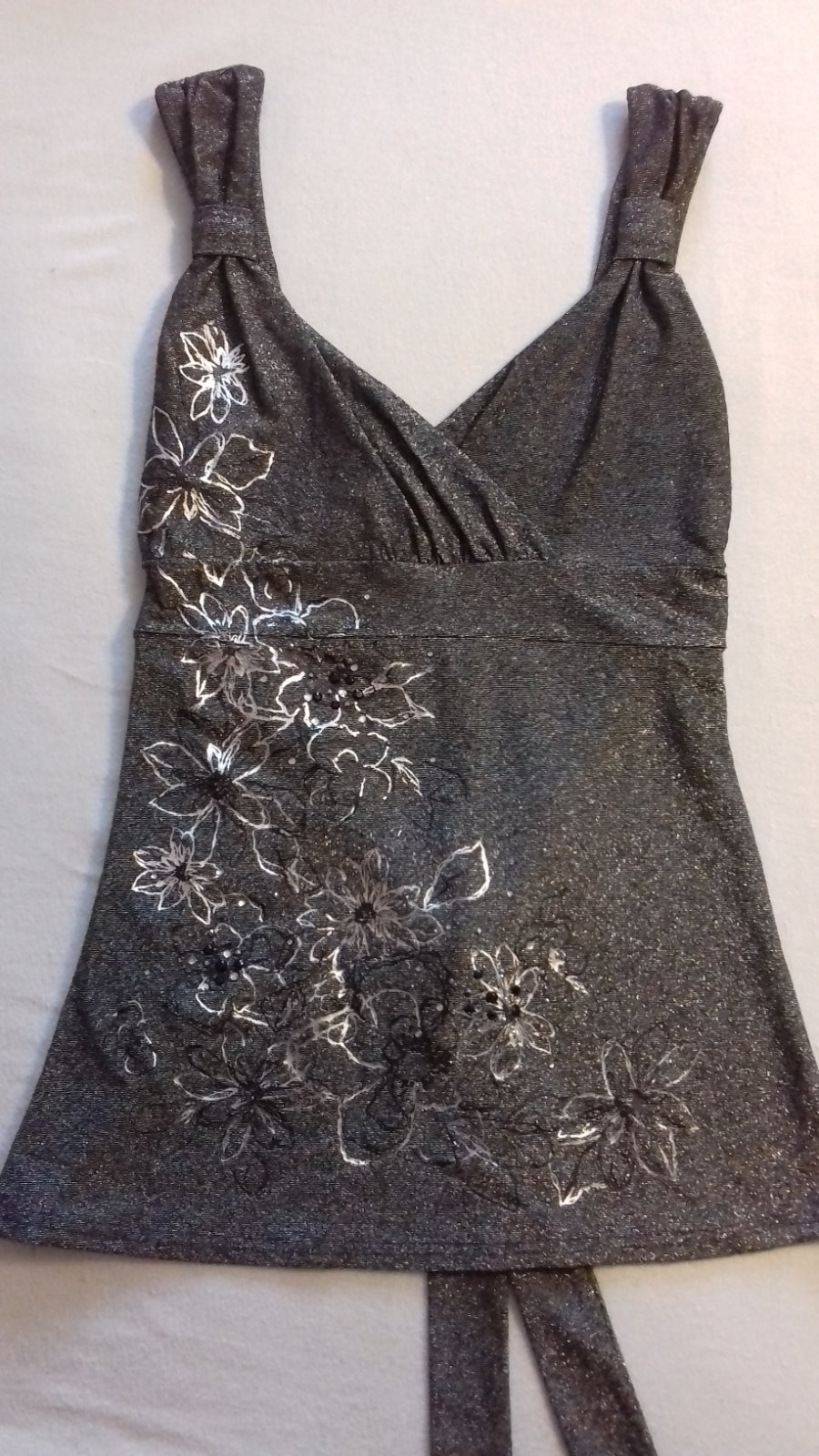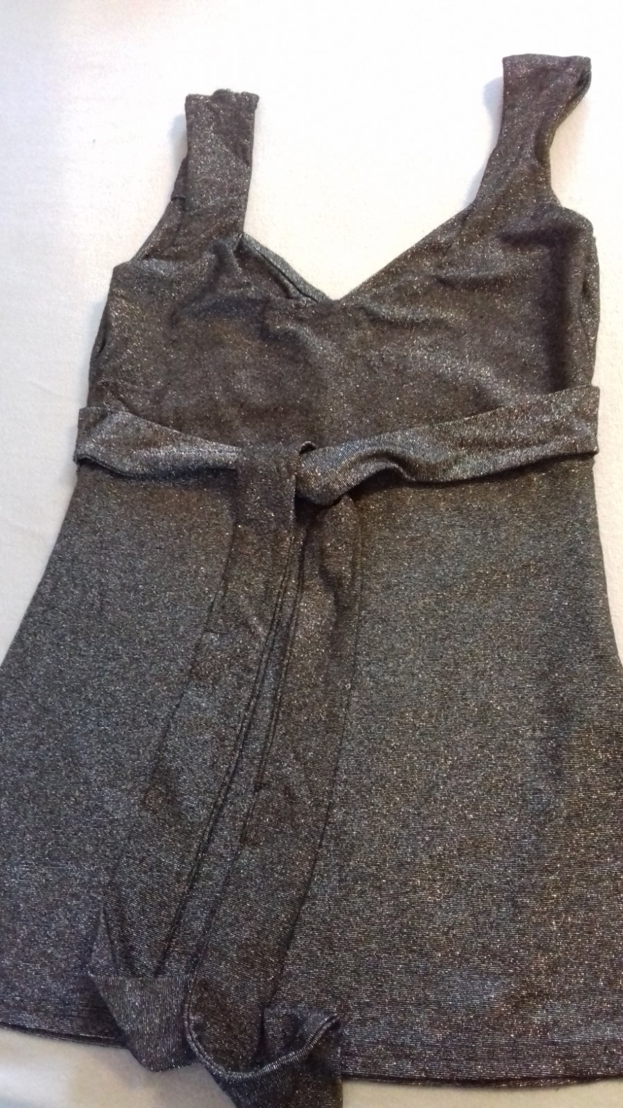 Raz oblečené, bez poškodenia.Kvalitný materiál 72% viskoza, 6%elastan, 22% metalický materiál.značka Jane Norman, kupované v Londýne.V predu strieborná potlač plus kamienky Vzadu pásik na viazanie.Cena 4 eur plus poštovné.