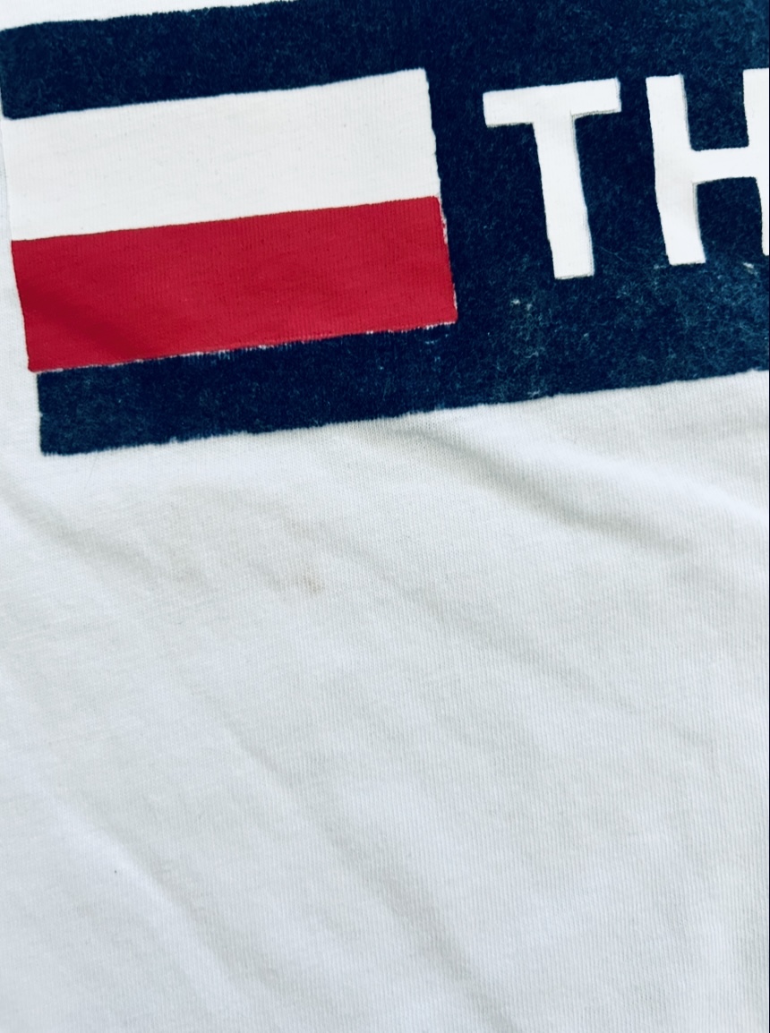 Biele tričko Tommy Hilfiger s modrým lemovaním. Vzadu s modro červeným nápisom. Dĺžka 60 cm, šírka v nenatiahnutom stave 88 cm.
