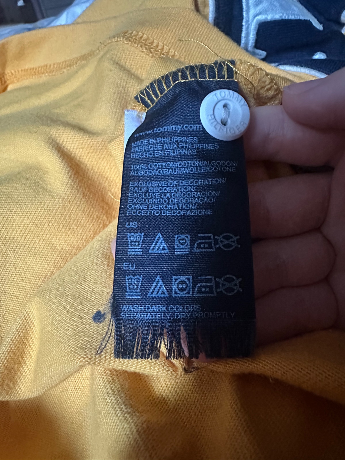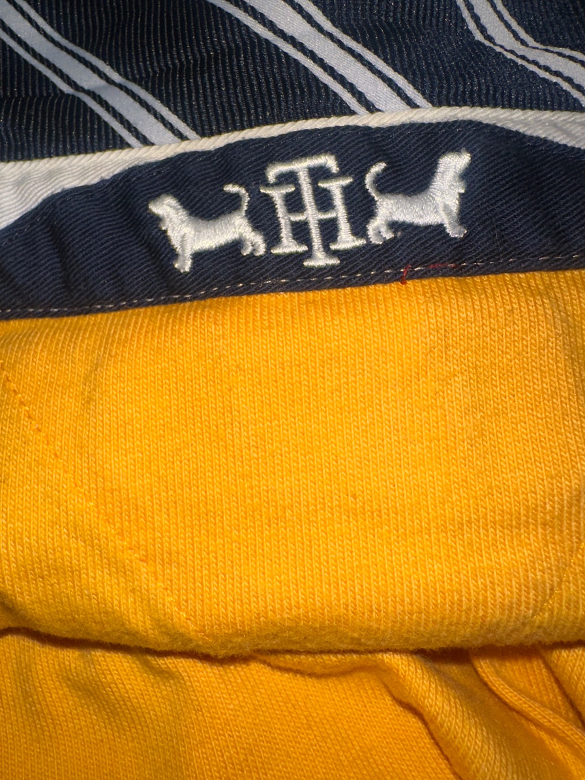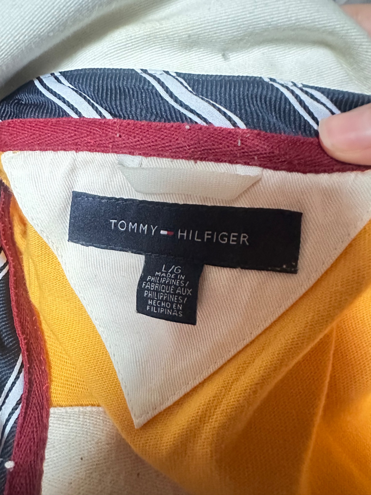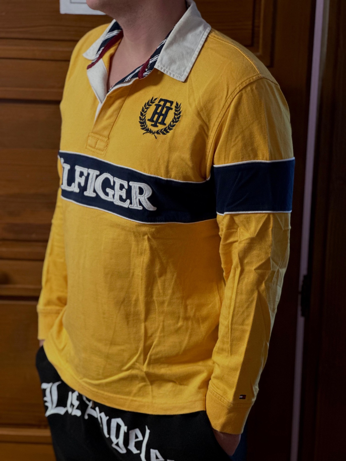 Tričko s dlhým rukávom od značky Tommy Hilfiger. Je vyhotovené v kombinácii žltej, bielej a tmavomodrej farby, s ikonickým nápisom HILFIGER cez hruď a vyšitým logom TH na ľavej strane hrude. Na rukáve nechýba ani drobné logo značky.