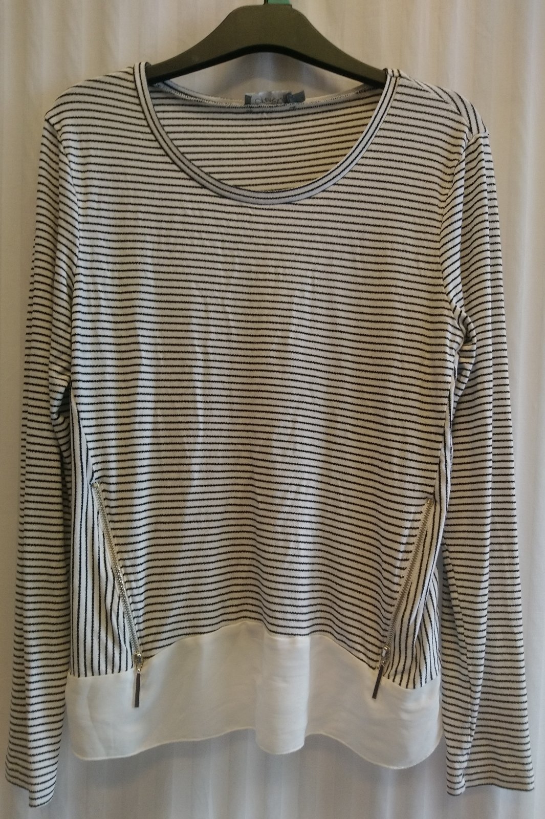 dámsky elastický pásikavý čierno biely top, v dolnej časti zipsy,