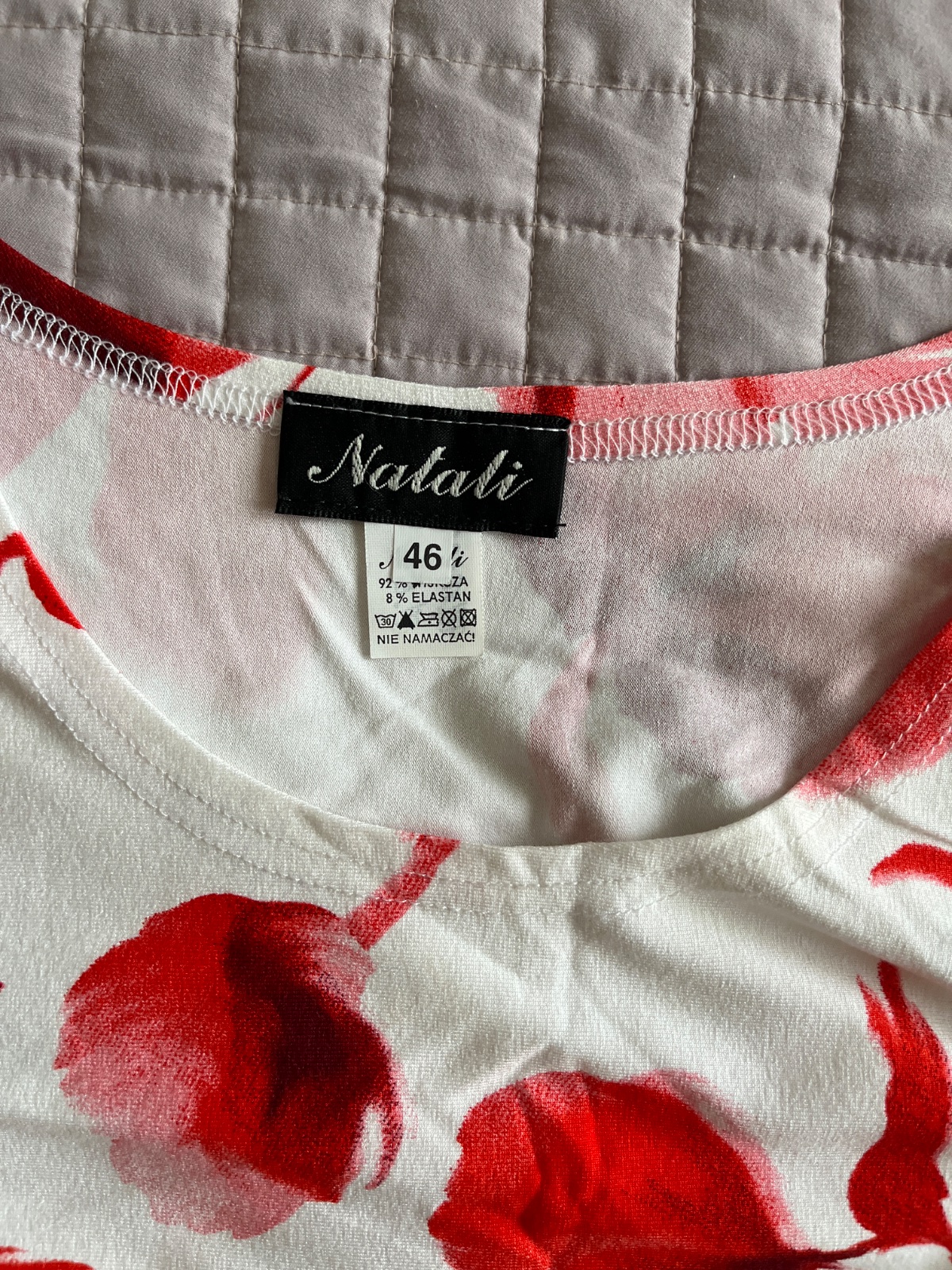 Predam dvakrat na sebe tricko ako bluzka, velkost udana 46 ale skor 42-44, prsia 50, dlzka 75, elasticke, dobre sedi k leginam ci uzkym nohaviciam, cena 18 s postou