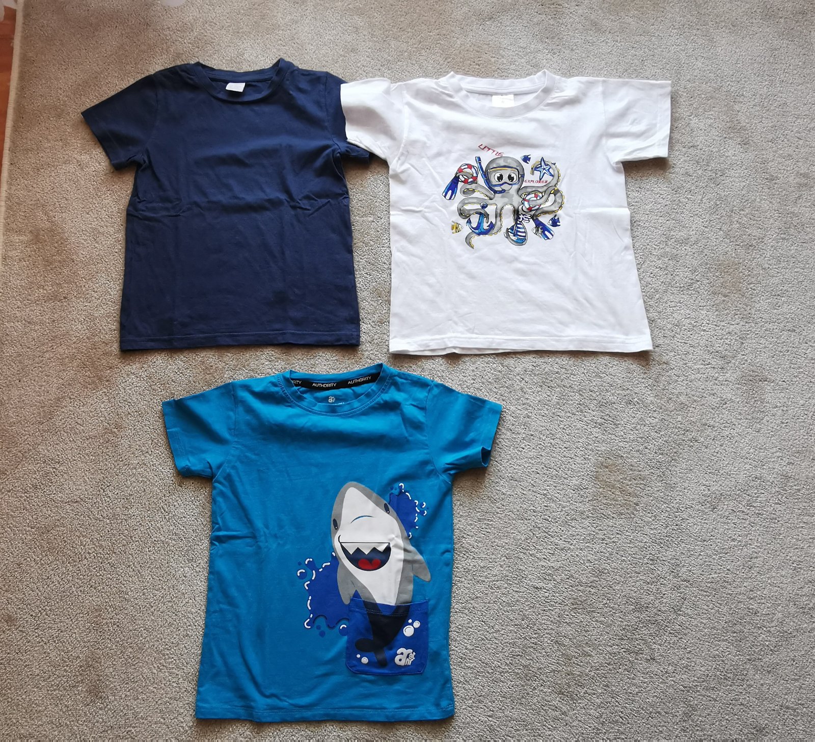 Nosené do škôlky, biele má fliačiky. Veľkosť 110/116. Tmavé modré Lindex, biele z Grécka, modré Authority veľkosť 104/110 ale je väčšie.