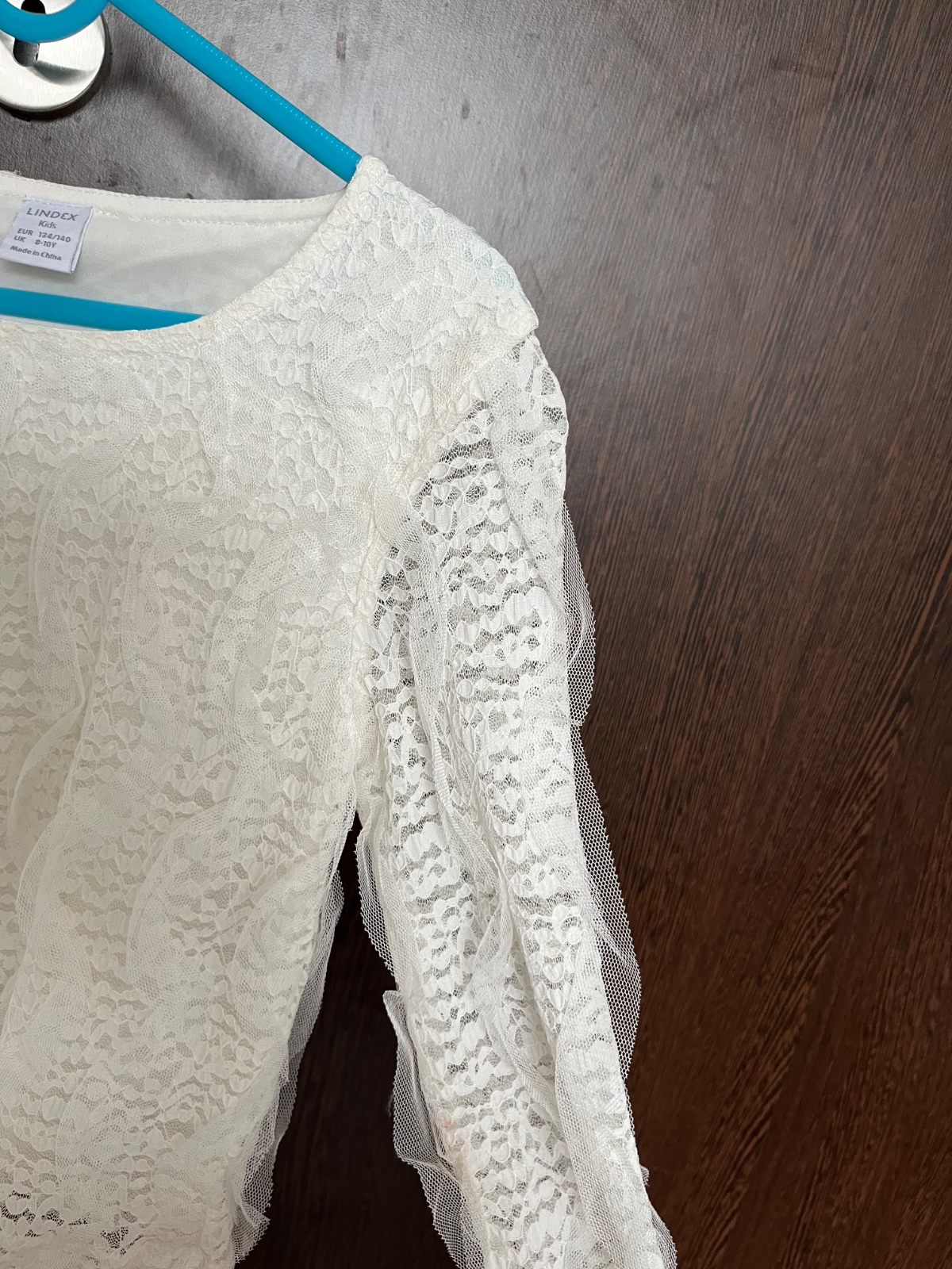 Tričko bolo vzaté jedenkrát, rukávy sú priesvitné s volánmi, pod tričkom je podšívka