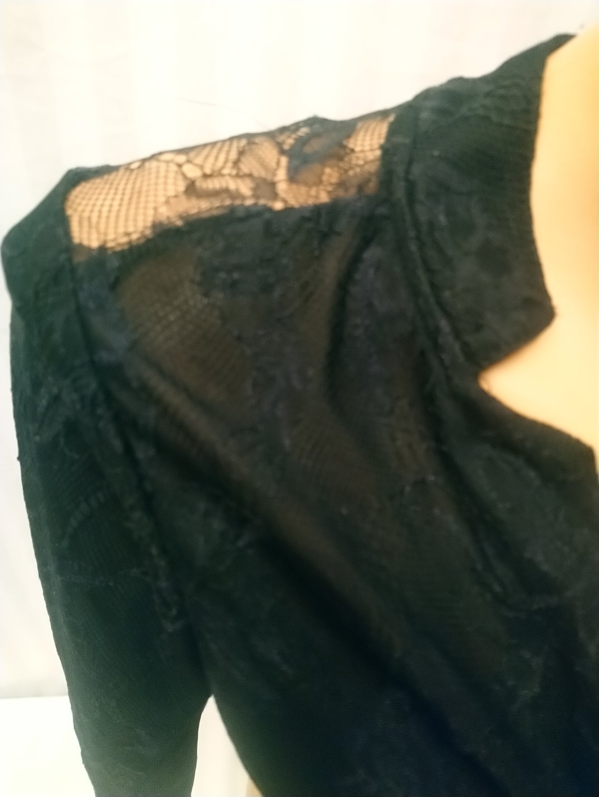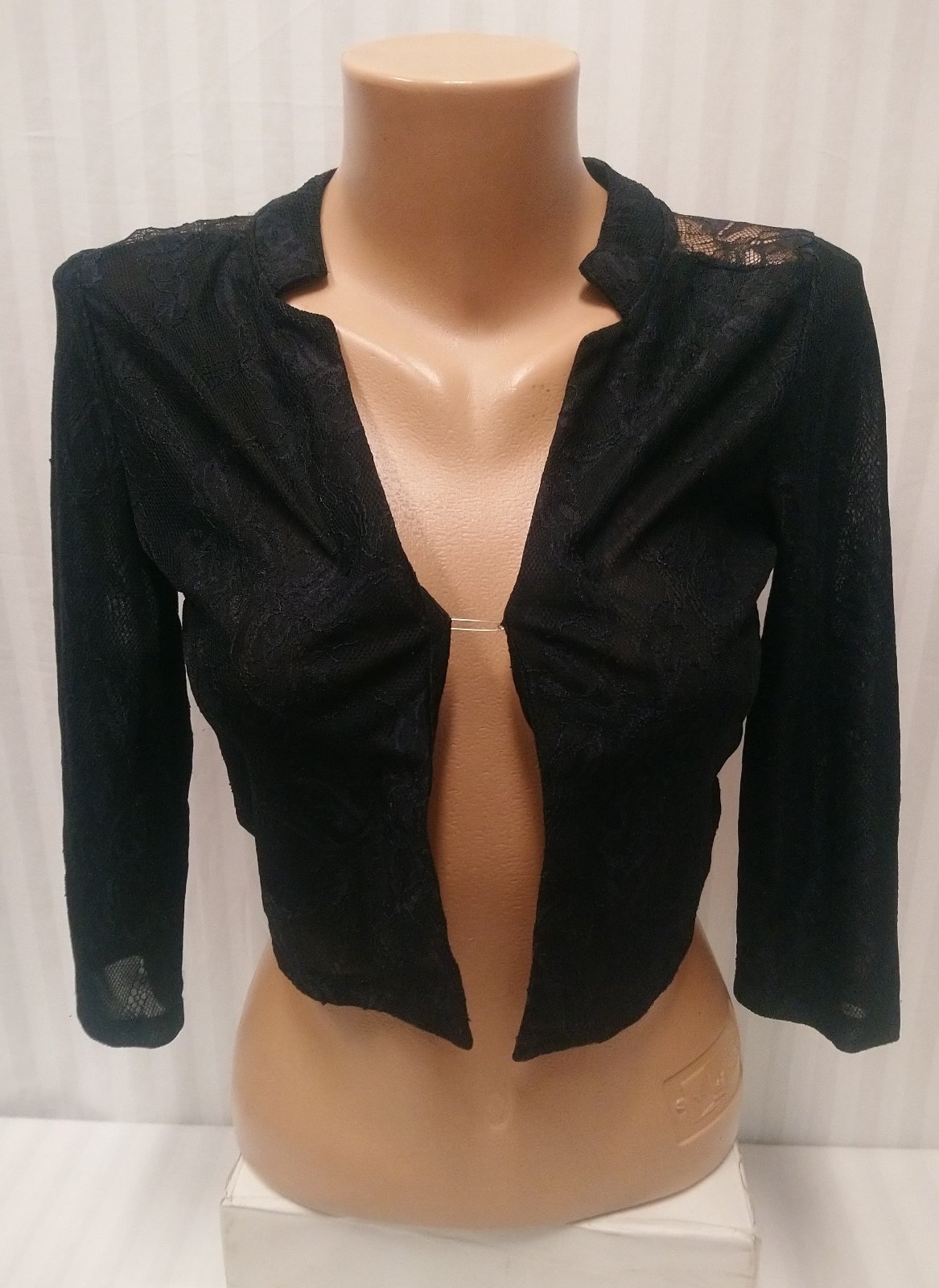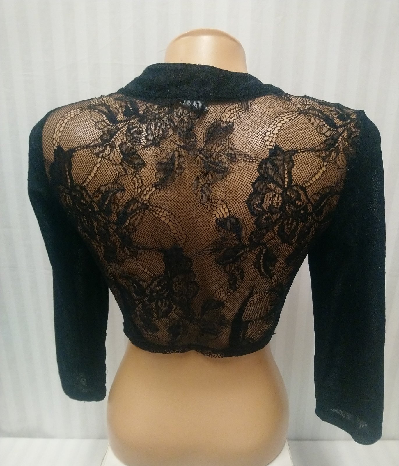 dámske čierne čipkované bolerko s priesvitným vzorom, vpredu nepresvitá lebo je podšité látkou, krátke do pásu, 3/4 rukáv,