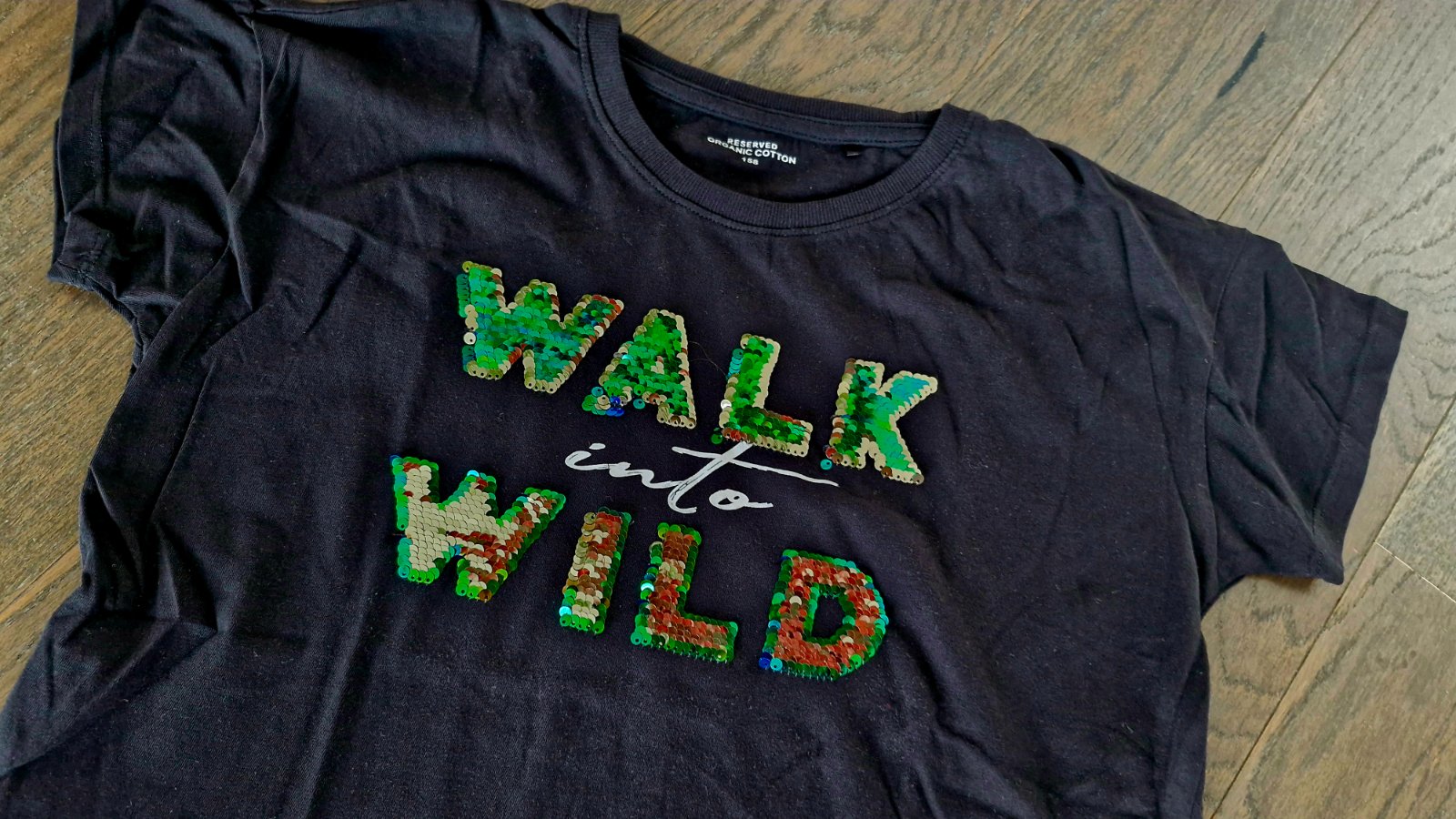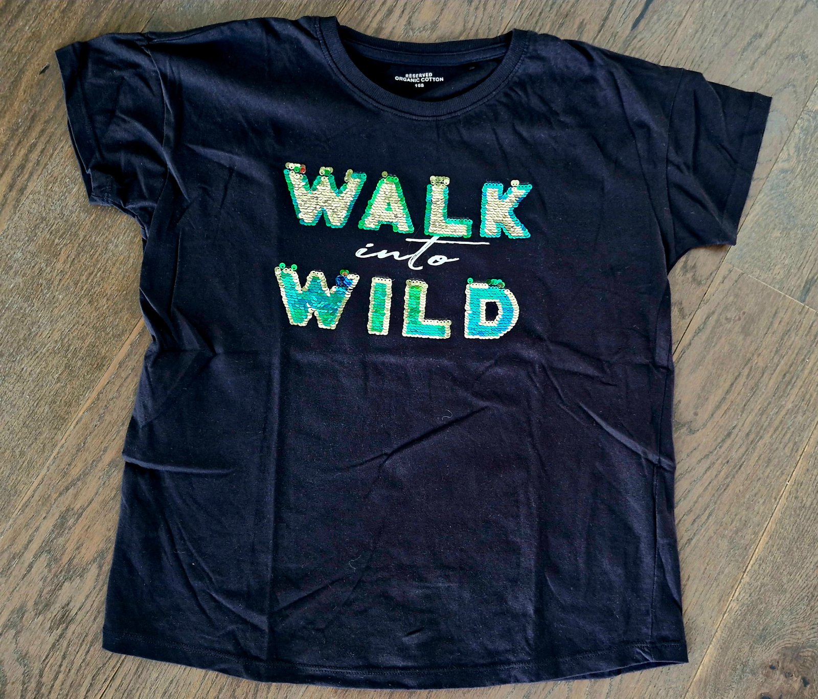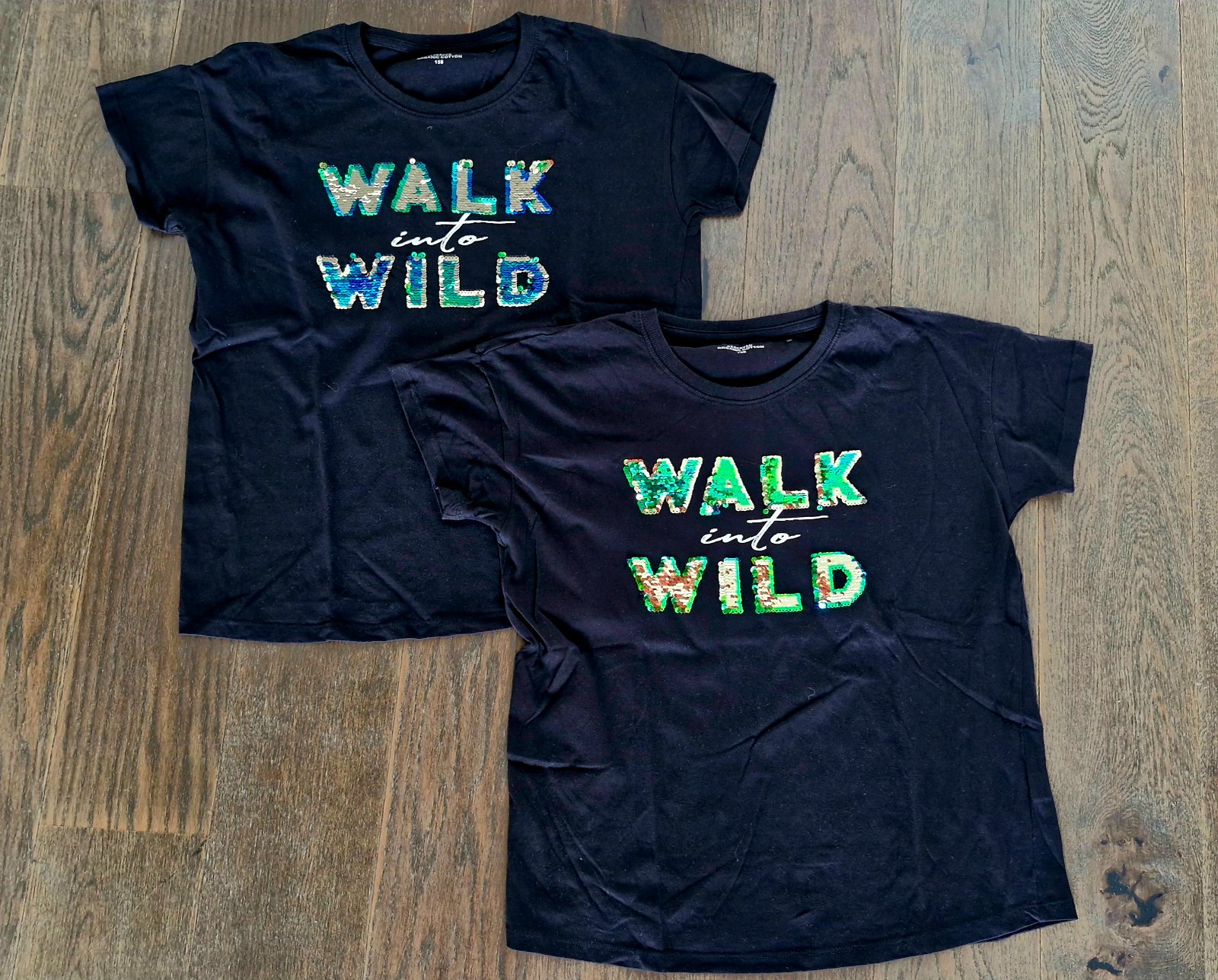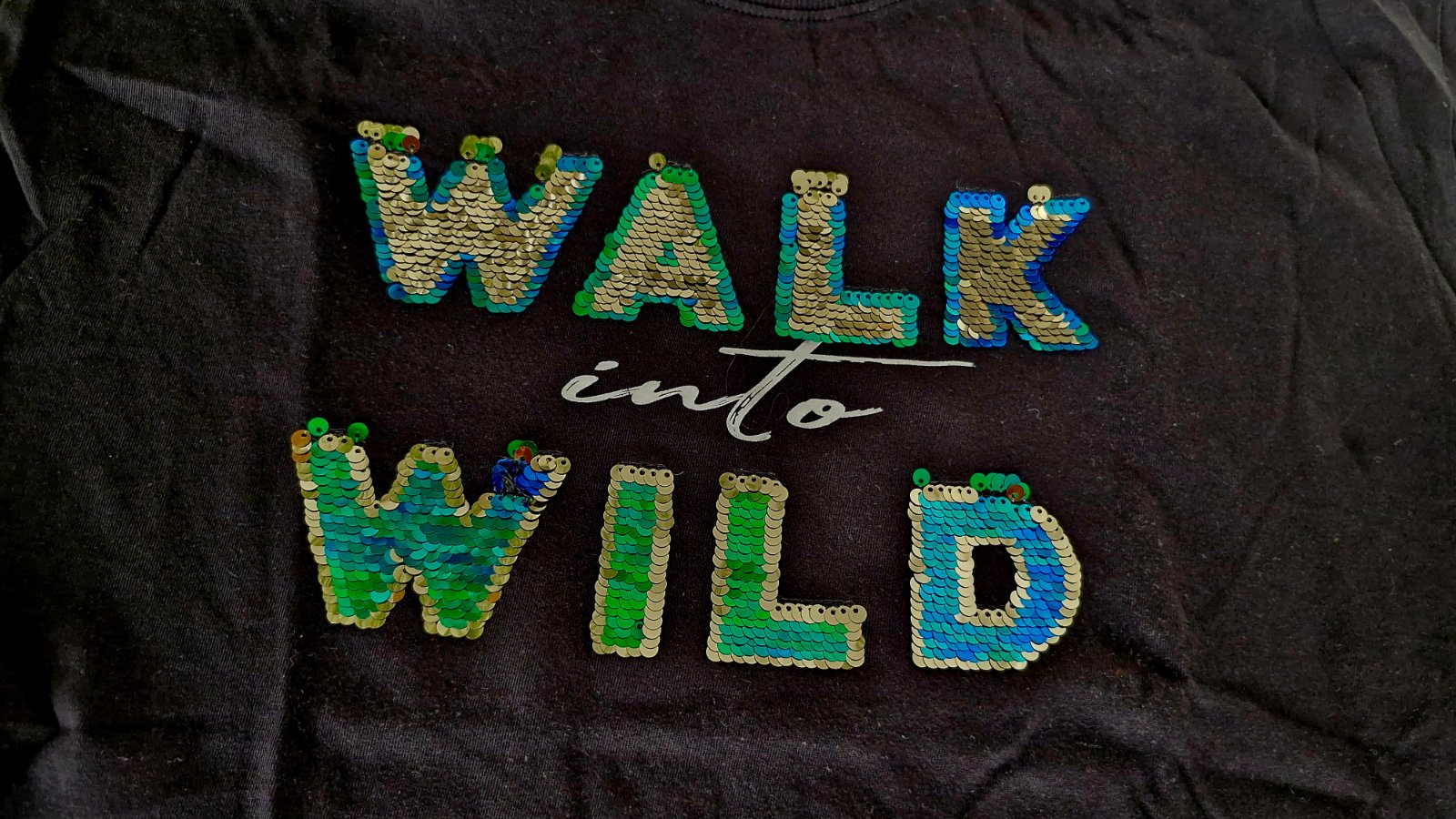 Perfektne univerzalne tricko s pretacacimi flitrami s napisom walk into wild top stav,cena LEN 5eur je fixna,odporucam
