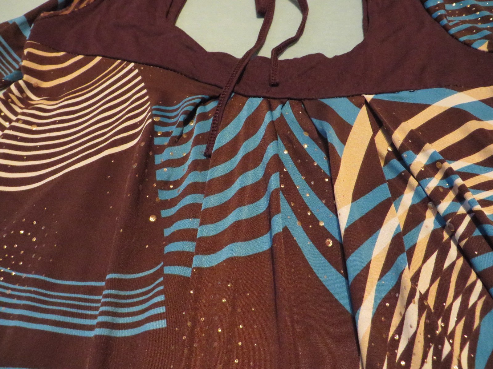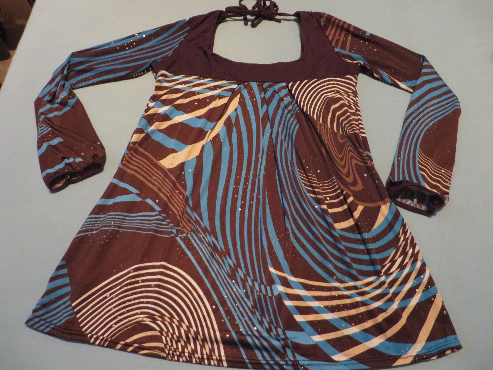 Predám dámsku tuniku v hnedo - modro - bielej farbe s dlhým rukávom. Strih je do "A", takže pekne zakryje to, čo nechcete, aby bolo vidno :). Príjemná na nosenie, drobné trblietavé bodky, viď foto oživujú vzhľad.