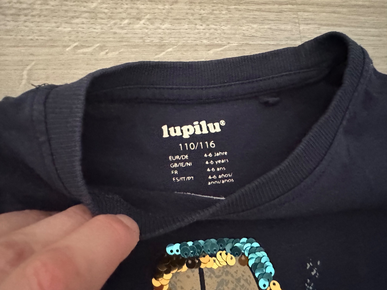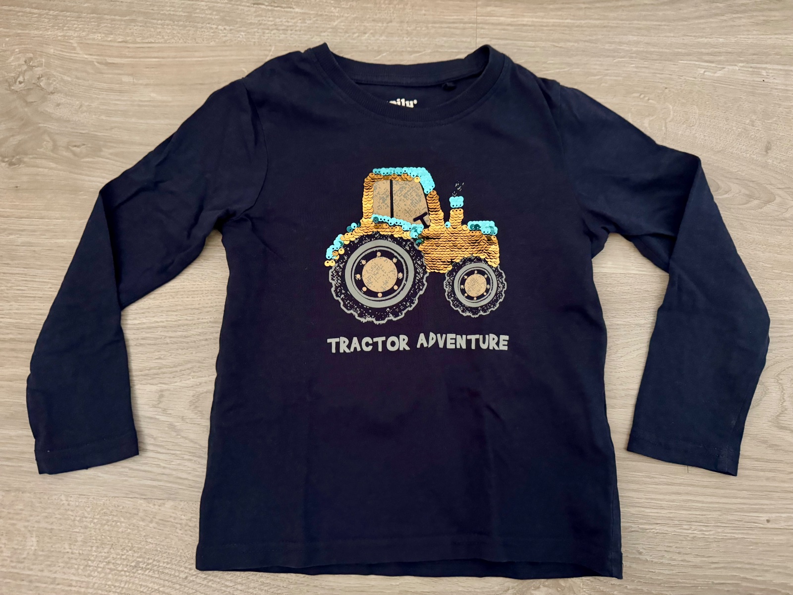 Tričko s traktorom v flitrami lupilu 110/116 nosené, ale v peknom stave
