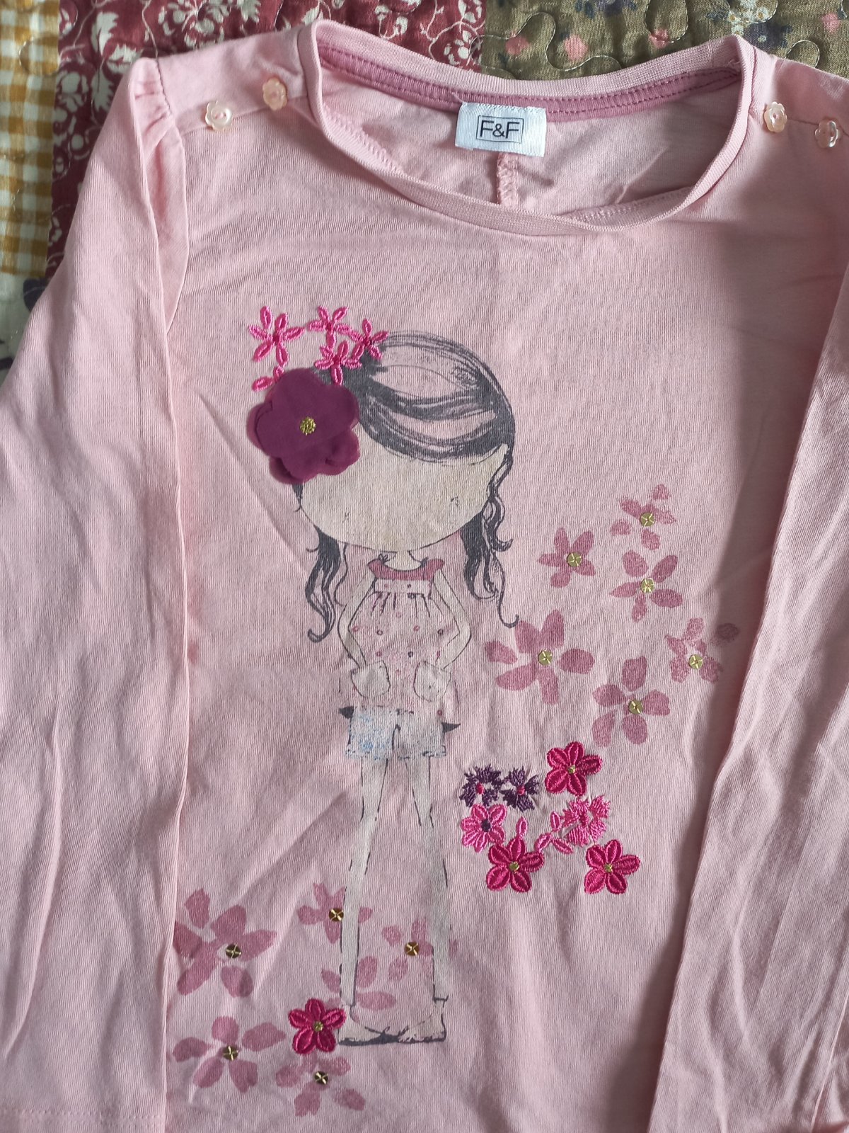 Pekné tričko s jemným dievcenskym vzorom. Obrázok je už mierne zošúchaný. Veľkosť 110.