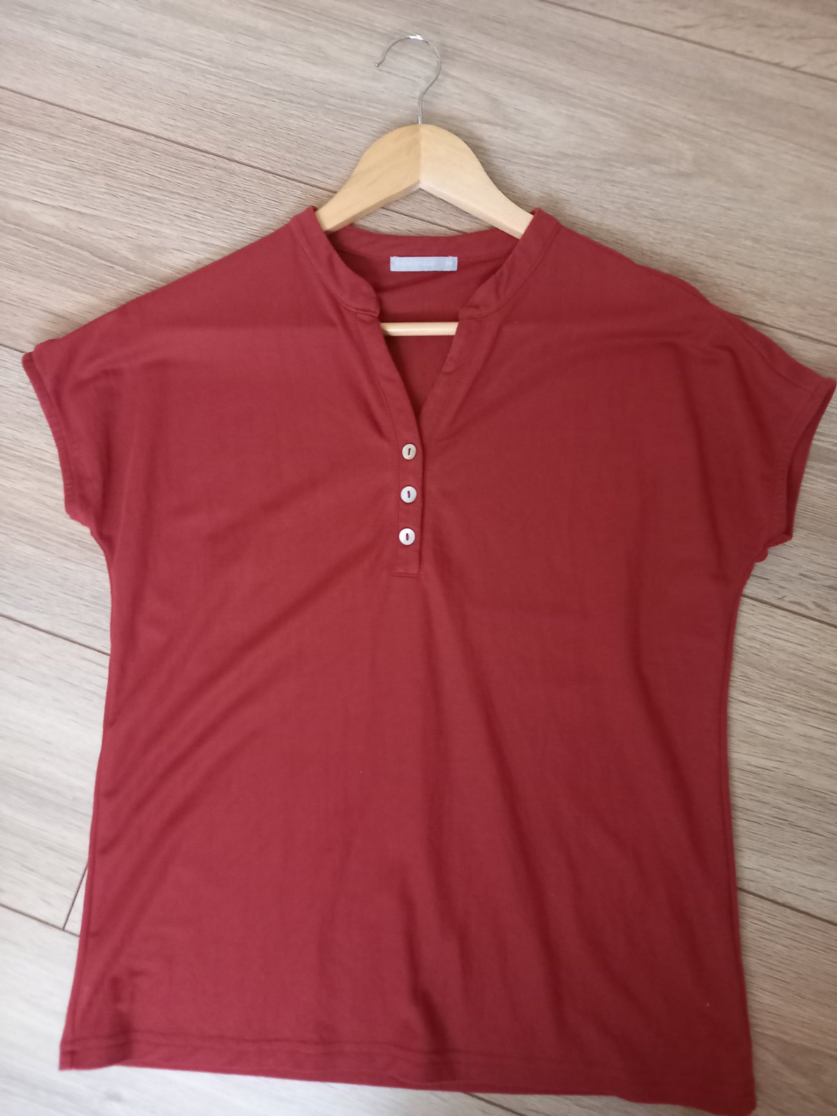 Pekny top/ tricko s vystrihom do V, velkost uvedena M ale sadne ako S-ko. Rukavy 59 cm, dlzka 37 cm, pas 35 cm.