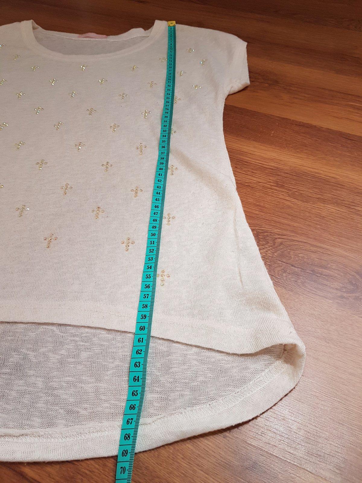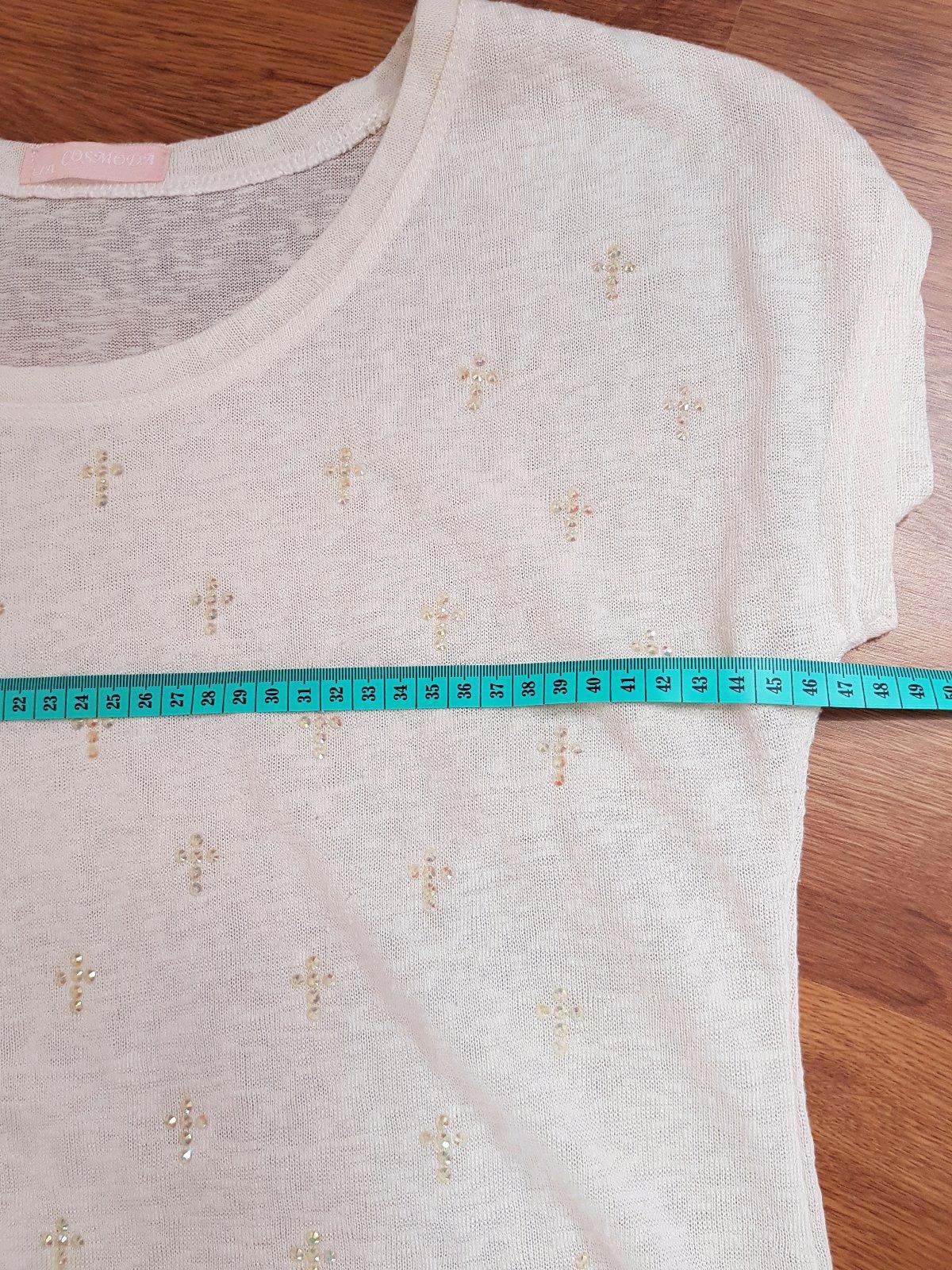 Materiál príjemný svetríkový lahučký, farba slonovej kosti, so štrasovými kamienkami v tvare krížikov. Sedí na Mko