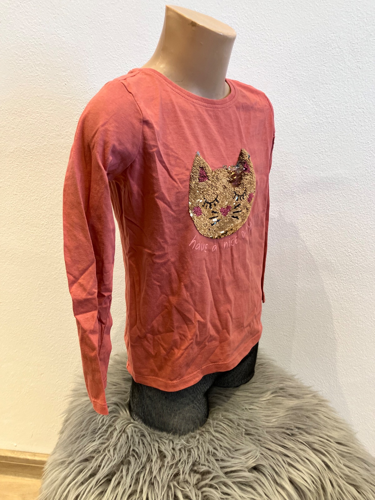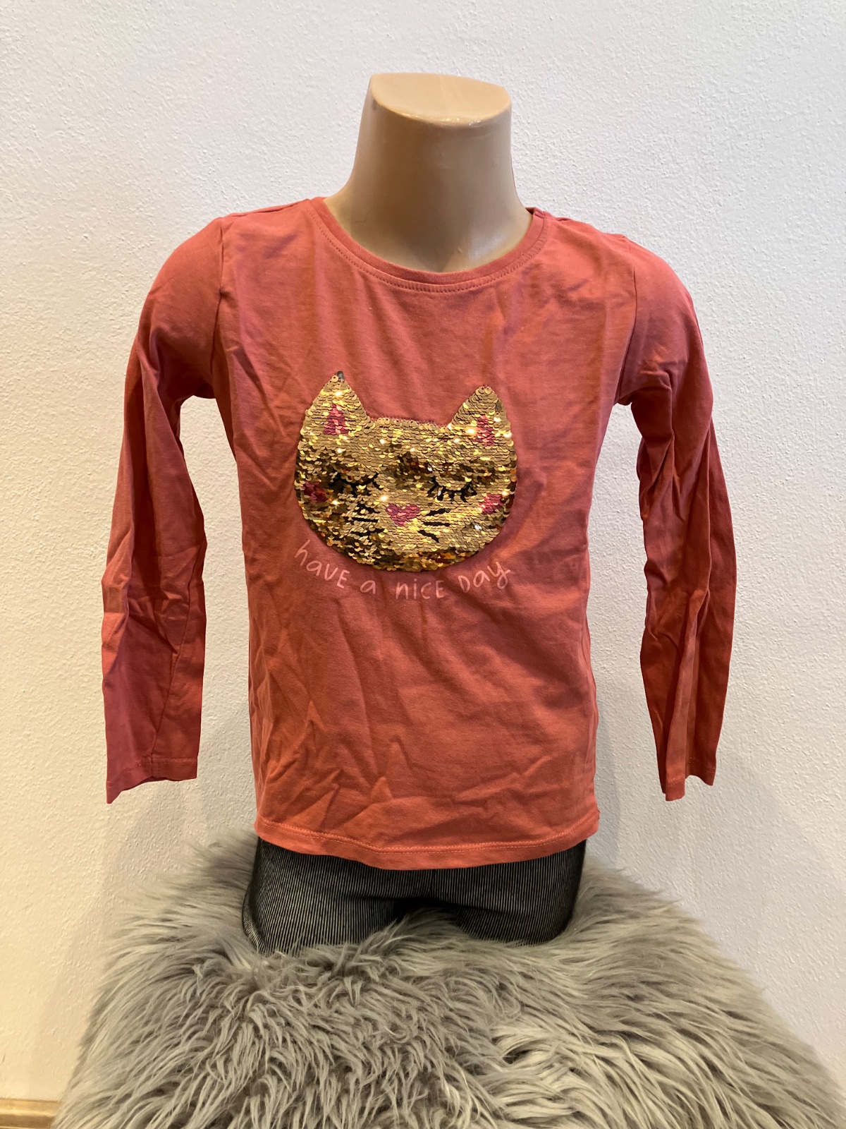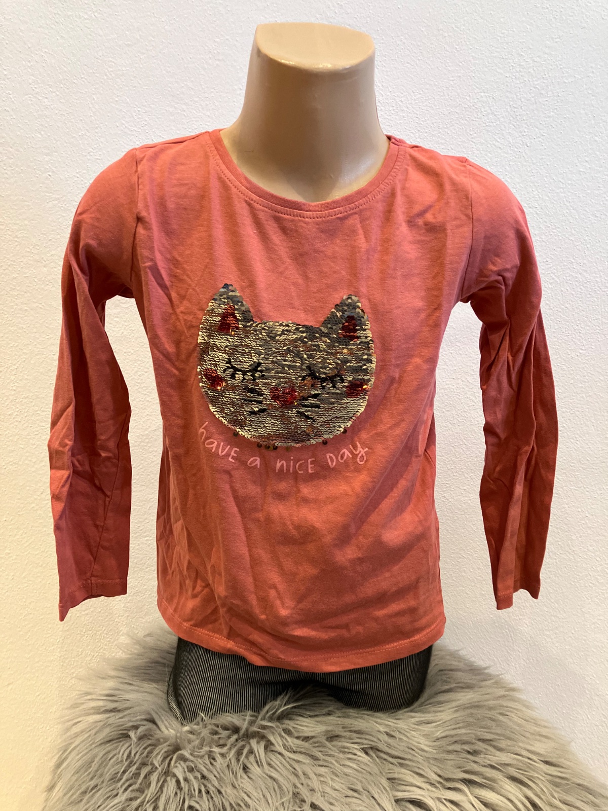Dievčenské tričko s dlhým rukávom a flitrami, vzor mačička, farba lososová, okrúhly výstrih, elastické, materiál 100%bavlna.