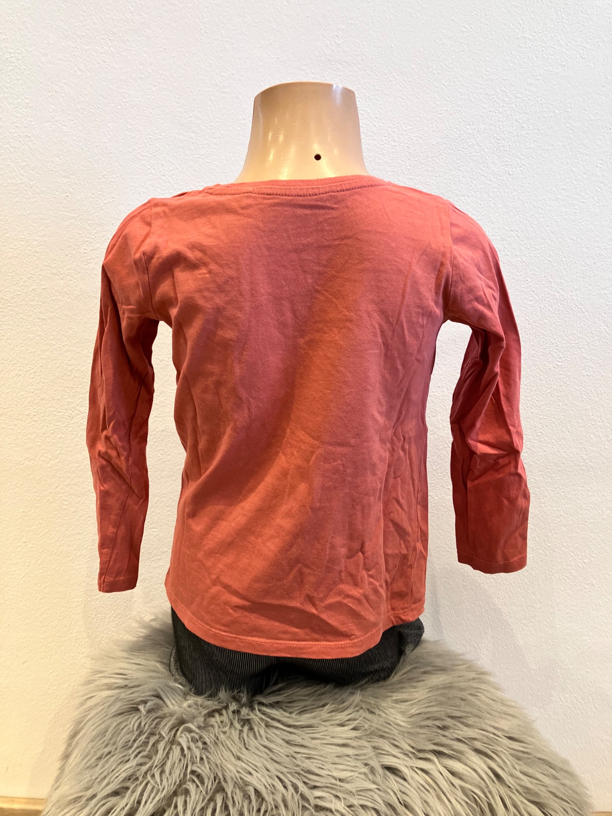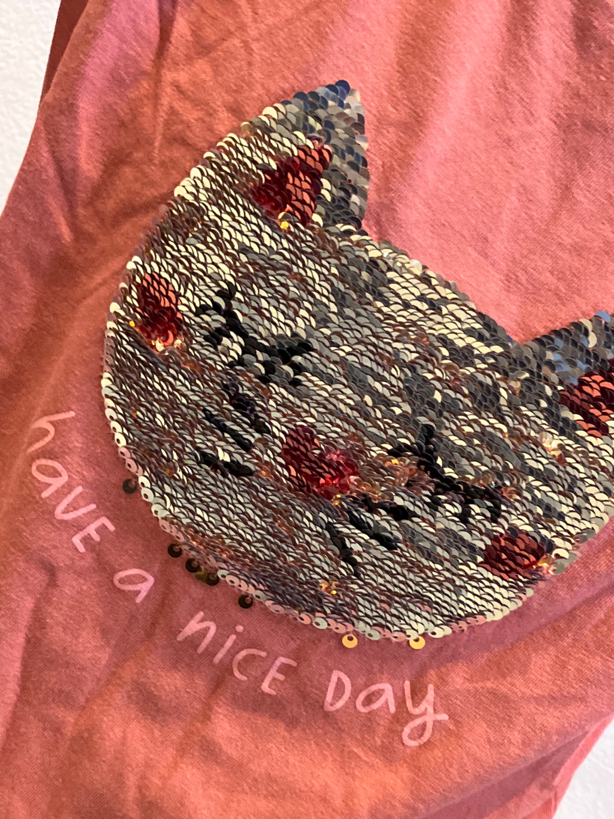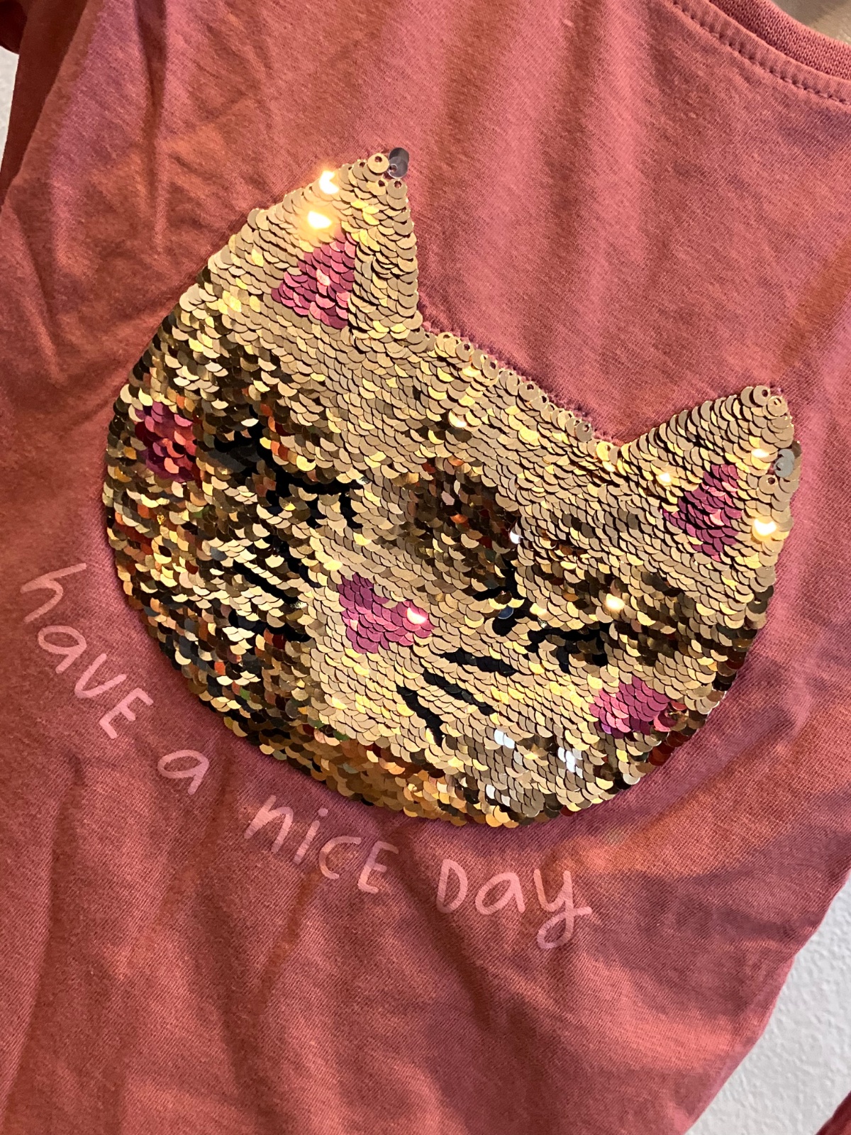 Dievčenské tričko s dlhým rukávom a flitrami, vzor mačička, farba lososová, okrúhly výstrih, elastické, materiál 100%bavlna.