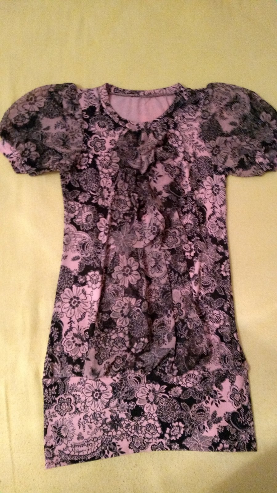 Elastická tunika, ružovo čierna farba, vpredu dlhý volán. Podšitá, rukávy priesvitné