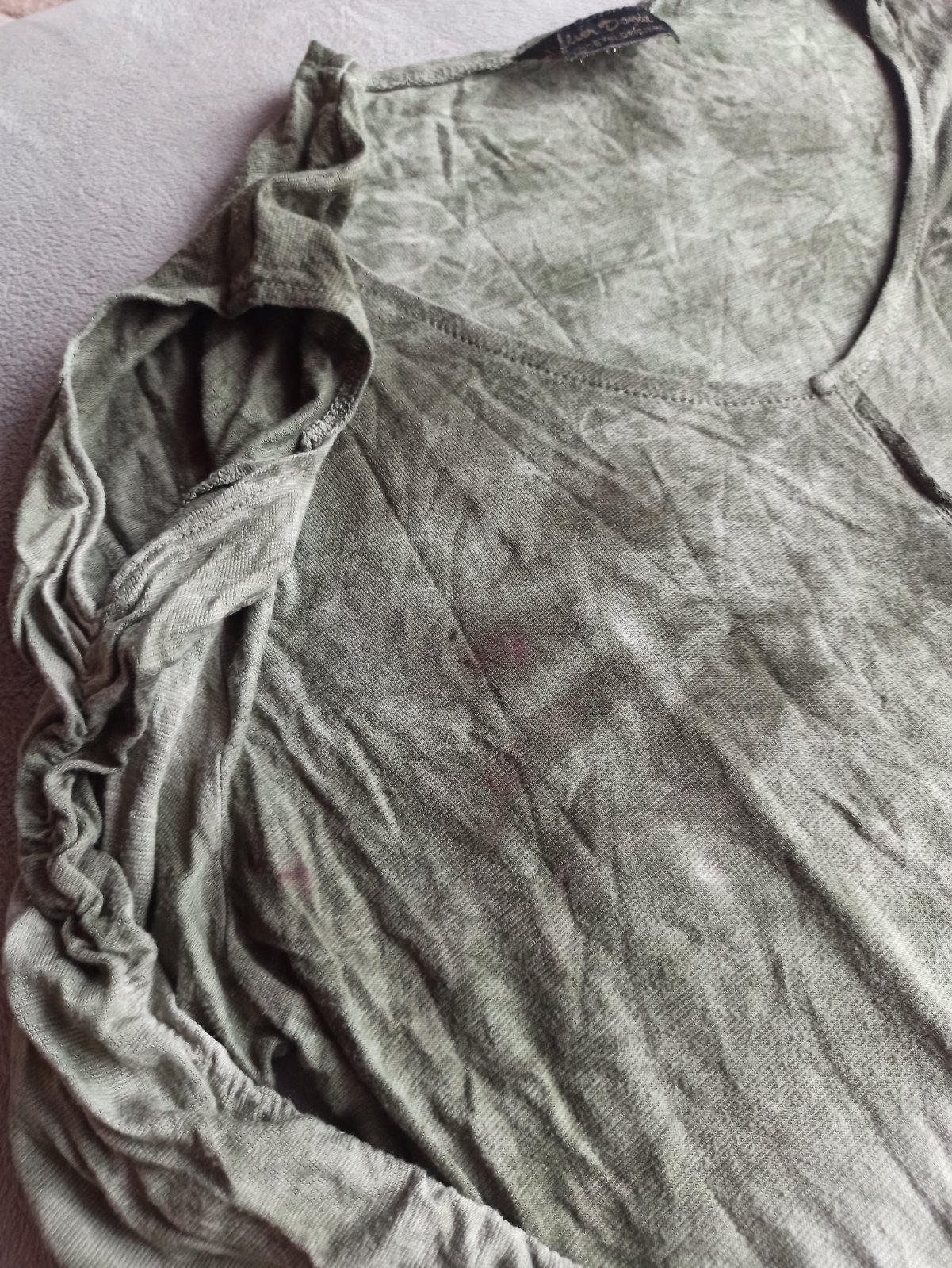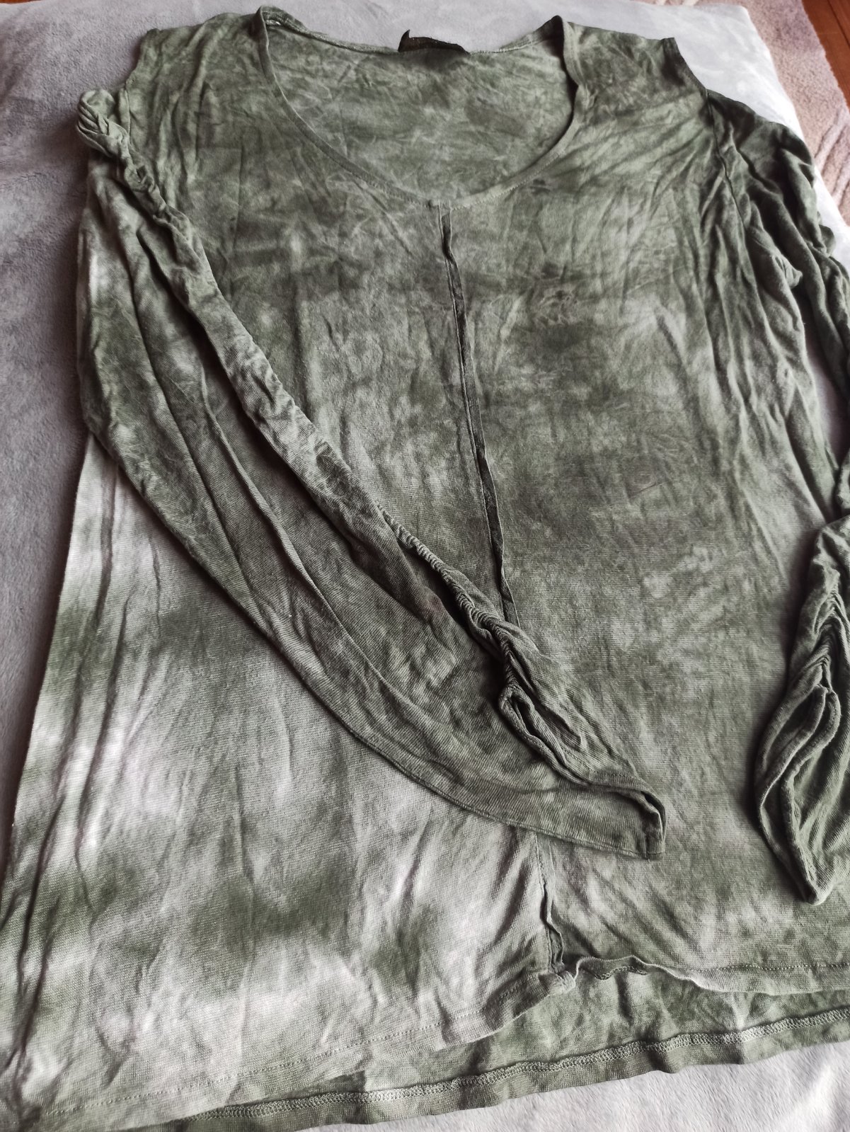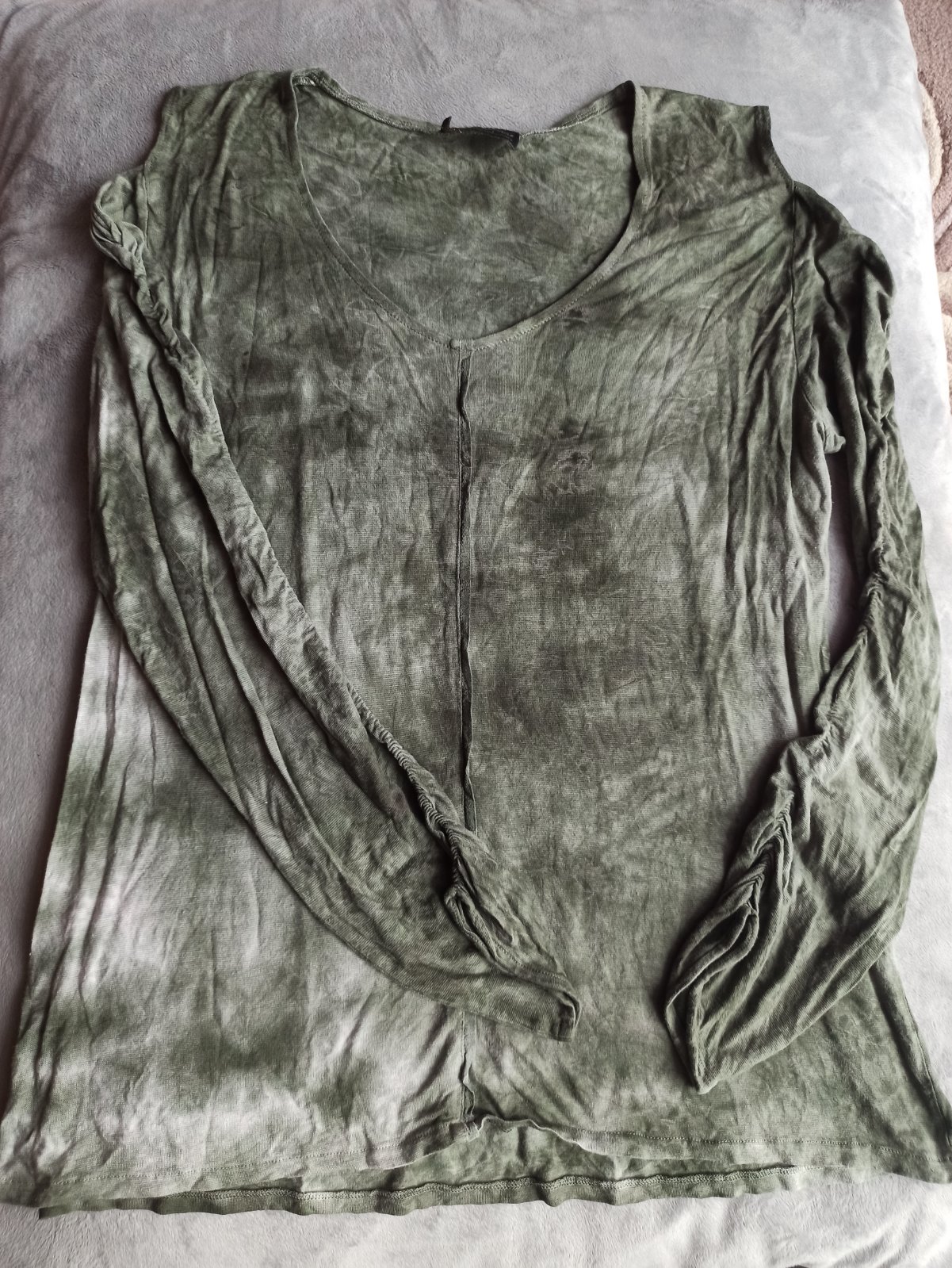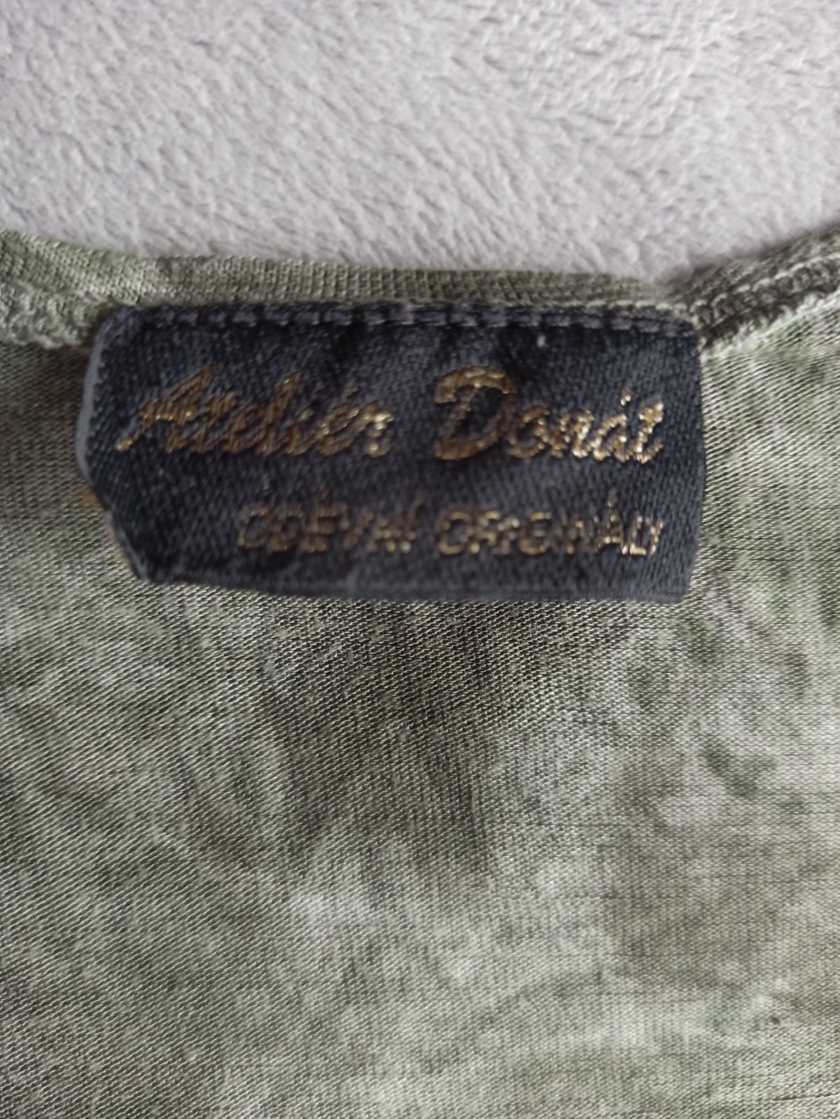 Originálny top s prestrihmi na ramenách a zberanými dlhými rukávmi, vyrobený v umeleckom ateliéri Ateliér Donát - oděvní originály. 90% viskóza, 10% polyamid. Veľkosť odhadujem na L/XL. Dĺžka 68cm, šírka 52cm, je elastický. Rukáv od podpazušia 55cm.