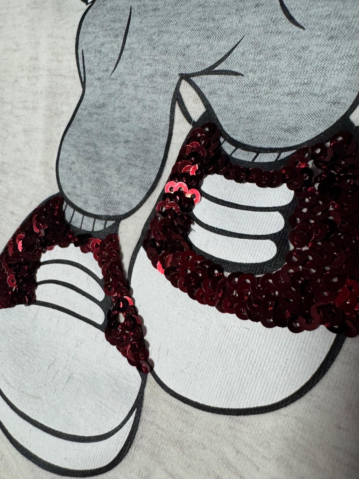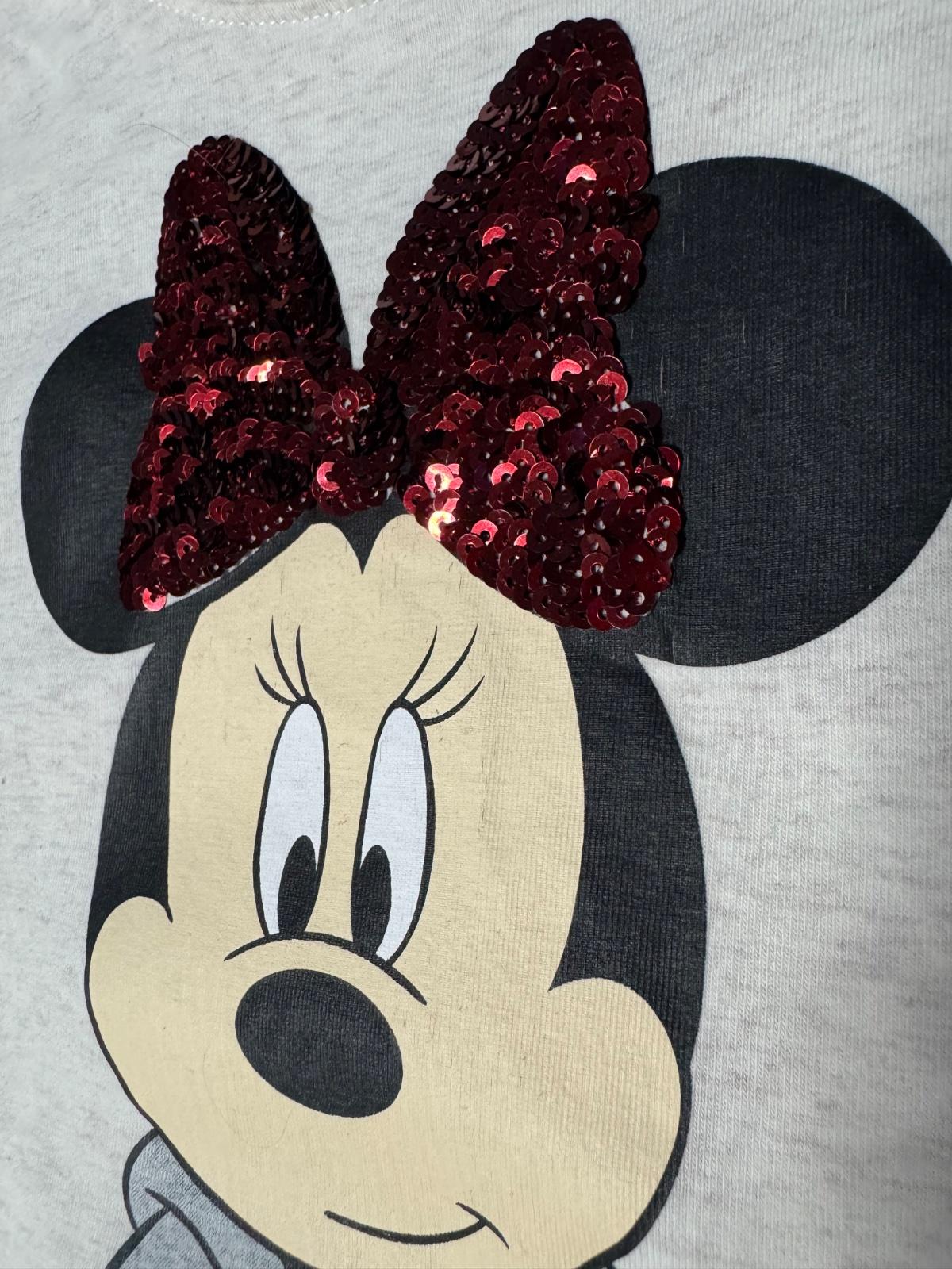 Krásne tričko s Minnie, zdobené s flitrami. Super stav, akurát na spodku malý fliačik- vid foto. Veľkosť 158/164. V prípade záujmu rada premeriam.