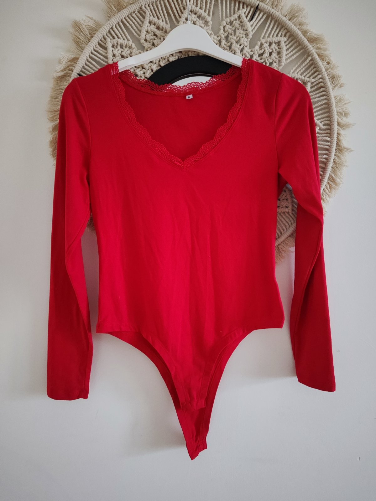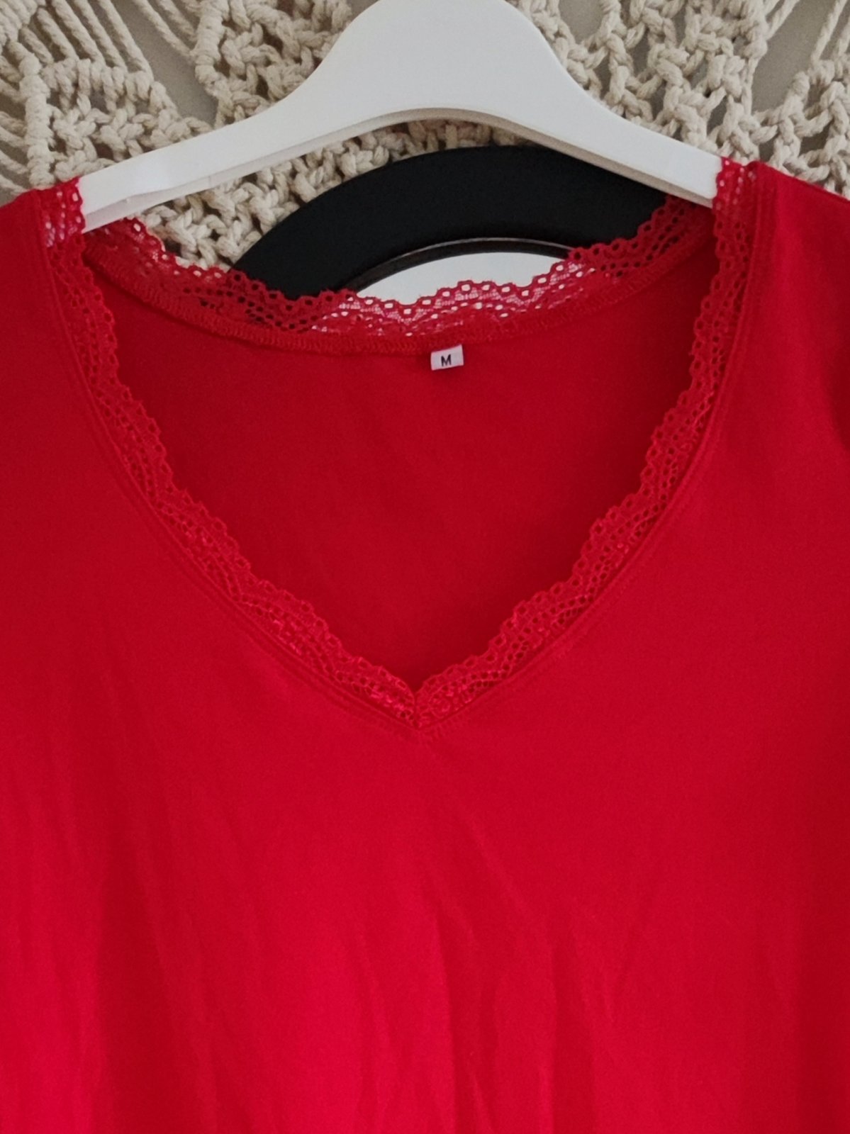 Pekné červené tričko s dlhým rukávom,pár krát oblečené,zaújimavý vačší výstrih a pekná nepoškodená aplikacia.