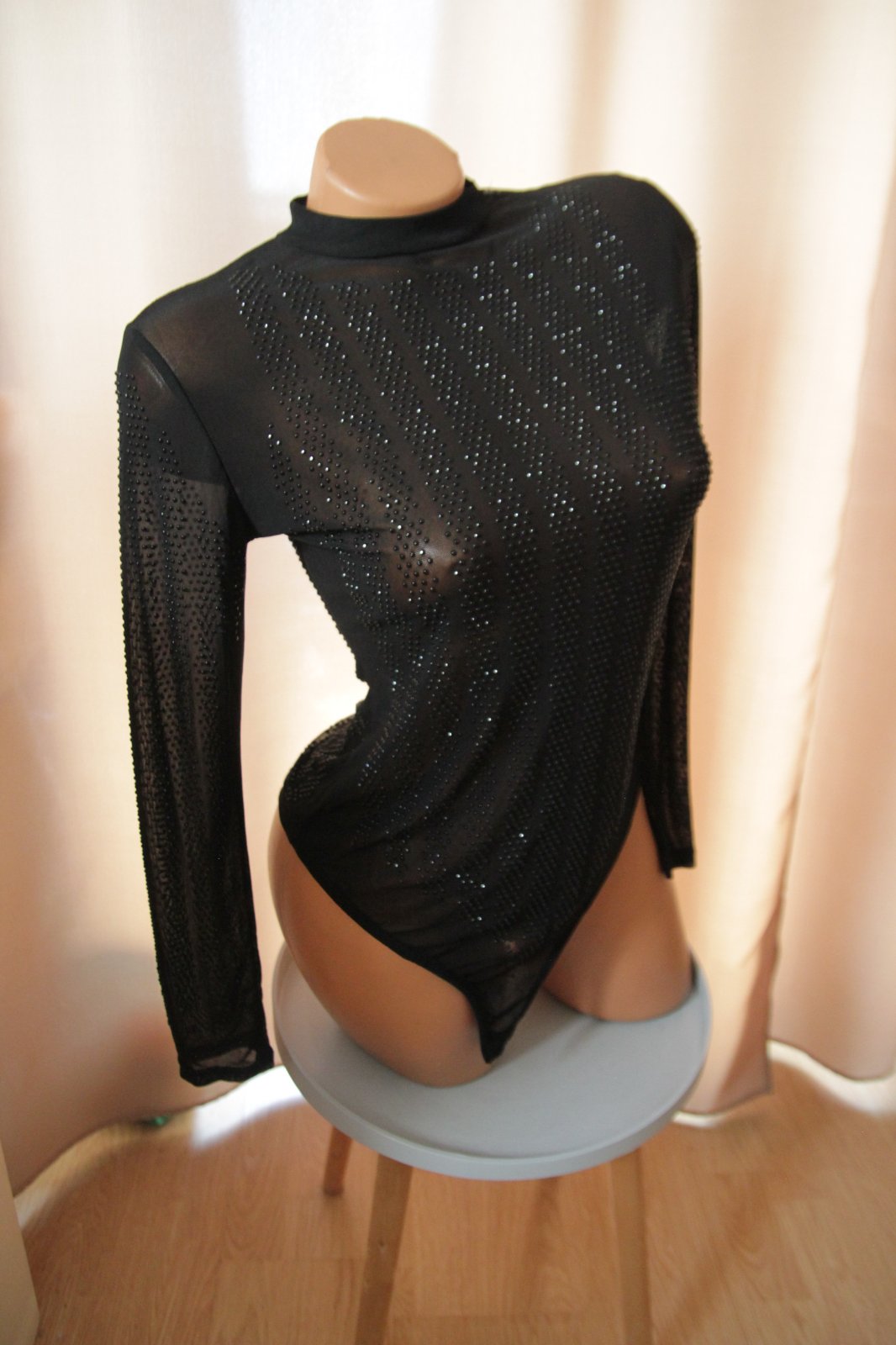 Čierny sieťovaný top s lesklými kamienkami, veľkosť M/L.