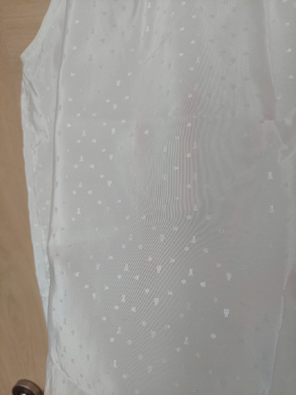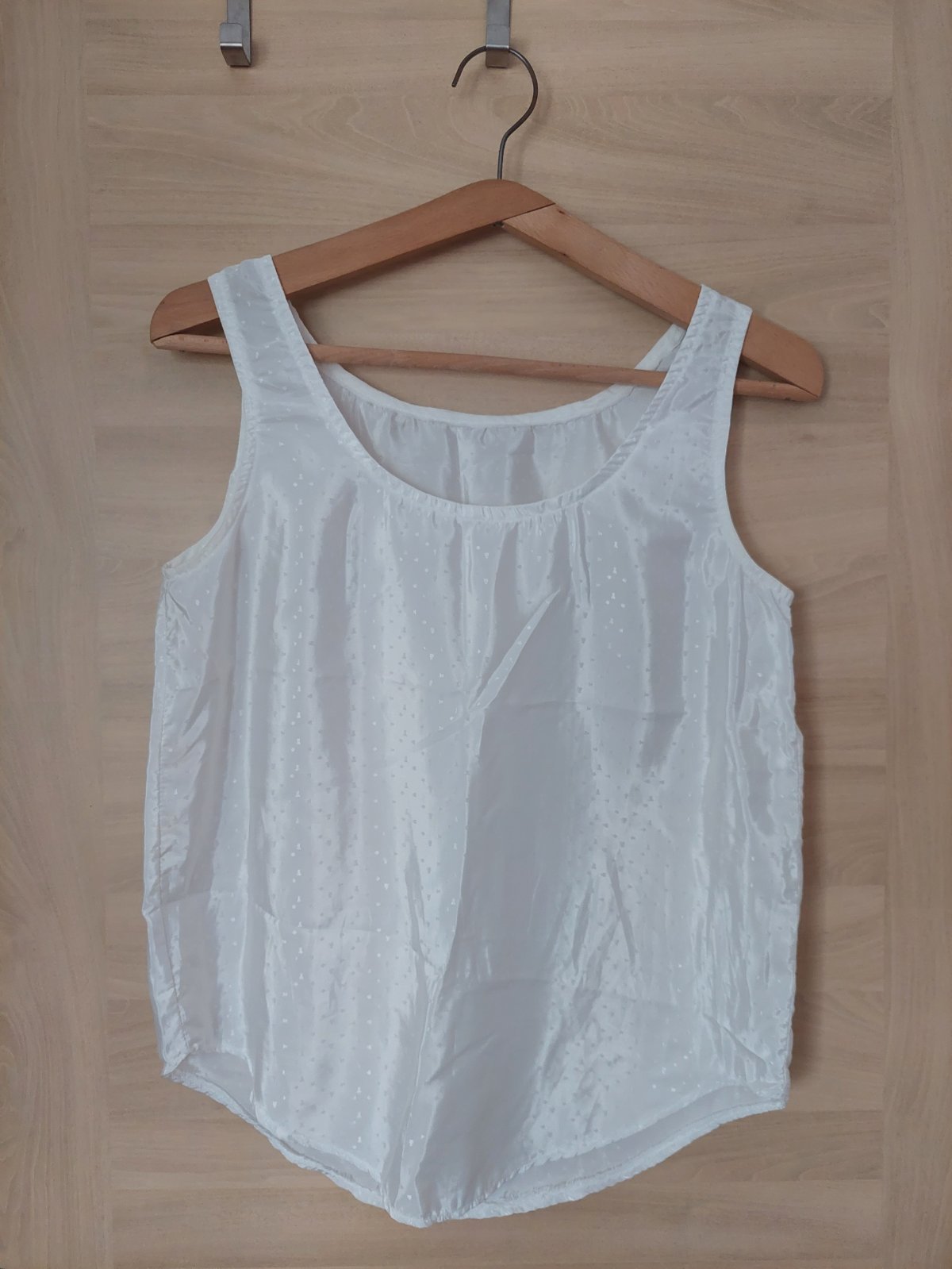 Biele satenove tielko bez rukavov s jemnym vzorom. Velmi zachovale. Kvalitna latka. Velkost cca M, ale oblecie ju aj L.