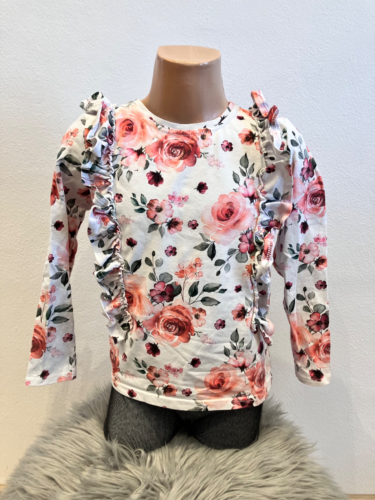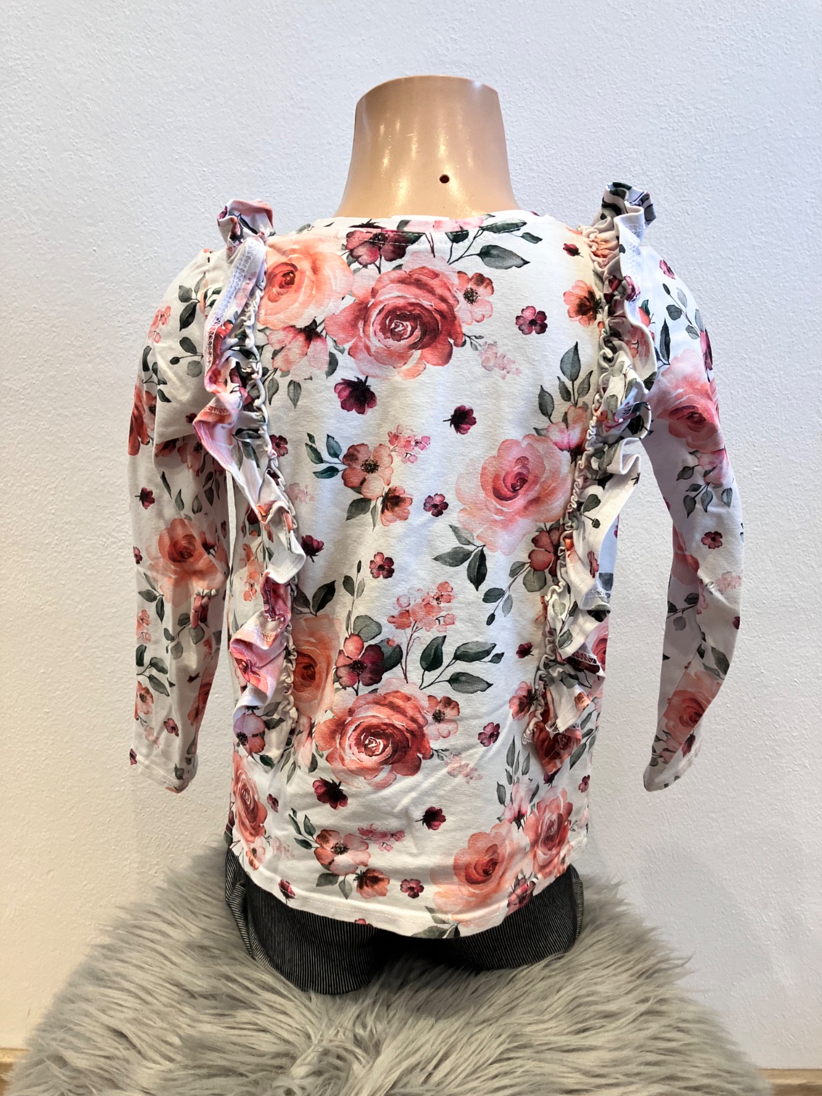 Dievčenské tričko s dlhým rukávom, kvetmi a volánmi, elastické, okrúhly výstrih.