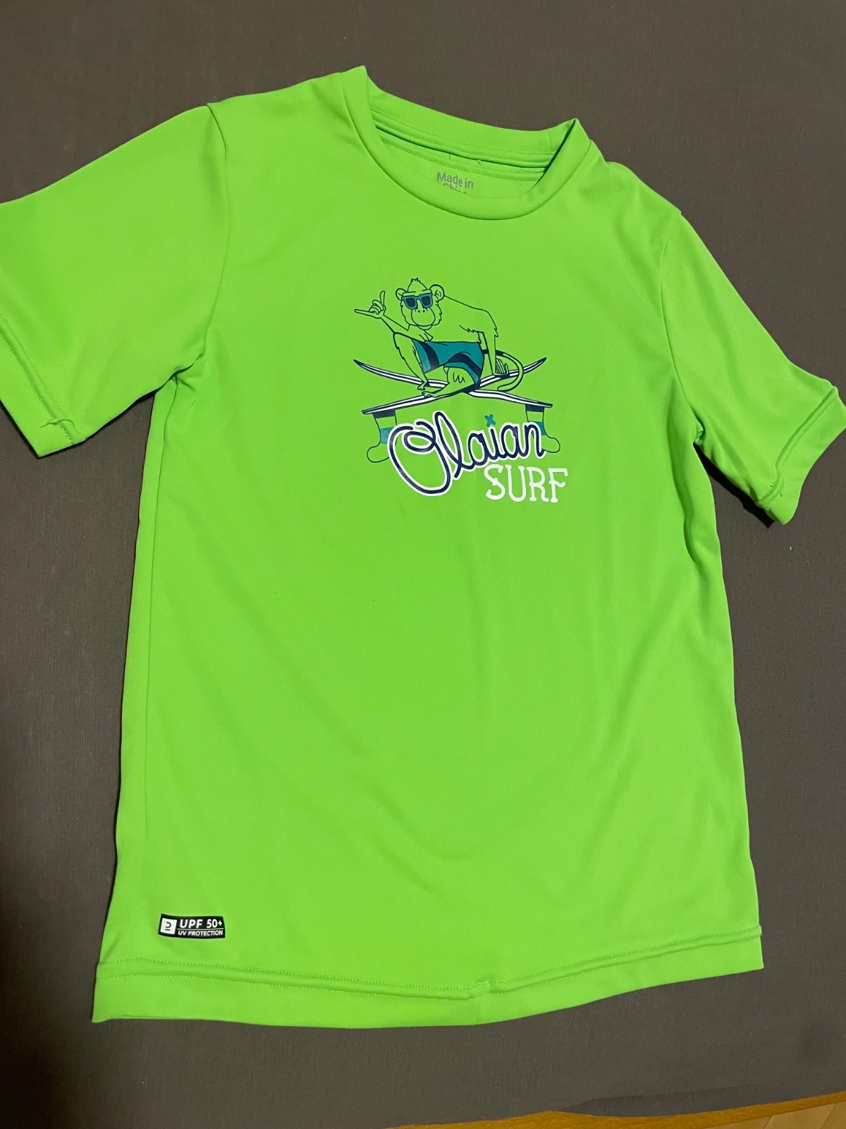 Výrazne zelené tričko vhodné ako ochrana pred slnkom i na bežné nosenie. Minimálne použitie, bez poškodenia. Rychloschnúci materiál. Veľkosť nie je uvedená, šírka pod pazuchami 33 cm x2, dĺžka chrbát 48 cm. Pružné.
